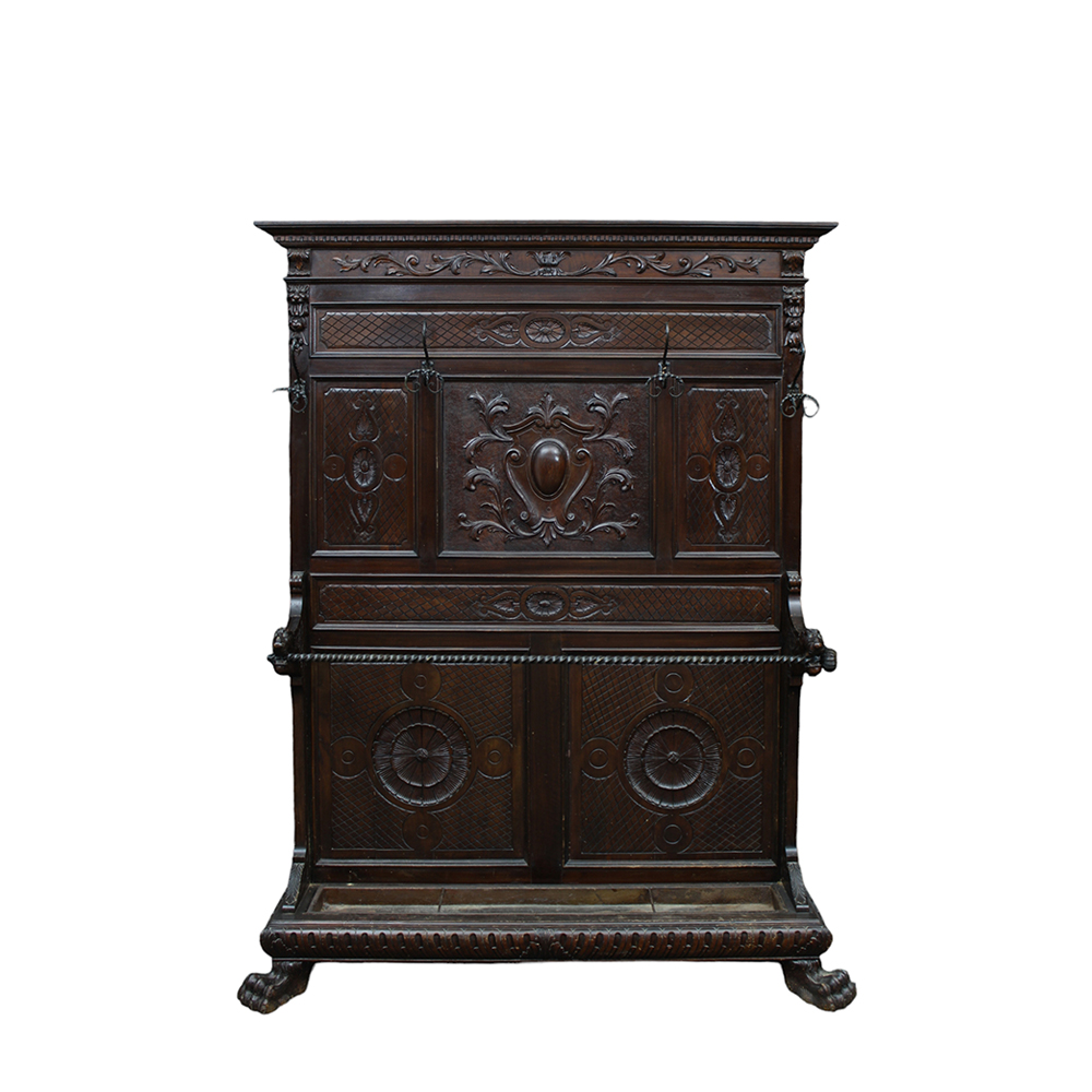 ATTACCAPANNI CON BASTONIERA in legno di noce riccamente scolpito di gusto rinascimentale Sicilia fine 800 h cm 202 x 155 x 35