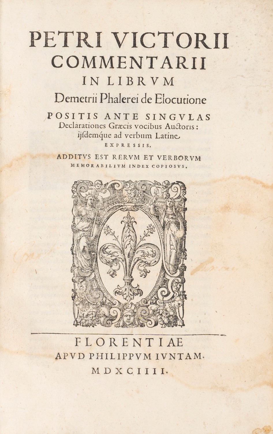 Firenze, Filippo Giunta, 1594. In 2°. Marca tipografica al frontespizio e al colophon, testo in greco e latino, lieve gora d'acqua al frontespizio, legatura di epoca successiva in mezza pergamena e carta marmorizzata, titoli entro due tasselli al dorso, lievi difetti. Firma di appartenenza evanescente al frontespizio, note manoscritte al verso dell'ultima carte, tassello cartaceo di appartenenza al contropiatto. Firenze, Filippo Giunta, 1594. In 2°. Marca tipografica al frontespizio e al colophon, testo in greco e latino, lieve gora d'acqua al frontespizio, legatura di epoca successiva in mezza pergamena e carta marmorizzata, titoli entro due tasselli al dorso, lievi difetti. Firma di appartenenza evanescente al frontespizio, note manoscritte al verso dell'ultima carte, tassello cartaceo di appartenenza al contropiatto.