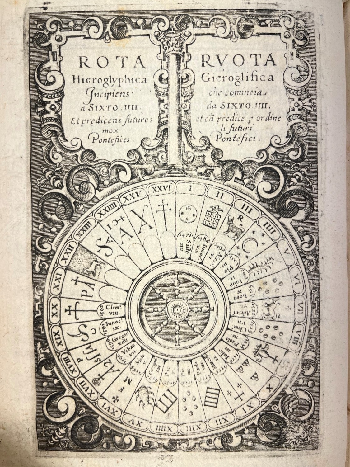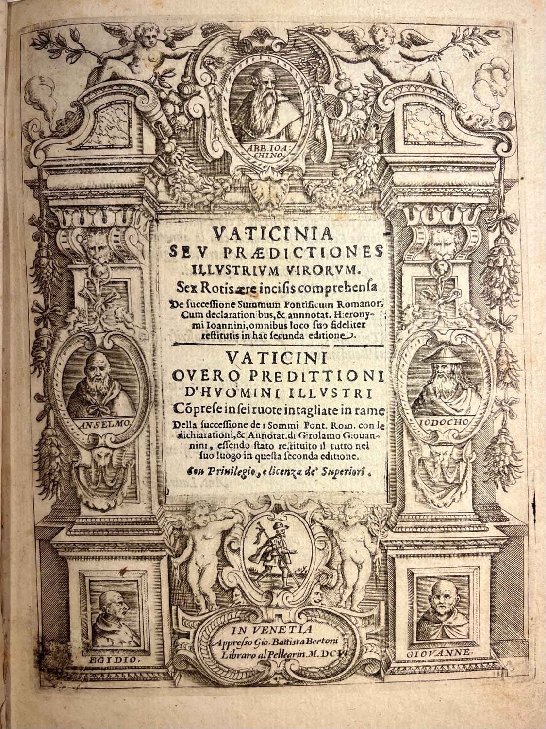 Venezia, Giovanni Battista Bertoni, 1605. In 8°. Legatura contemporanea in cartone liscio, pp. 59, bel frontespizio architettonico inciso in rame con i vaticinatori in medaglioni (Gioacchino da Fiore, a cui l'opera fu e viene ancora talvolta ascritta; Anselmo, vescovo di Marsico; Giodoncho Palmerio; Giovanni abate; frate Egidio Polacco) e alla base marca editoriale (pellegrino, con bordone e mantello svolazzante), iniziali xilografiche, testatine e finali e sei ruote profetiche incise in rame a piena pagina da Girolamo Porro nel 1589. Testo bilingue in latino (in tondo) e italiano (in corsivo).