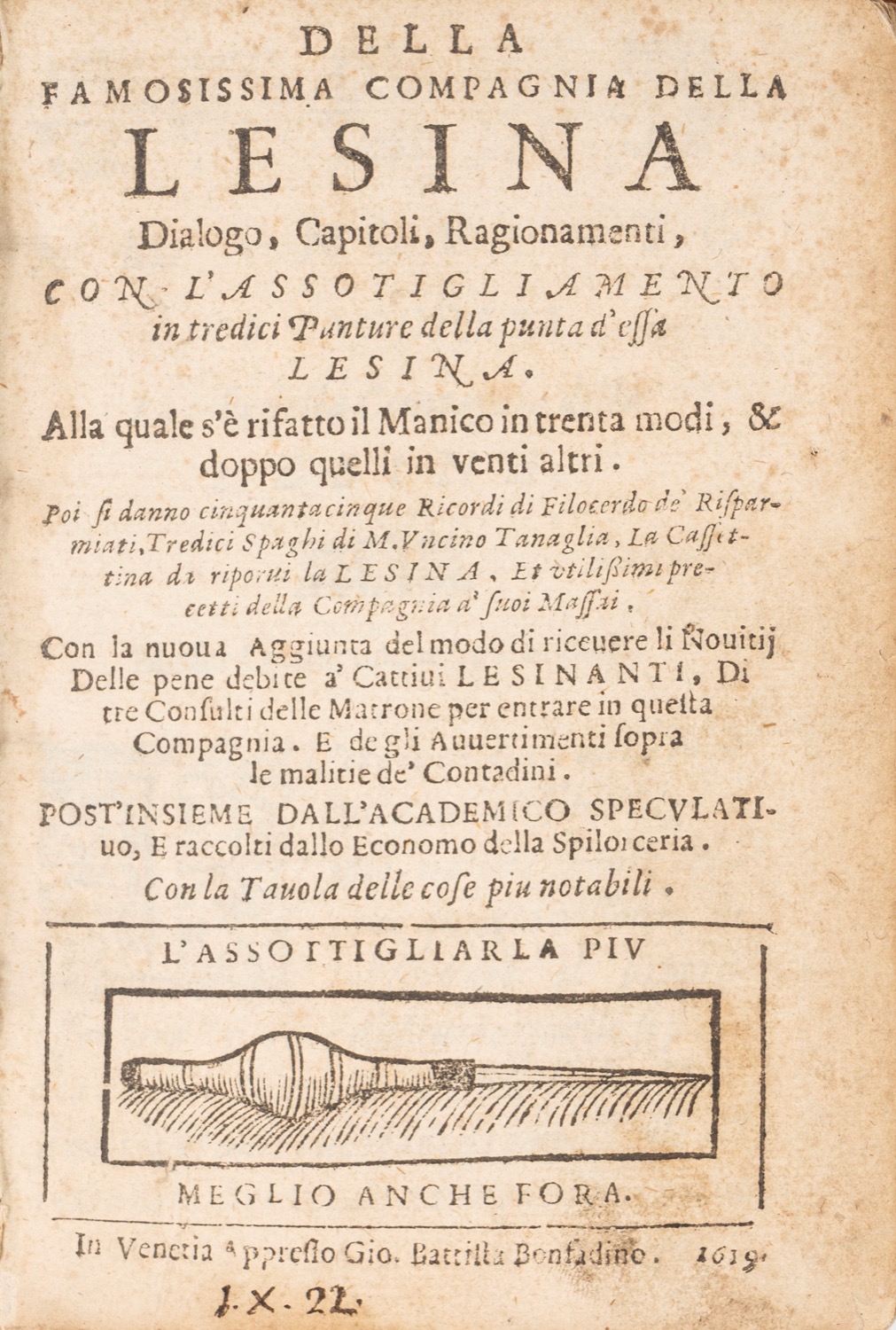 Venezia, appresso Gio. Battista Bonfadino, 1619. In 8°. Vignetta al frontespizio, bruniture e arrossature. Legato con. Continuatione de gl'ordini della Compagnia della Lesina. Vignetta al frontespizio, bruniture e arrossature. Legatura del sec. XVIII in mezza pelle e cartone, con titolo su tassello rosso al dorso, sciupato con perdite.Venezia, appresso Gio. Battista Bonfadino, 1619. In 8°. Vignetta al frontespizio, bruniture e arrossature. Legato con. Continuatione de gl'ordini della Compagnia della Lesina. Vignetta al frontespizio, bruniture e arrossature. Legatura del sec. XVIII in mezza pelle e cartone, con titolo su tassello rosso al dorso, sciupato con perdite.