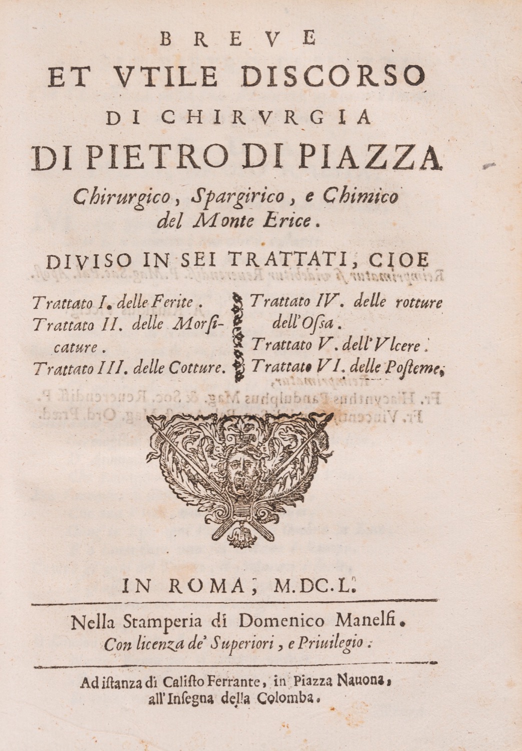 Roma, nella Stamperia di Domenico Manelfi, 1650. In-4°, legatura moderna in mezza tela con carta marmorizzata ai piatti, titolo in oro al dorso; 3 opere rilegate insieme; pp. [8], 168; [4], 59, [1]; [4], 79, [1]. Rara raccolta di tre opere legate insieme, tra cui un trattato di chirurgia e uno sull'opera del medico, entrambi di Tarduccio Salvi, e un'altra opera di chirurgia, di Pietro Di Piazza. Titoli delle altre opere: [2.]: Salvi, Tarduccio. Il ministro del medico trattato breve di Tarduccio Salvi da Macerata chirurgo nuovamente ristampato, [...] diviso in sei parti. Nella I. si discore della flebotomia [...] Nella VI. delli cauterij attuali. In Roma: per Domenico Manelfi, 1650. [3.]: Di Piazza Pietro, Breve et utile discorso di chirurgia. Ogni opera ha il proprio frontespizio, con una piccola incisione xilografica. Presenza di alcune iniziali e fregi xilografici. La seconda opera contiene 13 xilografie nel testo (alcune delle quali a piena pagina). Presenza di alcune rare macchie e lievi aloni d'umidità, ma nel complesso esemplare molto buono e completo.Roma, nella Stamperia di Domenico Manelfi, 1650. In-4°, legatura moderna in mezza tela con carta marmorizzata ai piatti, titolo in oro al dorso; 3 opere rilegate insieme; pp. [8], 168; [4], 59, [1]; [4], 79, [1]. Rara raccolta di tre opere legate insieme, tra cui un trattato di chirurgia e uno sull'opera del medico, entrambi di Tarduccio Salvi, e un'altra opera di chirurgia, di Pietro Di Piazza. Titoli delle altre opere: [2.]: Salvi, Tarduccio. Il ministro del medico trattato breve di Tarduccio Salvi da Macerata chirurgo nuovamente ristampato, [...] diviso in sei parti. Nella I. si discore della flebotomia [...] Nella VI. delli cauterij attuali. In Roma: per Domenico Manelfi, 1650. [3.]: Di Piazza Pietro, Breve et utile discorso di chirurgia. Ogni opera ha il proprio frontespizio, con una piccola incisione xilografica. Presenza di alcune iniziali e fregi xilografici. La seconda opera contiene 13 xilografie nel testo (alcune delle quali a piena pagina). Presenza di alcune rare macchie e lievi aloni d'umidità, ma nel complesso esemplare molto buono e completo.