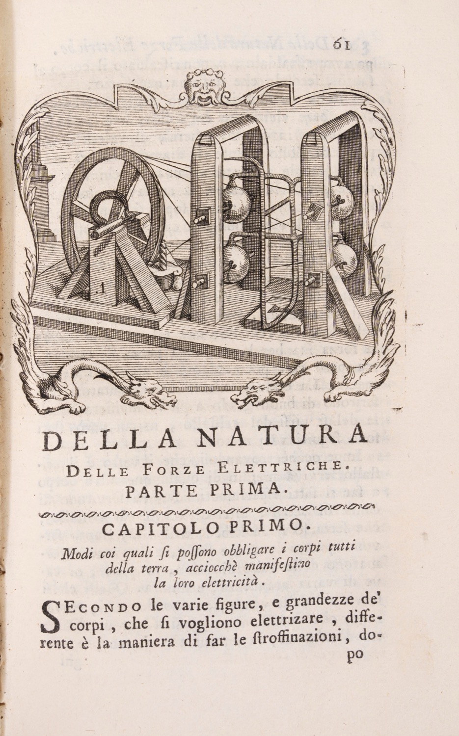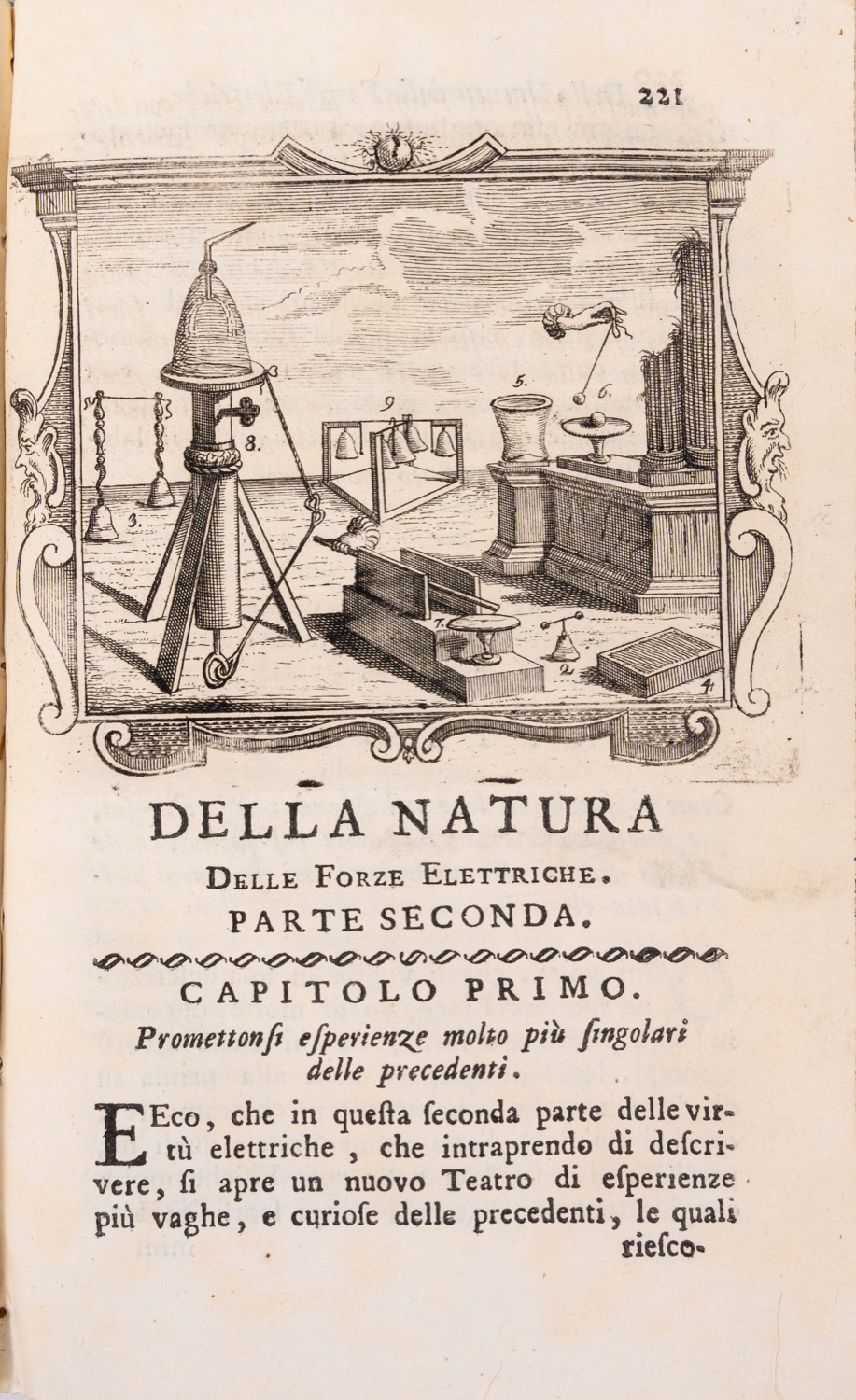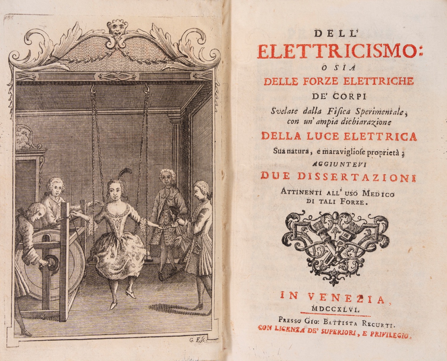 Venezia, G. Battista Recurti. 1746. In 8°. Antiporta incisa in rame, frontespizio in rosso e nero, due piccole incisioni nel testo che raffigurano strumentazione scientifica, legatura coeva in piena pergamena rigida, titolo in oro entro tassello al dorso, tagli a spruzzo blu.Venezia, G. Battista Recurti. 1746. In 8°. Antiporta incisa in rame, frontespizio in rosso e nero, due piccole incisioni nel testo che raffigurano strumentazione scientifica, legatura coeva in piena pergamena rigida, titolo in oro entro tassello al dorso, tagli a spruzzo blu.