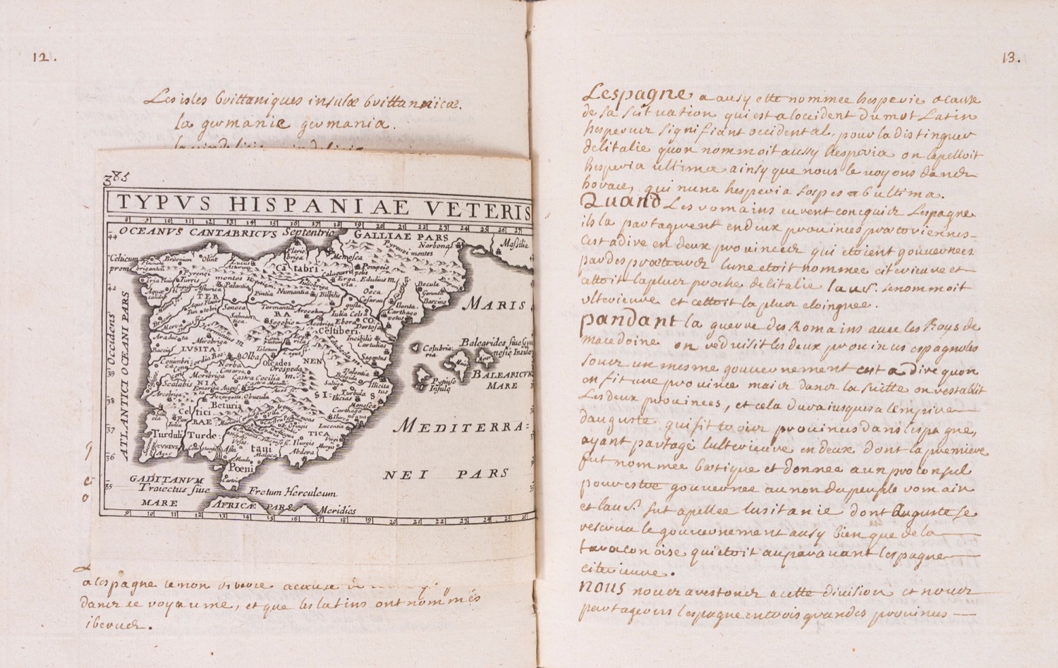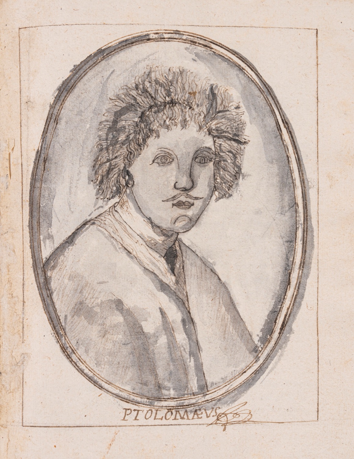 Manoscritto ottocentesco, privo di date, legatura moderna in cartonato grigio muto; Il testo è preceduto da una disegno fatto a mano e colorato ad acquerello, ritraente il busto di Ptolomaeus in una cornice ovale, con firma (illeggibile); poi tra la p. 8 e la p. 9 è inserita una carta con una poesia ("Le Mademoiselle Grouax" ?), tra le p. 12 e 13 è inserita una piccola tavola tratta da un'opera geografica settecentesca, raffigurante la Spagna antica (Typus Hispaniae veteris), infine tra le p. 18 e 19 è inserita un'altra piccola tavola geografica settecentesca, raffigurante la Francia antica (Galliae veteris descriptio). Esemplare molto buono.Manoscritto ottocentesco, privo di date, legatura moderna in cartonato grigio muto; Il testo è preceduto da una disegno fatto a mano e colorato ad acquerello, ritraente il busto di Ptolomaeus in una cornice ovale, con firma (illeggibile); poi tra la p. 8 e la p. 9 è inserita una carta con una poesia ("Le Mademoiselle Grouax" ?), tra le p. 12 e 13 è inserita una piccola tavola tratta da un'opera geografica settecentesca, raffigurante la Spagna antica (Typus Hispaniae veteris), infine tra le p. 18 e 19 è inserita un'altra piccola tavola geografica settecentesca, raffigurante la Francia antica (Galliae veteris descriptio). Esemplare molto buono.