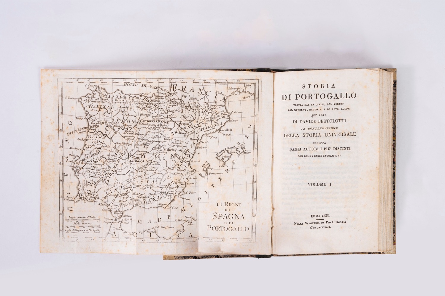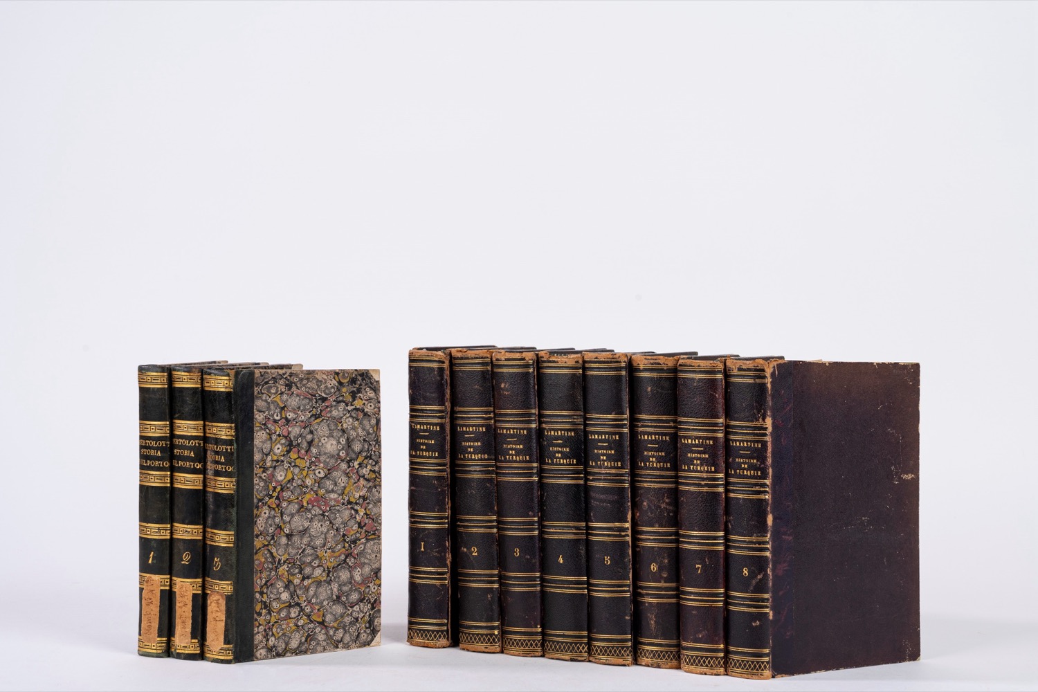 Parigi, Librairie du Constitutionnel, 1854. In-8°; leg. contemporanea in mezza pelle e percalina colore marrone melanzana, con dorso liscio a falsi nervi (4) con filetti e decori dorati, titolo e numero del vol. a caratteri dorati al dorso; guardie in carta marmorizzata; 8 vol. testo in francese. Prima edizione in questo formato, uscita nello stesso anno dell'edizione originale. Vicaire, IV, 1008 ; Talvart, XI, 51. Tracce d'uso alla legatura (qualche cuffia è leggermente consumata, cerniere lente, lievi graffi ai piatti, angoli consumati), foxing diffuso all'interno; opera completa, nel complesso buon esemplare. § Insieme nel lotto: Bertolotti D., Storia di Portogallo […], in continuazione della Storia universale scritta dagli autori i più' distinti con rami e carte geografiche. Volume I [-III], nella Stamperia di Pio Cipicchia, Roma, 1833. In-8°, legatura coeva in mezza pelle con carta marmorizzata ai piatti, titolo e decori in oro al dorso piatto; 3 voll.; tavole e mappe ripiegate. Presenza occasionale di volpi. Nel complesso, un ottimo set. Parigi, Librairie du Constitutionnel, 1854. In-8°; leg. contemporanea in mezza pelle e percalina colore marrone melanzana, con dorso liscio a falsi nervi (4) con filetti e decori dorati, titolo e numero del vol. a caratteri dorati al dorso; guardie in carta marmorizzata; 8 vol. testo in francese. Prima edizione in questo formato, uscita nello stesso anno dell'edizione originale. Vicaire, IV, 1008 ; Talvart, XI, 51. Tracce d'uso alla legatura (qualche cuffia è leggermente consumata, cerniere lente, lievi graffi ai piatti, angoli consumati), foxing diffuso all'interno; opera completa, nel complesso buon esemplare. § Insieme nel lotto: Bertolotti D., Storia di Portogallo […], in continuazione della Storia universale scritta dagli autori i più' distinti con rami e carte geografiche. Volume I [-III], nella Stamperia di Pio Cipicchia, Roma, 1833. In-8°, legatura coeva in mezza pelle con carta marmorizzata ai piatti, titolo e decori in oro al dorso piatto; 3 voll.; tavole e mappe ripiegate. Presenza occasionale di volpi. Nel complesso, un ottimo set.