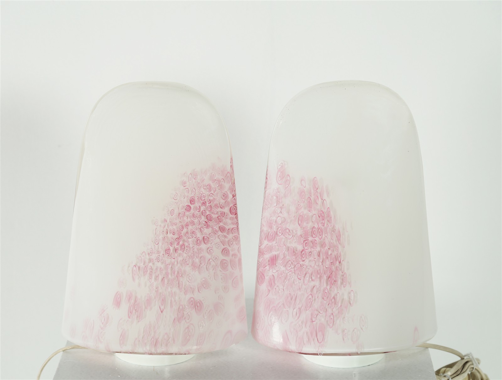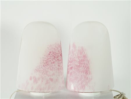 LEUCOS Lotto composto da n.2 lampade. Vetro e murrine di Murano. Cm 20,00 x 30,50. Vetro lattimo soffiato con murrine rosate in rilievo. Anni '80.