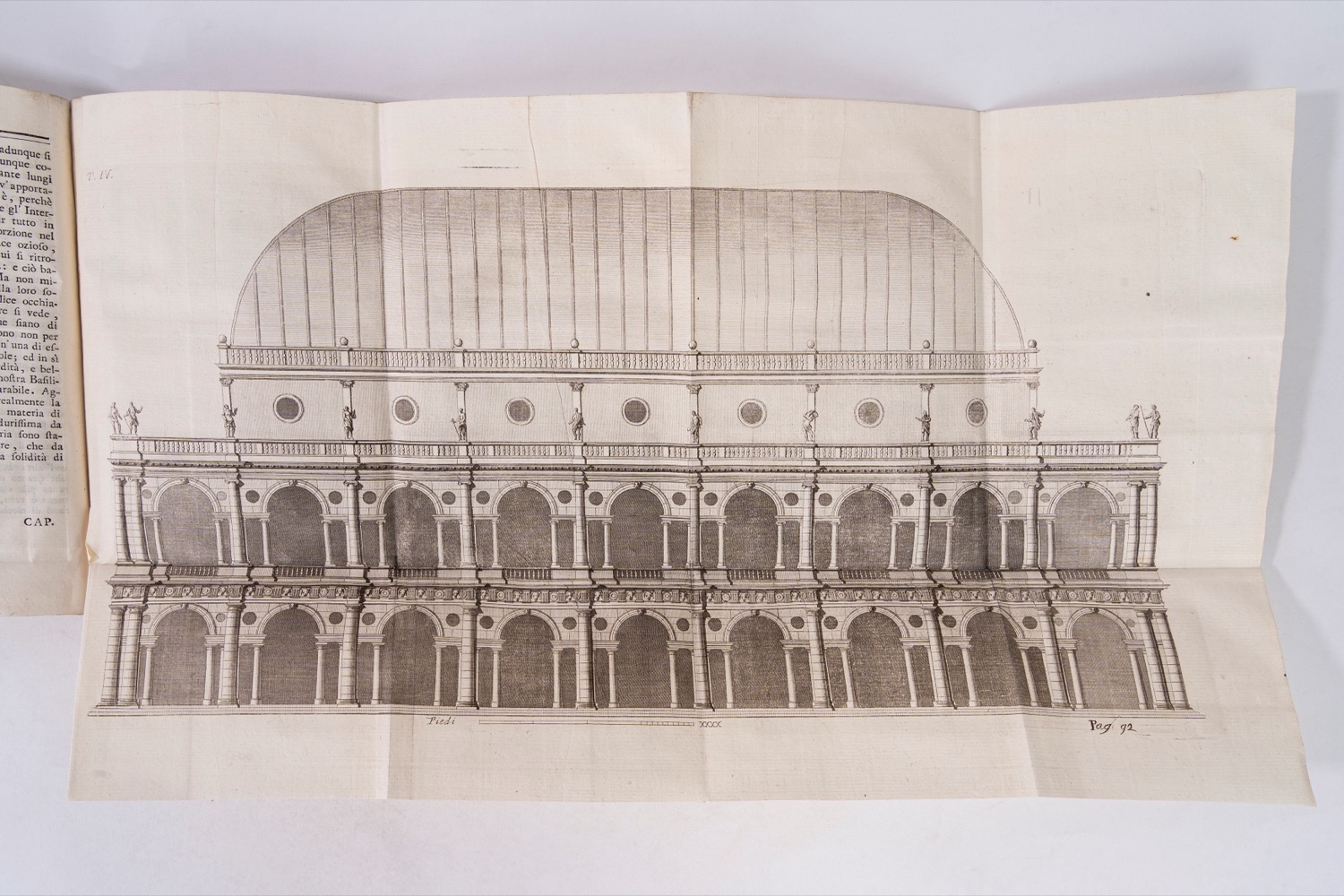Vicenza, Francesco Vendramini Mosca, 1769. In 4°. 8 tavole incise in rame ripiegate fuori testo raffiguranti le Chiese vicentine e di altri luoghi, manca l'antiporta con il ritratto del Palladio, delicato restauro al margine inferiore bianco delle prime due carte, SPLENDIDO ESEMPLARE, cartonato rigido di epoca successiva.Vicenza, Francesco Vendramini Mosca, 1769. In 4°. 8 tavole incise in rame ripiegate fuori testo raffiguranti le Chiese vicentine e di altri luoghi, manca l'antiporta con il ritratto del Palladio, delicato restauro al margine inferiore bianco delle prime due carte, SPLENDIDO ESEMPLARE, cartonato rigido di epoca successiva.