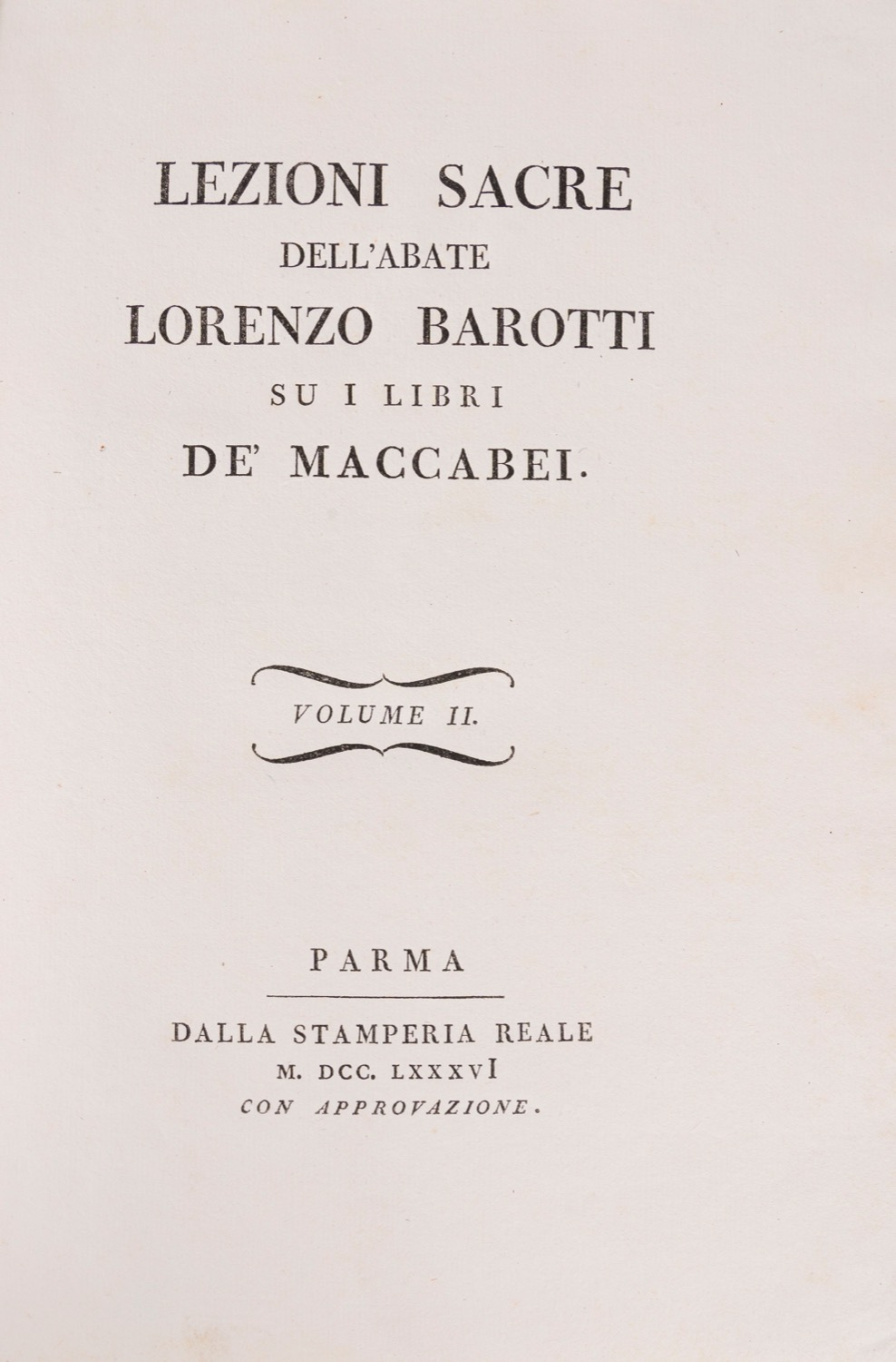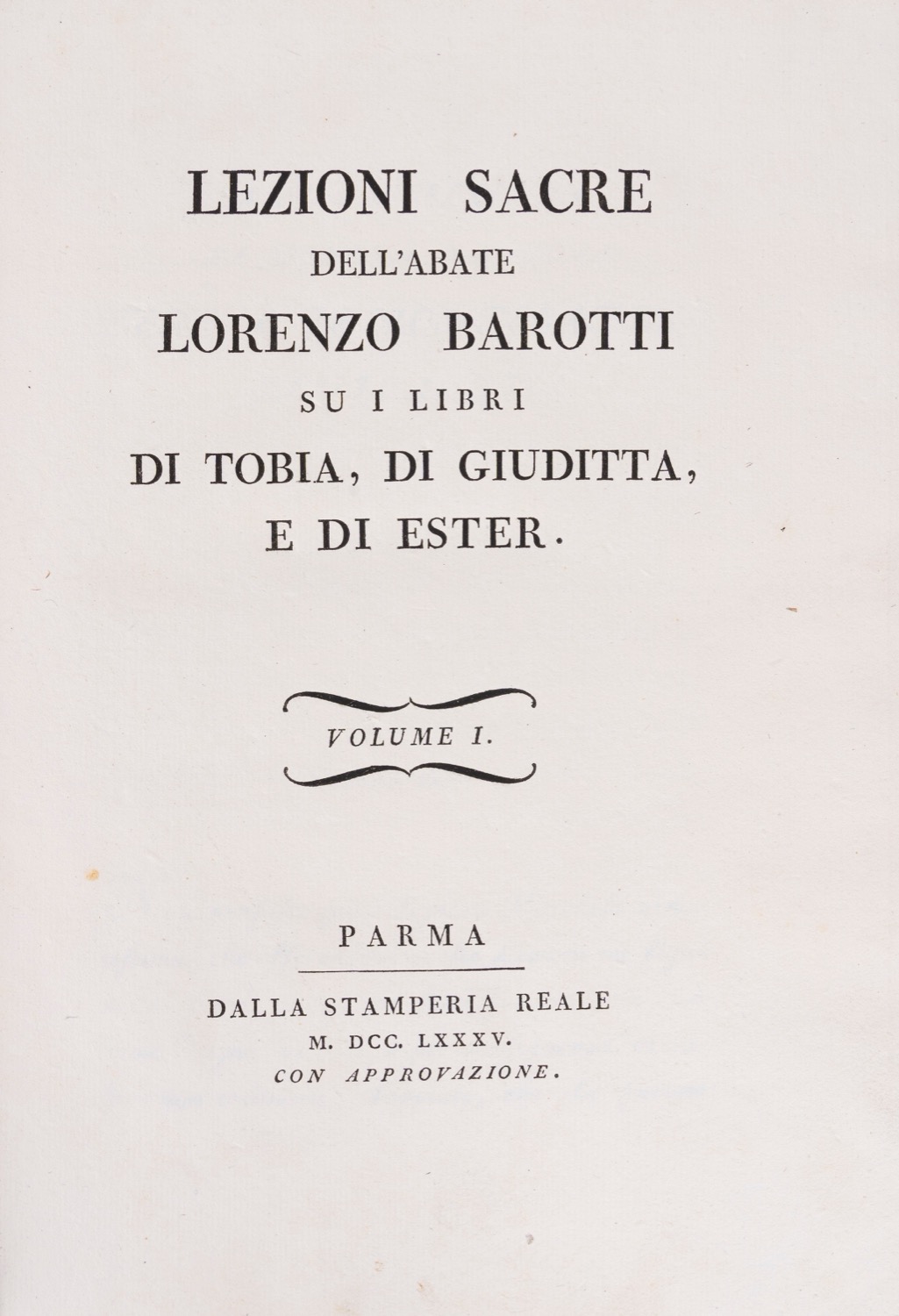 Parma, dalla Stamperia Reale, 1785. In-4° grande, legatura in mezza pelle e carta marmorizzata ai piatti, dorso a cinque nervi con decori dorati, titolo e numerazione dei tomi a caratteri dorati su tasselli in pelle al dorso, tagli colorati di rosso; opera in due tomi. Frontespizi preceduti dagli occhietti, con titolo: "Lezioni sacre su i libri di Tobia, di Giuditta, di Ester e de' Maccabei". L'oper è composta da due volumi: [1.]: Lezioni sacre dell'abate Lorenzo Barotti su i libri di Tobia, di Giuditta, e di Ester - stampato nel 1785. [2.]: Lezioni sacre dell'abate Lorenzo Barotti su i libri de' Maccabei - stampato nel 1786. Il primo volume, preceduto dalla dedica dell'Autore alla Marchesa Teresa de Montecatini Bevilacqua, contiene tre parti, ciascuna con proprio occhietto: a c. a1r Libro di Tobia, a c. o2r Libro di Giuditta, a c. 2c2r Libro di Ester. Legatura di pregio, in ottime condizioni. Carte molto spesse, croccanti e pulitissime. Testo marginoso. Parma, dalla Stamperia Reale, 1785. In-4° grande, legatura in mezza pelle e carta marmorizzata ai piatti, dorso a cinque nervi con decori dorati, titolo e numerazione dei tomi a caratteri dorati su tasselli in pelle al dorso, tagli colorati di rosso; opera in due tomi. Frontespizi preceduti dagli occhietti, con titolo: "Lezioni sacre su i libri di Tobia, di Giuditta, di Ester e de' Maccabei". L'oper è composta da due volumi: [1.]: Lezioni sacre dell'abate Lorenzo Barotti su i libri di Tobia, di Giuditta, e di Ester - stampato nel 1785. [2.]: Lezioni sacre dell'abate Lorenzo Barotti su i libri de' Maccabei - stampato nel 1786. Il primo volume, preceduto dalla dedica dell'Autore alla Marchesa Teresa de Montecatini Bevilacqua, contiene tre parti, ciascuna con proprio occhietto: a c. a1r Libro di Tobia, a c. o2r Libro di Giuditta, a c. 2c2r Libro di Ester. Legatura di pregio, in ottime condizioni. Carte molto spesse, croccanti e pulitissime. Testo marginoso.