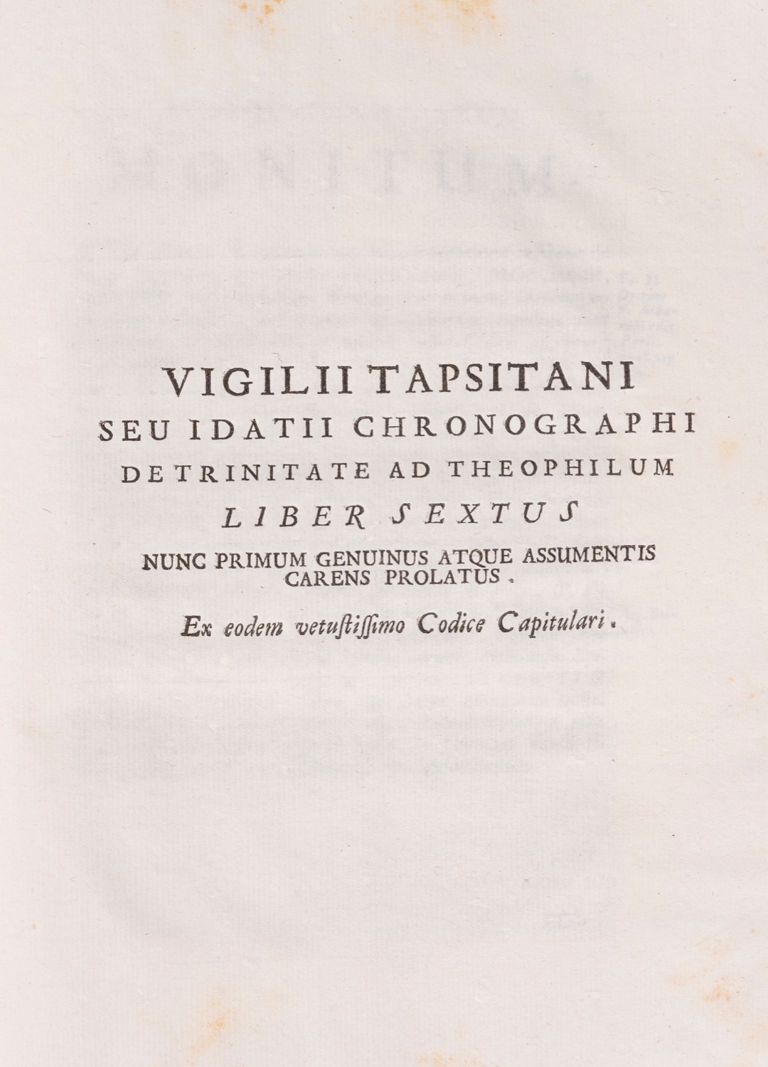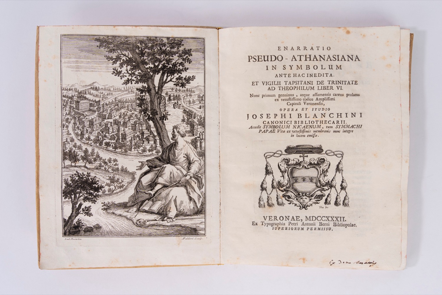 Verona, ex typographia Petri Antonii Berni bibliopolae, 1732. In-4°; legatura coeva in pergamena con titoli manoscritti al dorso, tagli colorati di rosso a spruzzo; antiporta calcografica (bellissima veduta di Verona, disegnata da Lud. Perini ed incisa da A. Faldoni); incisione calcografica di stemma cardinalizio sul front. e capolettera calcografica finemente ornato a c. asterisco1r, in corrispondenza dell'inizio della dedicatoria al Card. Angelo Maria Quirino, Vescovo di Brescia; fregi e iniziali xilografiche.Verona, ex typographia Petri Antonii Berni bibliopolae, 1732. In-4°; legatura coeva in pergamena con titoli manoscritti al dorso, tagli colorati di rosso a spruzzo; antiporta calcografica (bellissima veduta di Verona, disegnata da Lud. Perini ed incisa da A. Faldoni); incisione calcografica di stemma cardinalizio sul front. e capolettera calcografica finemente ornato a c. asterisco1r, in corrispondenza dell'inizio della dedicatoria al Card. Angelo Maria Quirino, Vescovo di Brescia; fregi e iniziali xilografiche.