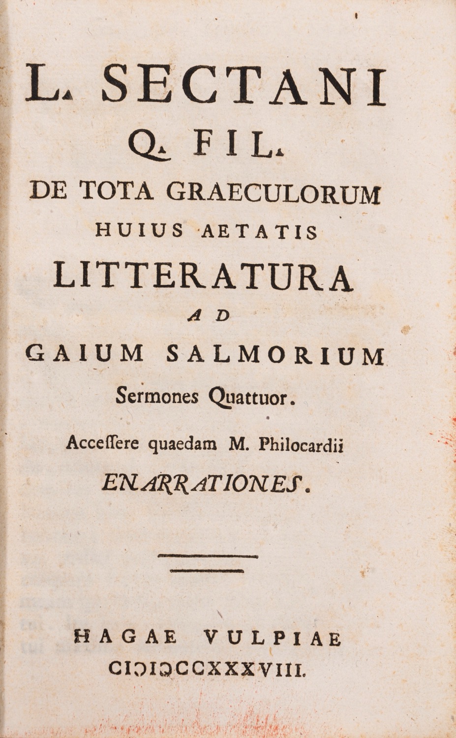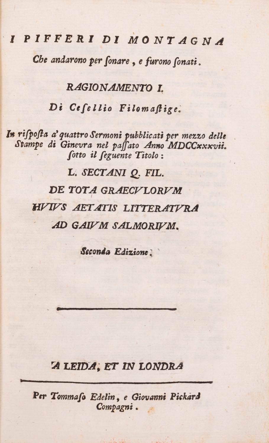 [Bologna, Lelio dalla Volpe], 1738. Legato con Cesellio Filomastige. I Pifferi di montagna che andarono per sonare e furono sonati, Leida e Londra, Tommaso Edelin e Giovanni Pickard, [1738]. Legato con Cordara, Giulio. L. Sectani Q. fil. Ad Gajum Salmorium Sermo quintus. Adcessere M. Philocardii Enarrationes, Corythi : typis Etruscae societatis [Lucca, 1738]. Legato con L. Sectani Q. fil. Ad Gajum Salmorium Sermo sextus. Adcessere M. Philocardii Enarrationes, Corythi [Lucca] typis Etruscae societatis, 1742. Legatura coeva in pelle, fregi in oro al dorso a 5 nervi, tagli a spruzzo rossi, piccole mancanze al dorso. Firme di appartenenza alle carte di guardia[Bologna, Lelio dalla Volpe], 1738. Legato con Cesellio Filomastige. I Pifferi di montagna che andarono per sonare e furono sonati, Leida e Londra, Tommaso Edelin e Giovanni Pickard, [1738]. Legato con Cordara, Giulio. L. Sectani Q. fil. Ad Gajum Salmorium Sermo quintus. Adcessere M. Philocardii Enarrationes, Corythi : typis Etruscae societatis [Lucca, 1738]. Legato con L. Sectani Q. fil. Ad Gajum Salmorium Sermo sextus. Adcessere M. Philocardii Enarrationes, Corythi [Lucca] typis Etruscae societatis, 1742. Legatura coeva in pelle, fregi in oro al dorso a 5 nervi, tagli a spruzzo rossi, piccole mancanze al dorso. Firme di appartenenza alle carte di guardia