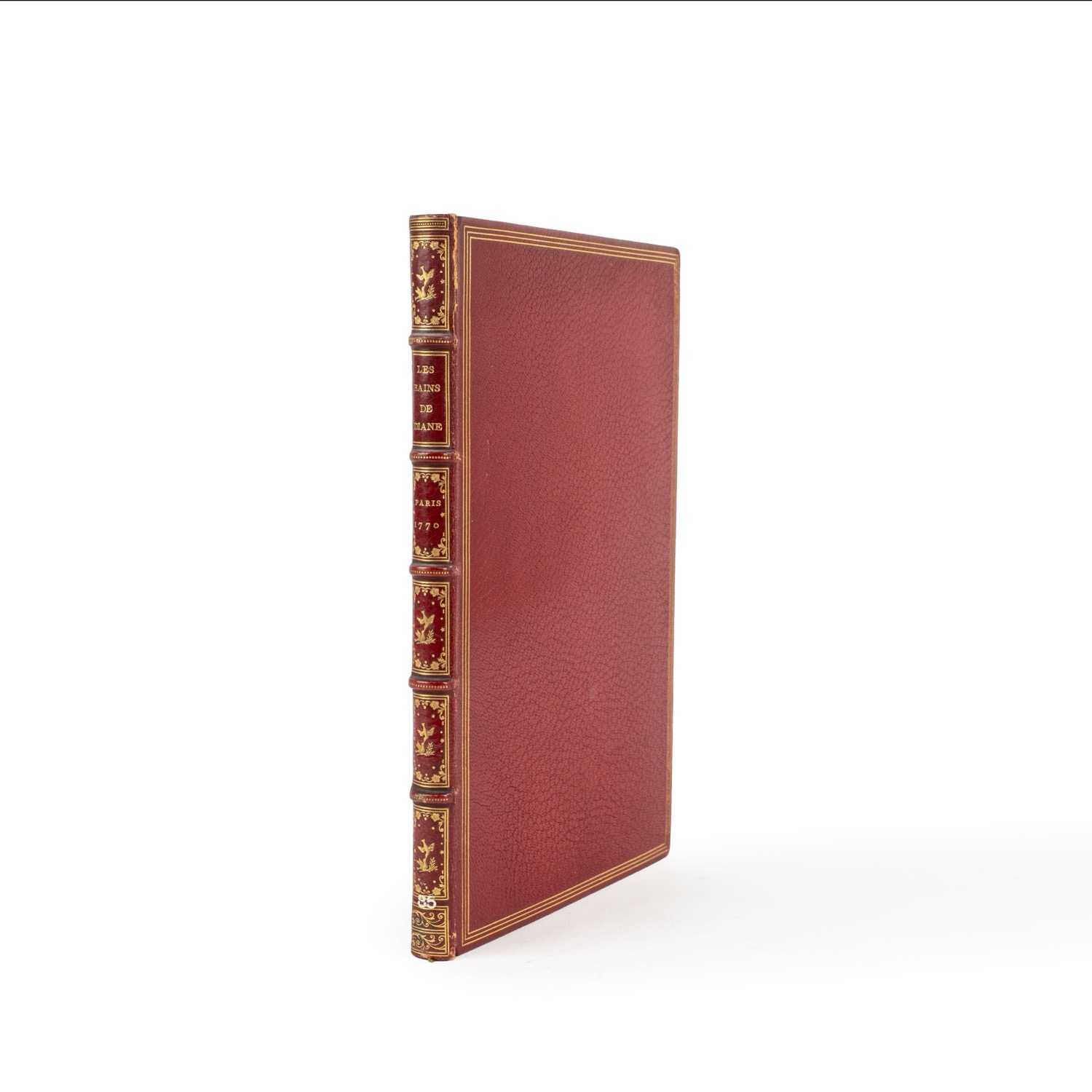 Paris, J. P. Costard, 1770. In 8°. Magnifico frontespizio figurato di Marillier inciso in rame da De Ghendt e 3 tavole fuori testo, sempre di Marillier, incise da Massard, Ponce e Voyez l'ainé, legatura d'amatore in pieno marocchino rosso ottocentesco - firmata da Reymann - con triplice filetto dorato ai piatti, dorso a comparti con preziose decorazioni e titolo in oro, bellissime dentelles dorate ai risguardi, tagli dorati. Ex libris al contropiatto con Gallo sopra una pila di libri e motto: "Ognora desto - Dai libri di C. G." Paris, J. P. Costard, 1770. In 8°. Magnifico frontespizio figurato di Marillier inciso in rame da De Ghendt e 3 tavole fuori testo, sempre di Marillier, incise da Massard, Ponce e Voyez l'ainé, legatura d'amatore in pieno marocchino rosso ottocentesco - firmata da Reymann - con triplice filetto dorato ai piatti, dorso a comparti con preziose decorazioni e titolo in oro, bellissime dentelles dorate ai risguardi, tagli dorati. Ex libris al contropiatto con Gallo sopra una pila di libri e motto: "Ognora desto - Dai libri di C. G."