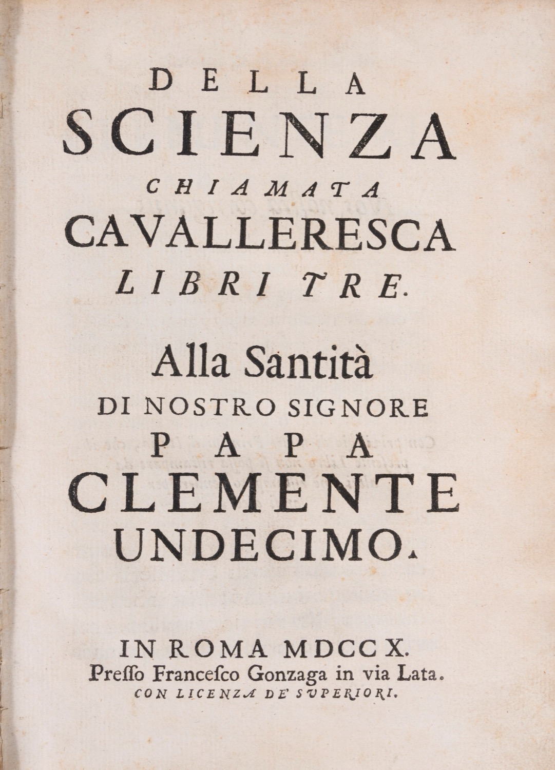 Roma, presso Francesco Gonzaga in via Lata, 1710. In-8°; Legatura in piena pergamena rigida con titolo a caratteri dorati su tassello in pelle rossa al dorso liscio; tagli colorati di verde a spruzzo; nastrino segnapagina; front. a caratteri neri; iniziali della dedica (a Papa Clemente XI) e del capo primo finemente incisi. Indicazione d'appartenenza stampata entro cornice su etichetta incollata al contropiatto anteriore (ex dono fratris nostri Venier nob. Josephi). Lievi bruniture e fioriture; opera in condizioni generali molto buone.Roma, presso Francesco Gonzaga in via Lata, 1710. In-8°; Legatura in piena pergamena rigida con titolo a caratteri dorati su tassello in pelle rossa al dorso liscio; tagli colorati di verde a spruzzo; nastrino segnapagina; front. a caratteri neri; iniziali della dedica (a Papa Clemente XI) e del capo primo finemente incisi. Indicazione d'appartenenza stampata entro cornice su etichetta incollata al contropiatto anteriore (ex dono fratris nostri Venier nob. Josephi). Lievi bruniture e fioriture; opera in condizioni generali molto buone.