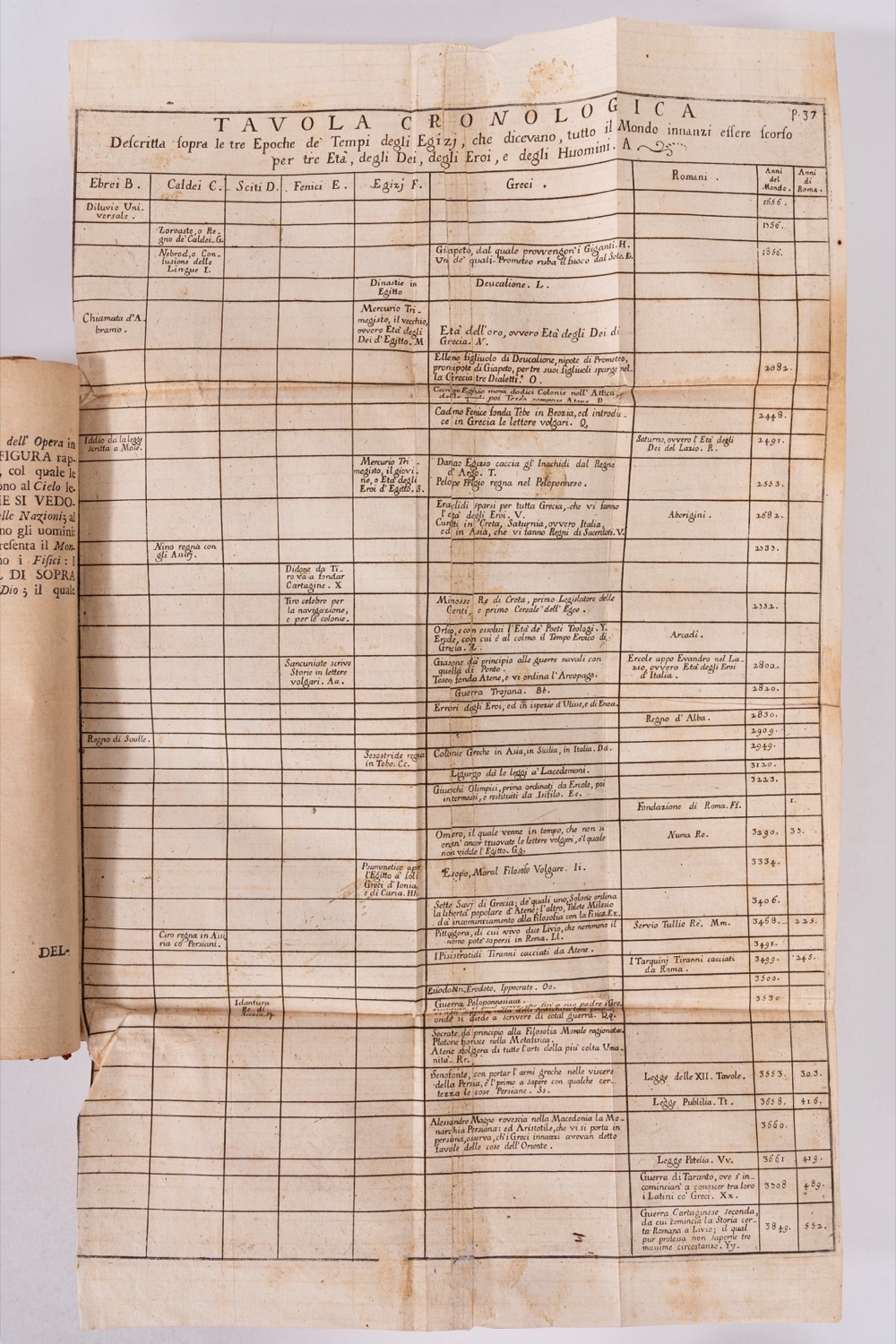 Napoli, Elia e fratelli Muzio, 1744. In 8°. 2 tomi in 1 volume ciascuno con proprio frontespizio. Antiporta allegorica incisa da Francesco Sesoni, vignetta al frontespizio, 1 tavola cronologica ripiegata, 2 piccoli fori al frontespizio, leggera brunitura, mancante il ritratto dell'Autore, legatura coeva in mezza pelle, titolo in oro entro tassello al dorso, tassello cartaceo al dorso, tagli rossi, alcune mancanze al dorso, lievi difetti. Napoli, Elia e fratelli Muzio, 1744. In 8°. 2 tomi in 1 volume ciascuno con proprio frontespizio. Antiporta allegorica incisa da Francesco Sesoni, vignetta al frontespizio, 1 tavola cronologica ripiegata, 2 piccoli fori al frontespizio, leggera brunitura, mancante il ritratto dell'Autore, legatura coeva in mezza pelle, titolo in oro entro tassello al dorso, tassello cartaceo al dorso, tagli rossi, alcune mancanze al dorso, lievi difetti.