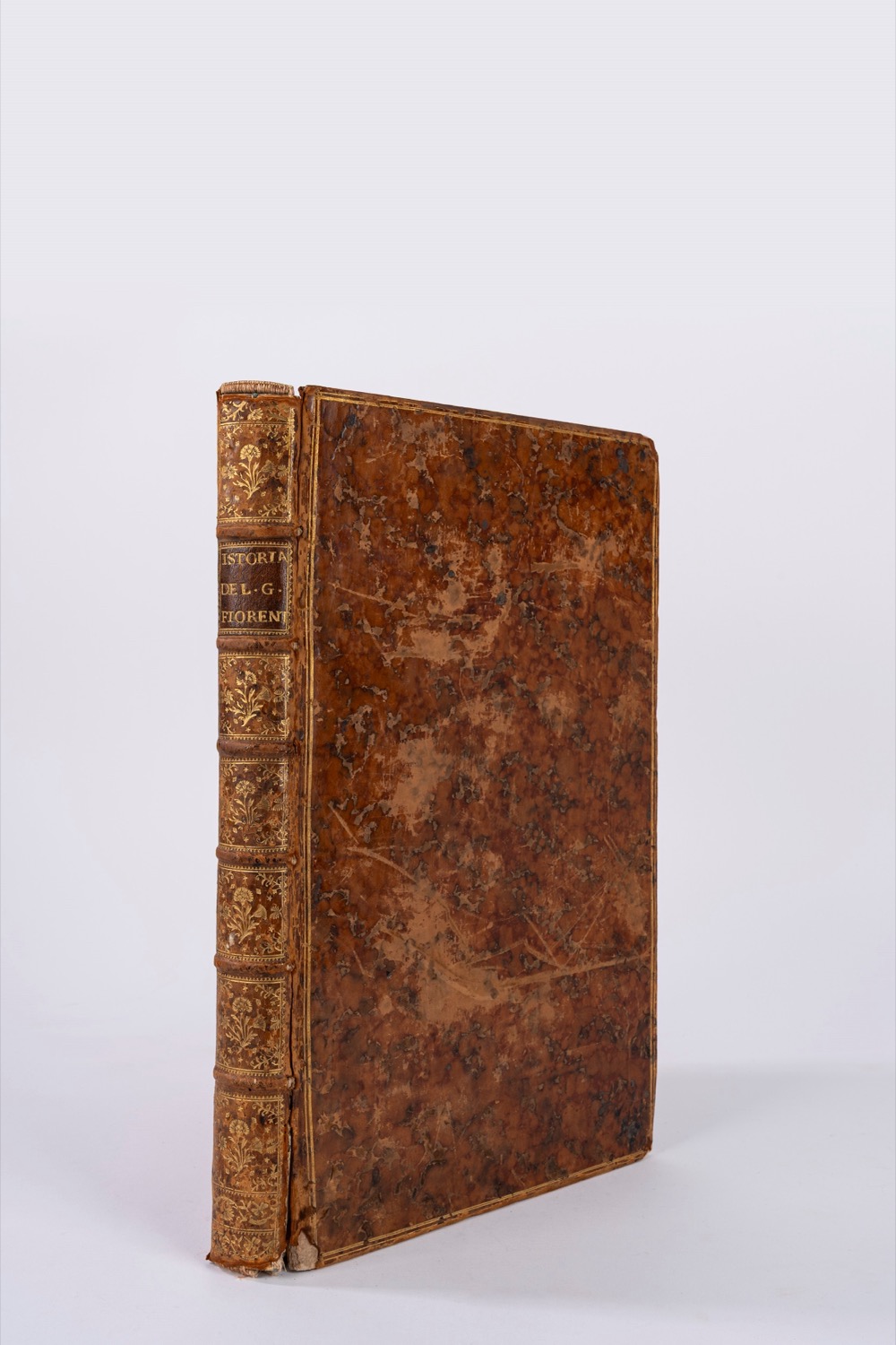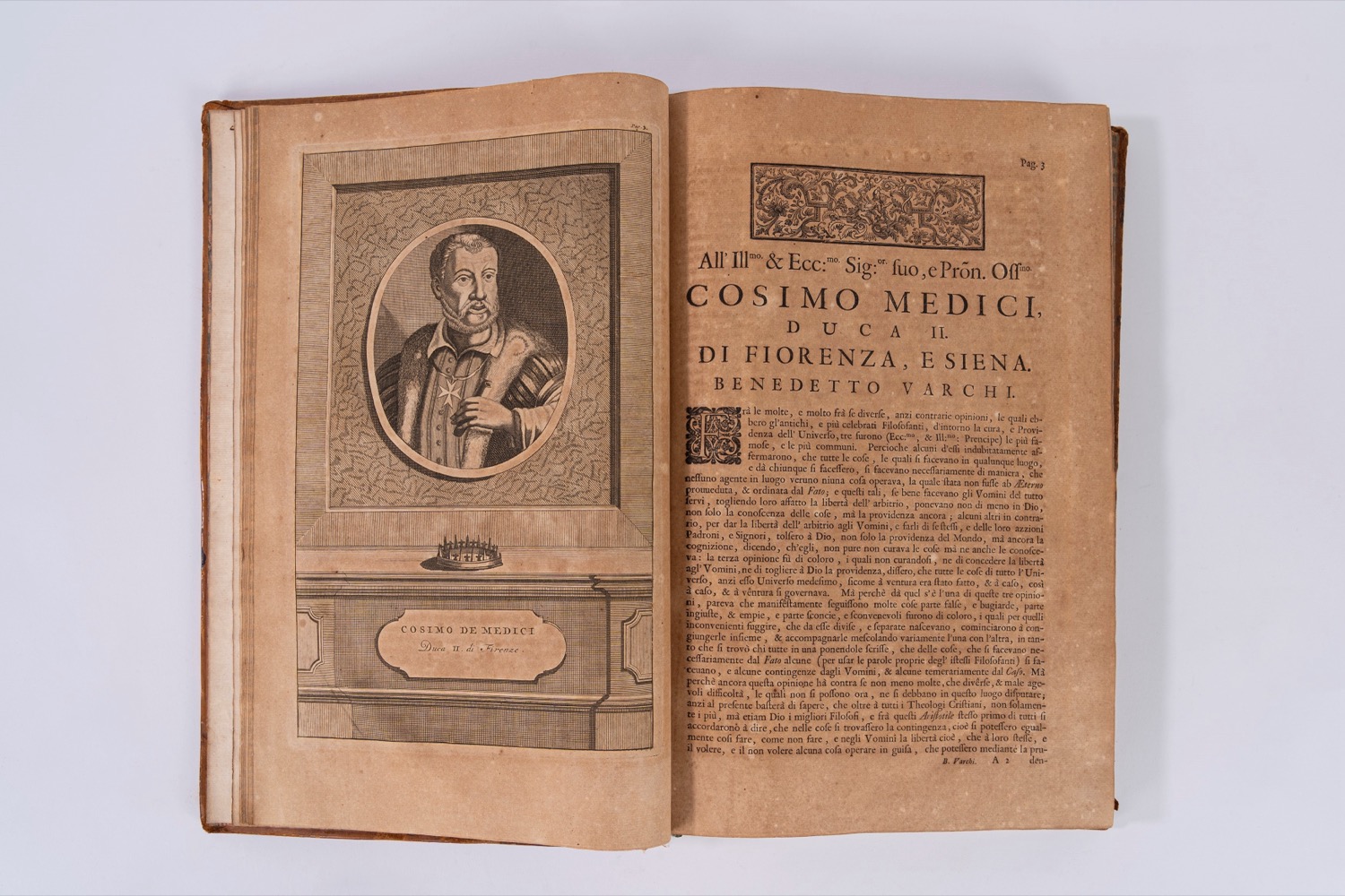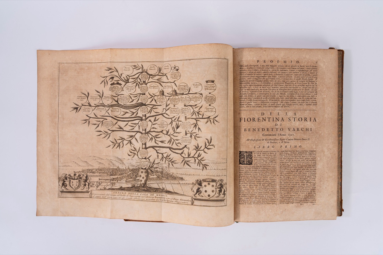 Leida, appresso Pietro van der Aa, 1723. in-folio; legatura del sec. XVIII in piena pelle marrone, marezzata ai piatti, cornice di triplice filetto in oro ai piatti, titoli in oro su tassello colorato al dorso a sei nervi, cornici e fregi fitomorfi ai comparti, tagli marmorizzati; due parti in un volume; Frontespizio a caratteri rossi e neri, vignetta calcografica entro ovale al frontespizio, testatine calcografiche, capilettera xilografici, 8 tavole incise fuori testo, ed una grande tavola ripiegata; alle tavole sono ritratti, a pagina intera, l'Autore, Cosimo de' Medici, Giulio Cardinal de' Medici (creatoi Papa Clemente VII), Francisco I, Ipolito de' Medici (Cardinale), Malatesta Baglioni (Generale de' Fiorentini), Alessandro de' Medici (Primo Duca di Firenze) e Carlo V (Imperadore de' Romani). La grande tavola ripiegata riporta l'albero genealogico della casa dei Medici, con veduta di Firenze sullo sfondo. Leida, appresso Pietro van der Aa, 1723. in-folio; legatura del sec. XVIII in piena pelle marrone, marezzata ai piatti, cornice di triplice filetto in oro ai piatti, titoli in oro su tassello colorato al dorso a sei nervi, cornici e fregi fitomorfi ai comparti, tagli marmorizzati; due parti in un volume; Frontespizio a caratteri rossi e neri, vignetta calcografica entro ovale al frontespizio, testatine calcografiche, capilettera xilografici, 8 tavole incise fuori testo, ed una grande tavola ripiegata; alle tavole sono ritratti, a pagina intera, l'Autore, Cosimo de' Medici, Giulio Cardinal de' Medici (creatoi Papa Clemente VII), Francisco I, Ipolito de' Medici (Cardinale), Malatesta Baglioni (Generale de' Fiorentini), Alessandro de' Medici (Primo Duca di Firenze) e Carlo V (Imperadore de' Romani). La grande tavola ripiegata riporta l'albero genealogico della casa dei Medici, con veduta di Firenze sullo sfondo.