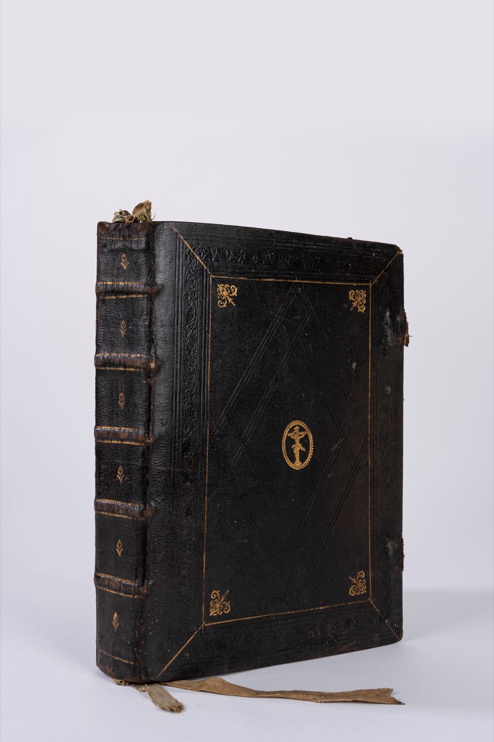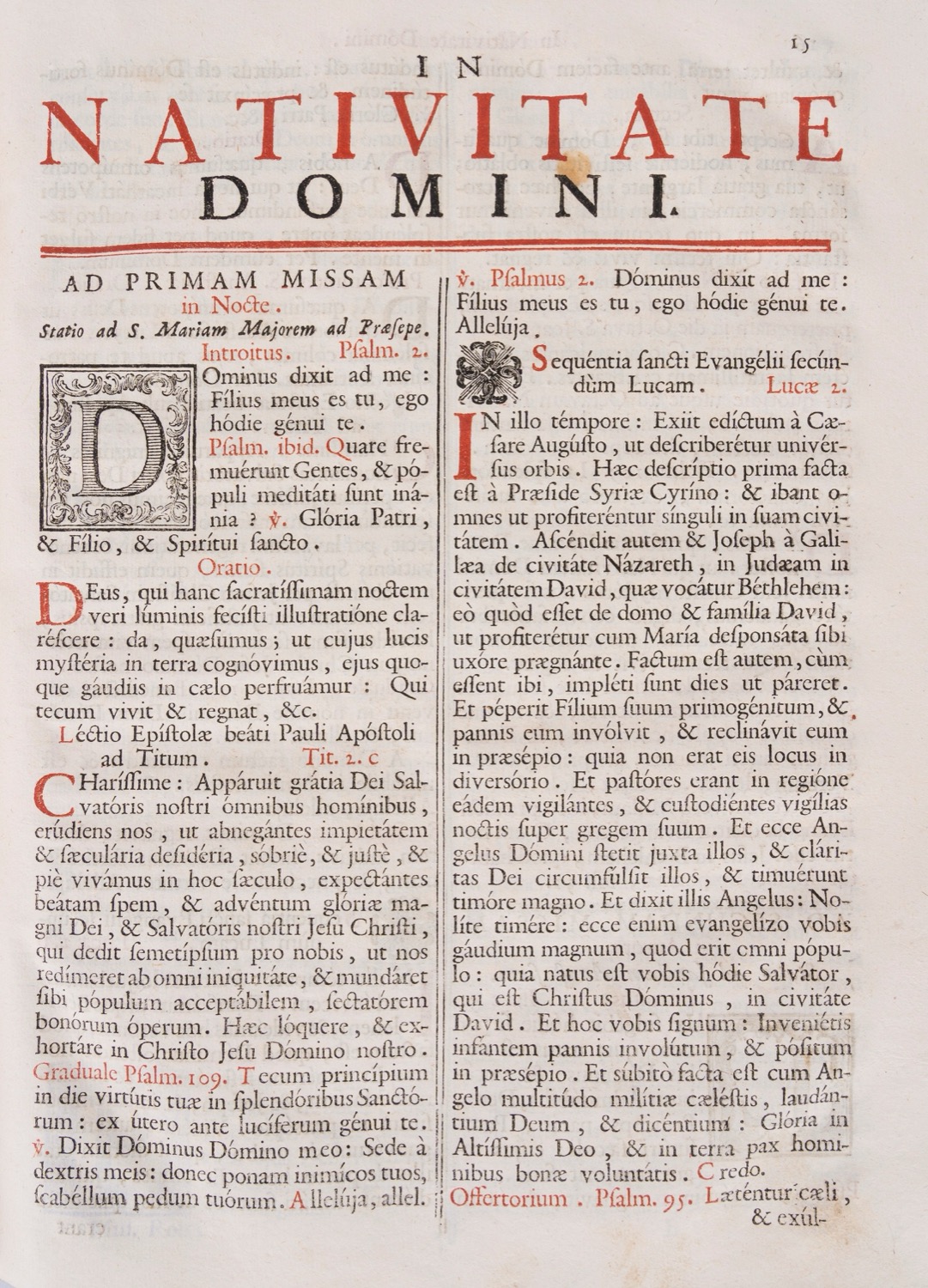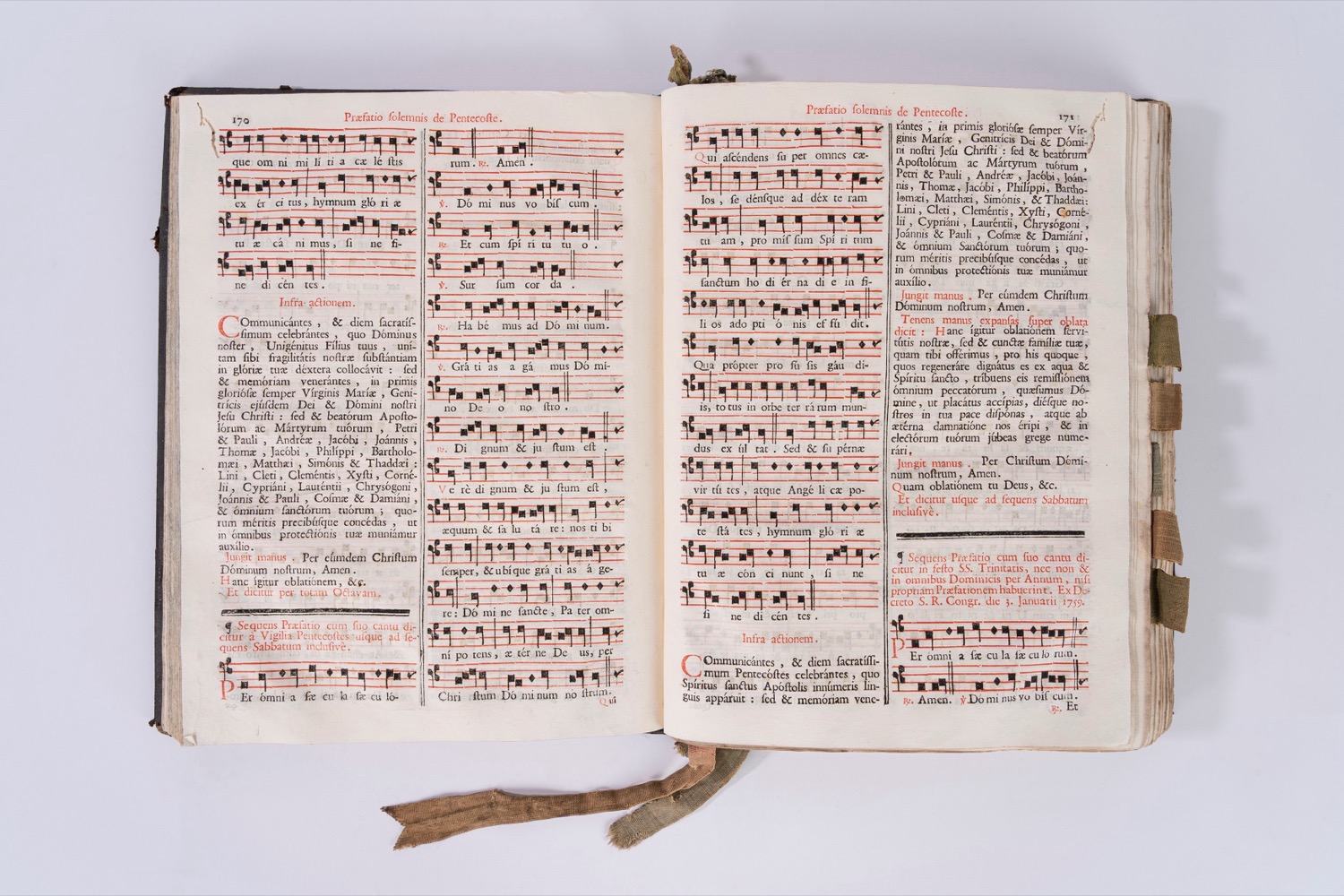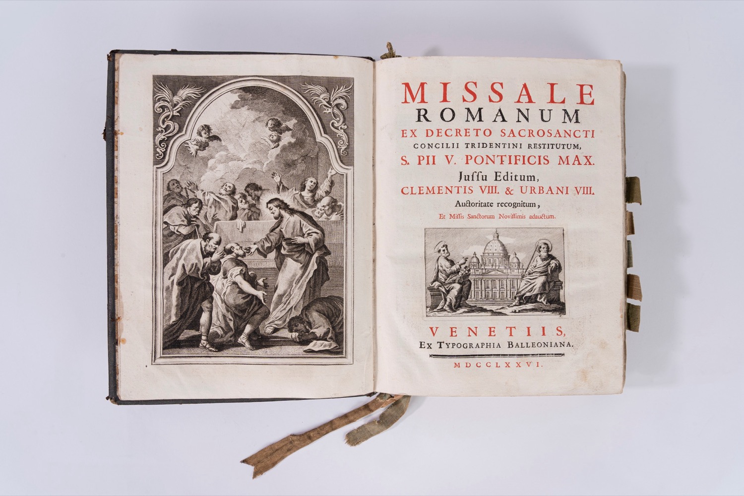 Venezia, ex typographia Balleoniana, 1776. In-folio, leg. coeva in piena pelle nera, dorso a cinque nervi, decori impressi a secco ed in oro ai piatti e al dorso, carte decorate a mano ai contropiatti, tagli spruzzati in blu, nastri di seta segnapagina; in fondo all'opera sono state aggiunte altre 3 carte; antiporta incisa a piena pagina e 3 belle tavole nel testo; vignetta religiosa calcografica sul front. raffigurante la basilica di San Pietro, con ai lati San Pietro e San Paolo; front. in rosso e nero; testo su 2 col. in rosso e nero; iniziali e finali xilografici; alcune pagine di musica in rosso e nero. Tracce d'uso alla legatura (piccole mancanze, presenza di residui dei due lacci di chiusura del volume al taglio laterale). Occasionali fioriture e rare macchie d'umido. Presenza di piccoli fori di tarlo al a margine superiore da pag. 150 a 200. Venezia, ex typographia Balleoniana, 1776. In-folio, leg. coeva in piena pelle nera, dorso a cinque nervi, decori impressi a secco ed in oro ai piatti e al dorso, carte decorate a mano ai contropiatti, tagli spruzzati in blu, nastri di seta segnapagina; in fondo all'opera sono state aggiunte altre 3 carte; antiporta incisa a piena pagina e 3 belle tavole nel testo; vignetta religiosa calcografica sul front. raffigurante la basilica di San Pietro, con ai lati San Pietro e San Paolo; front. in rosso e nero; testo su 2 col. in rosso e nero; iniziali e finali xilografici; alcune pagine di musica in rosso e nero. Tracce d'uso alla legatura (piccole mancanze, presenza di residui dei due lacci di chiusura del volume al taglio laterale). Occasionali fioriture e rare macchie d'umido. Presenza di piccoli fori di tarlo al a margine superiore da pag. 150 a 200.
