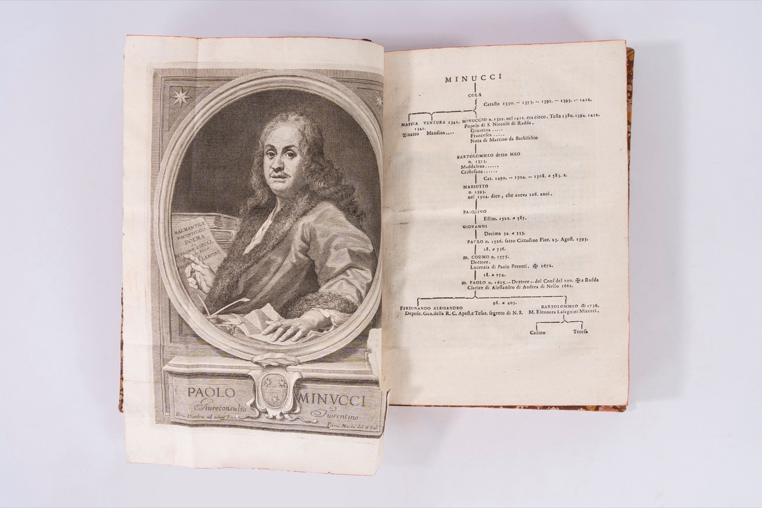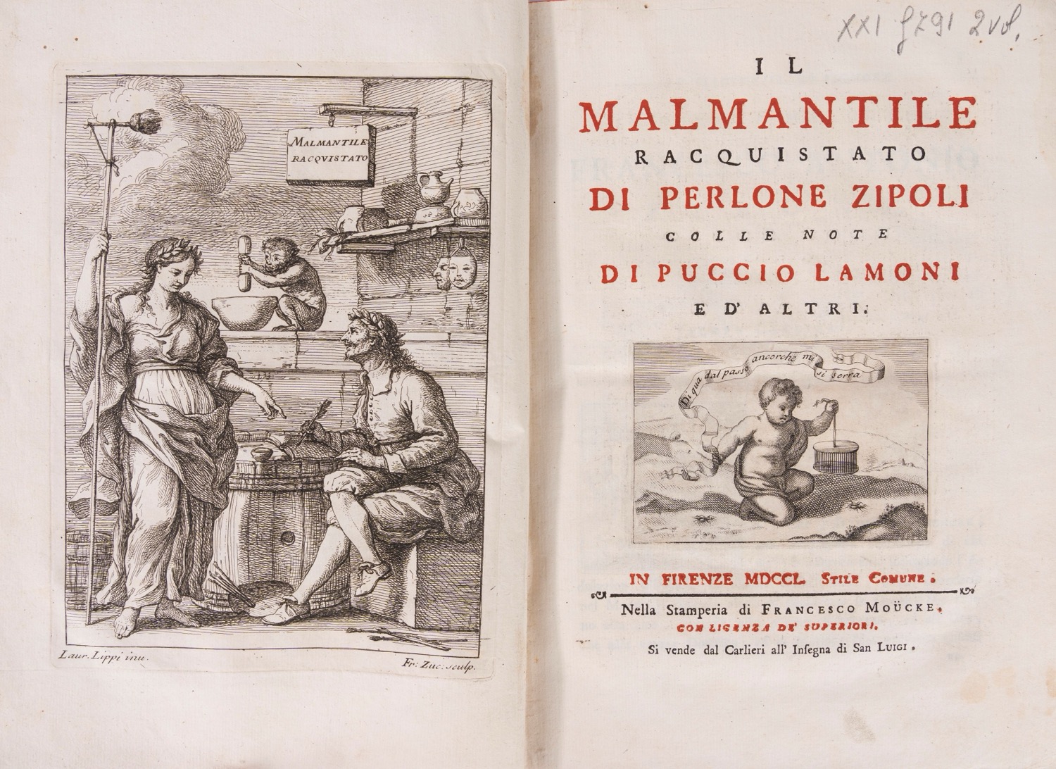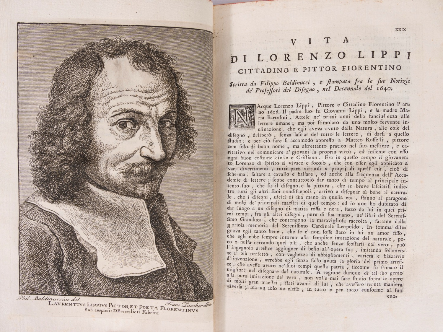 Firenze, Francesco Moücke, 1750. In 4°. 2 voll. Bella antiporta allegorica su disegno di Lippi e incisa da Zuccarelli, una tavola ripiegata con il ritratto di Paolo Minucci, dipinto da Pietro Dandini e disegnato e inciso da Pietro Masini, autoritratto calcografico di Lorenzo Lippi inciso da Francesco Zuccarelli e albero genealogico della famiglia Minucci, frontespizio in rosso e nero con vignetta calcografica, iniziali, testatine e finalini incisi su rame, lieve alone al margine interno degli ultimi fascicoli del II vol., legatura coeva in mezza pelle e carta marmorizzata, tagli rossi.Firenze, Francesco Moücke, 1750. In 4°. 2 voll. Bella antiporta allegorica su disegno di Lippi e incisa da Zuccarelli, una tavola ripiegata con il ritratto di Paolo Minucci, dipinto da Pietro Dandini e disegnato e inciso da Pietro Masini, autoritratto calcografico di Lorenzo Lippi inciso da Francesco Zuccarelli e albero genealogico della famiglia Minucci, frontespizio in rosso e nero con vignetta calcografica, iniziali, testatine e finalini incisi su rame, lieve alone al margine interno degli ultimi fascicoli del II vol., legatura coeva in mezza pelle e carta marmorizzata, tagli rossi.