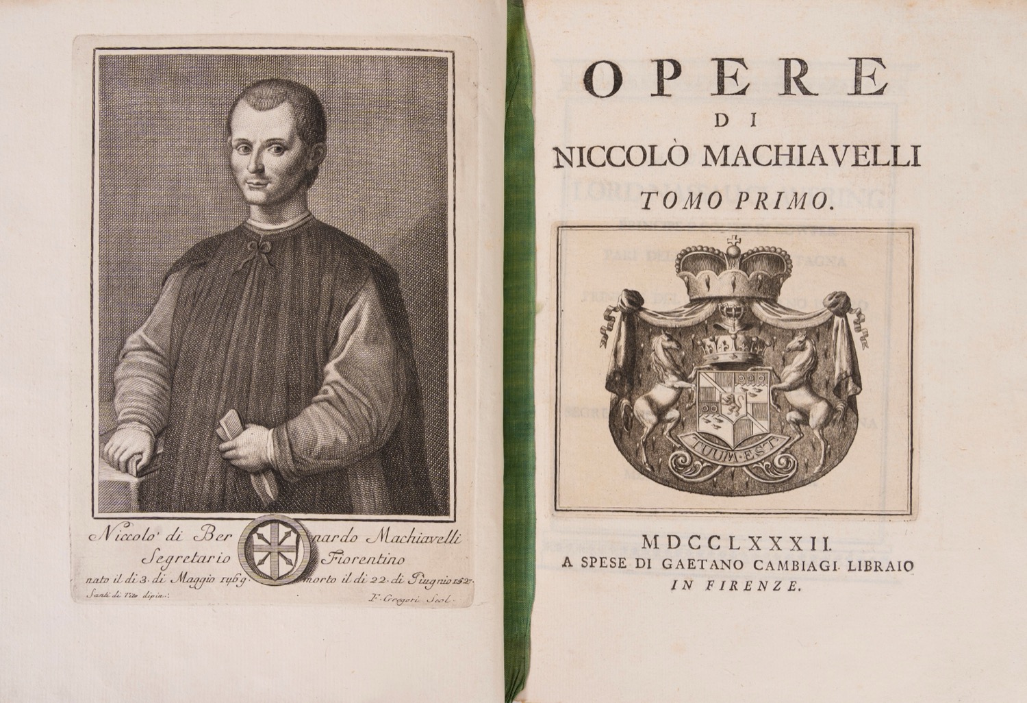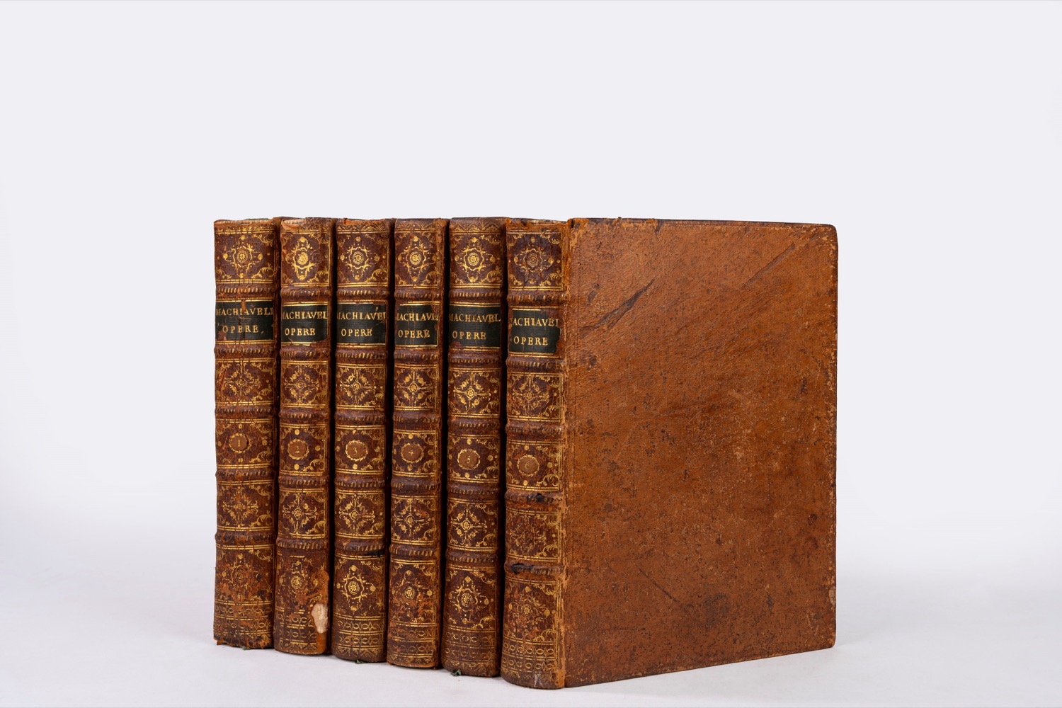Firenze, Gaetano Cambiagi, 1782-83. In 4°. Grande stemma inciso in rame ai frontespizi, al I vol. ritratto di Machiavelli in antiporta, al II vol. 1 tavola incisa e ripiegata, al IV vol. 1 tavola ripiegata con un facsimile, qualche lieve fioritura, piccola lacuna all'angolo bianco dell'ultima carta del II vol., legature coeve in vitello spugnato, titolo entro tassello verde al dorso a 5 nervi, fregi fitomorfi in oro, tagli a spruzzo verdi, qualche piccola mancanza ai dorsi, lievi difetti.Firenze, Gaetano Cambiagi, 1782-83. In 4°. Grande stemma inciso in rame ai frontespizi, al I vol. ritratto di Machiavelli in antiporta, al II vol. 1 tavola incisa e ripiegata, al IV vol. 1 tavola ripiegata con un facsimile, qualche lieve fioritura, piccola lacuna all'angolo bianco dell'ultima carta del II vol., legature coeve in vitello spugnato, titolo entro tassello verde al dorso a 5 nervi, fregi fitomorfi in oro, tagli a spruzzo verdi, qualche piccola mancanza ai dorsi, lievi difetti.