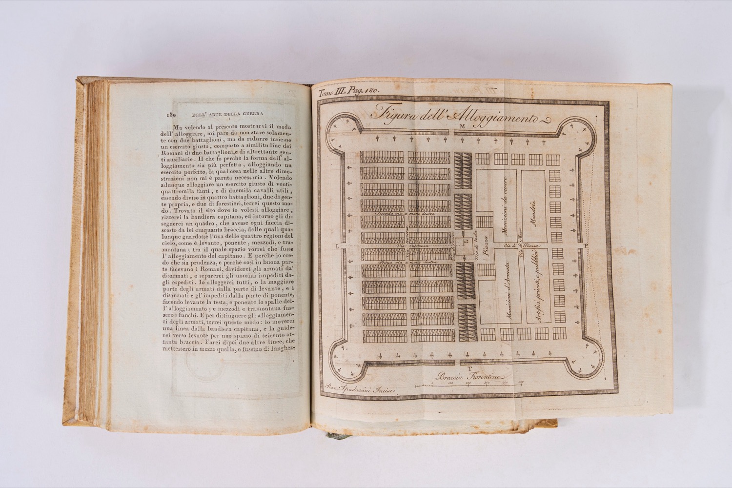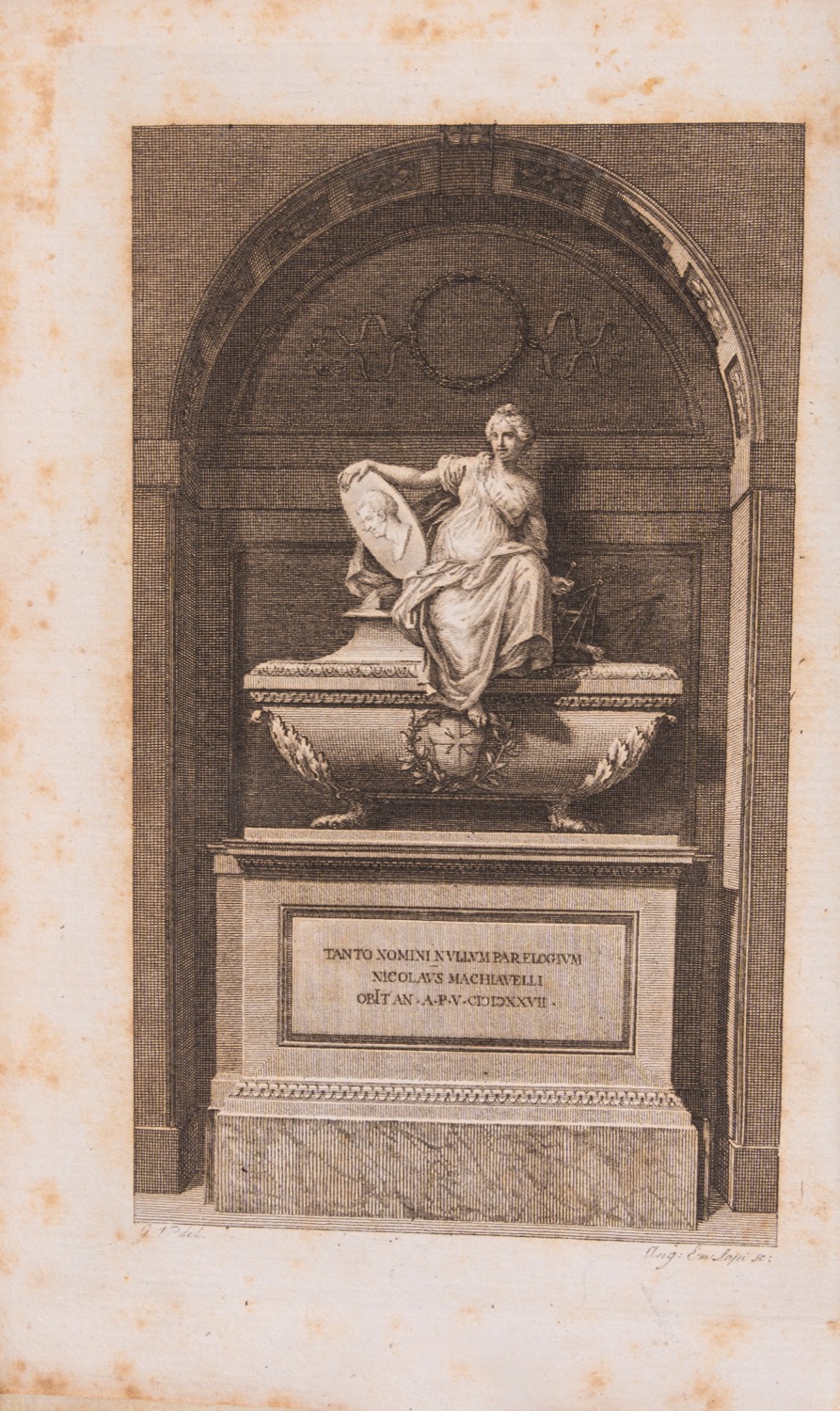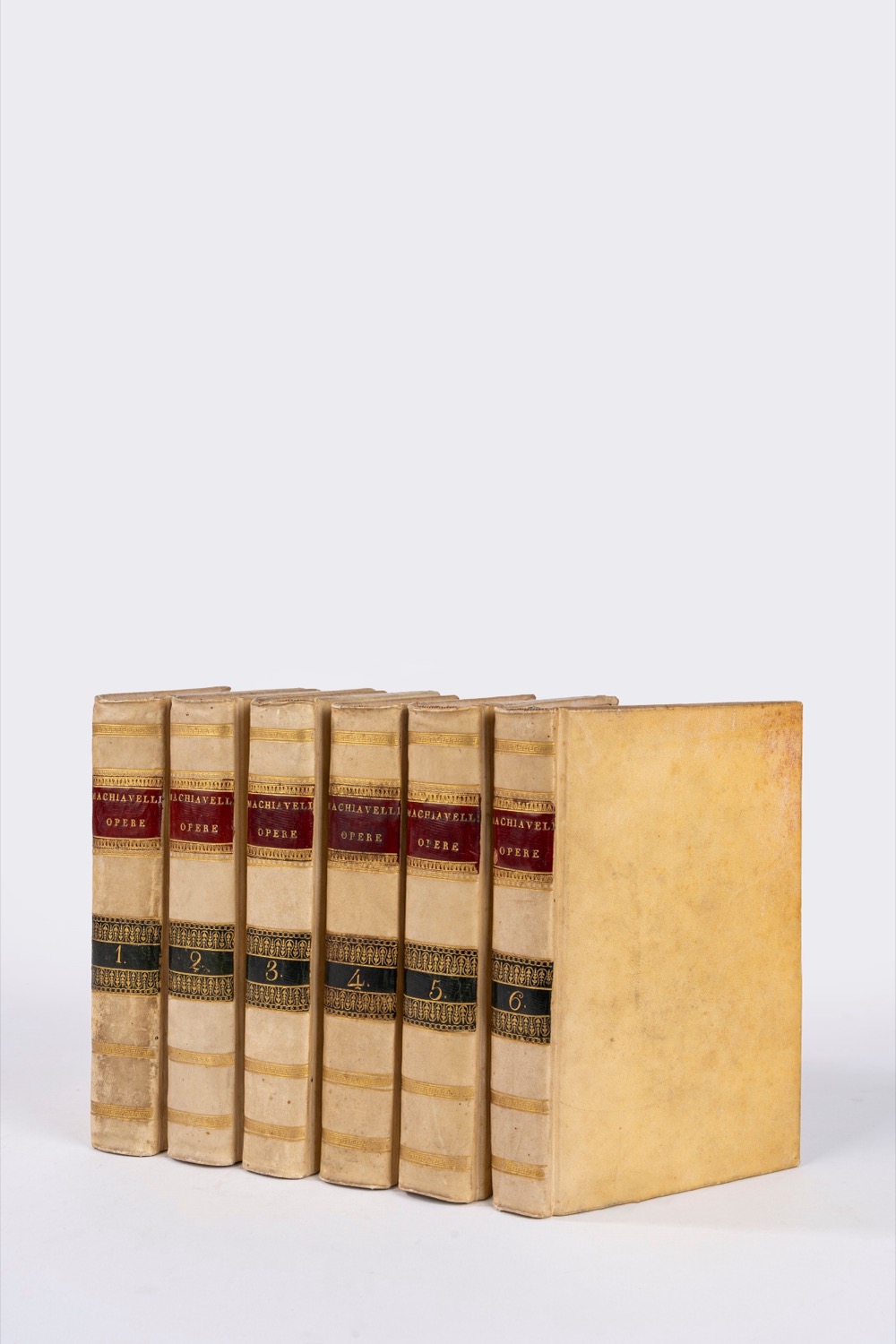 Filadelfia [Livorno], nella stamperia delle Provincie unite [Tommasi Masi & C.] 1796-97. In 8°. 6 voll. Al primo volume antiporta con il ritratto dell'Autore e una tavola che raffigura il sepolcro del Machiavelli incise da Raffaello Morghen e Angelo Emilio Lapi, 2 tavole ripiegate f.t. il tutto inciso in rame, qualche sporadica fioritura e arrossatura, legatura coeva in piena pergamena rigida, al dorso titoli su doppi tasselli in marocchino rosso e verde, eleganti fregi in oro, lievi difetti e segni d'usura.Filadelfia [Livorno], nella stamperia delle Provincie unite [Tommasi Masi & C.] 1796-97. In 8°. 6 voll. Al primo volume antiporta con il ritratto dell'Autore e una tavola che raffigura il sepolcro del Machiavelli incise da Raffaello Morghen e Angelo Emilio Lapi, 2 tavole ripiegate f.t. il tutto inciso in rame, qualche sporadica fioritura e arrossatura, legatura coeva in piena pergamena rigida, al dorso titoli su doppi tasselli in marocchino rosso e verde, eleganti fregi in oro, lievi difetti e segni d'usura.