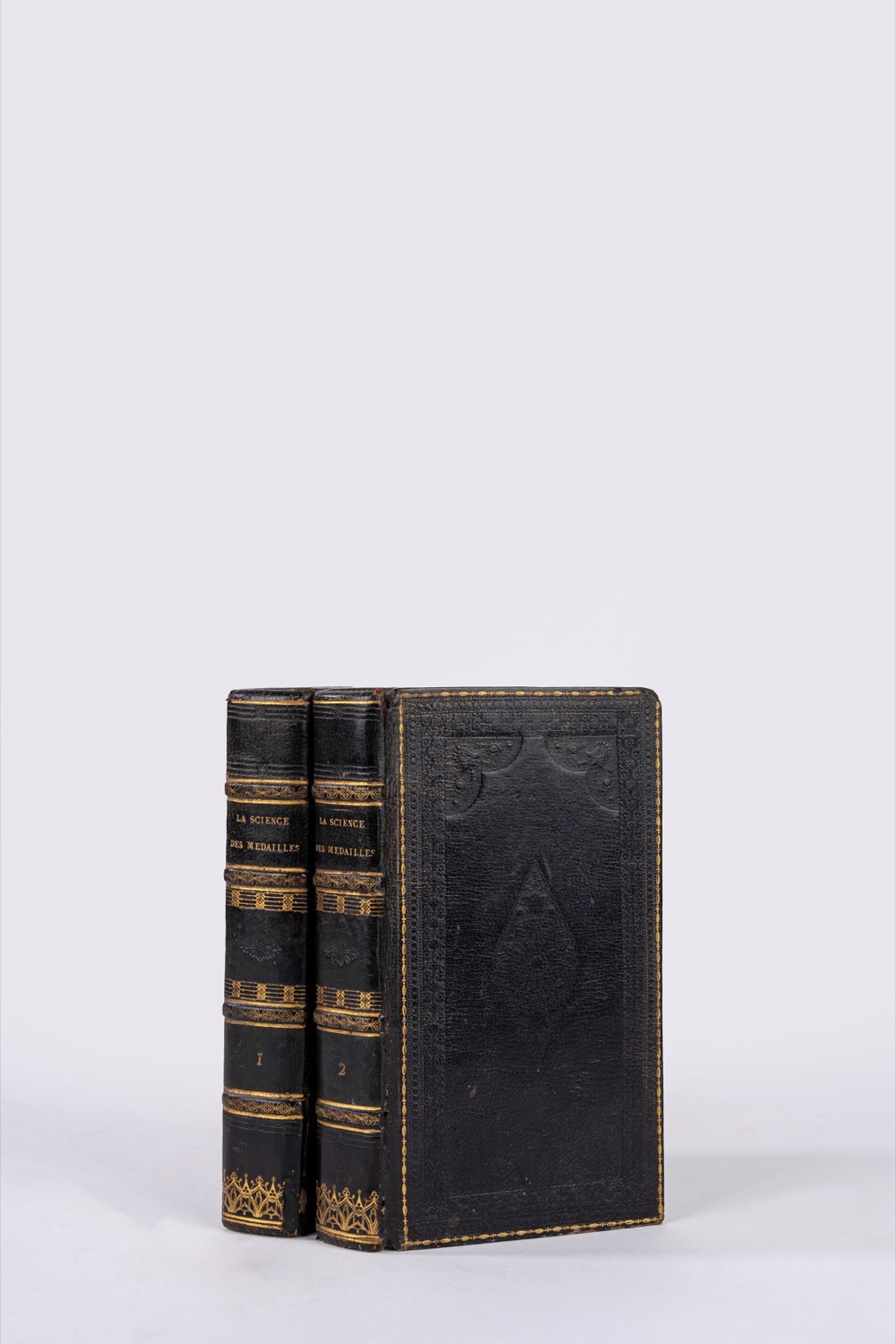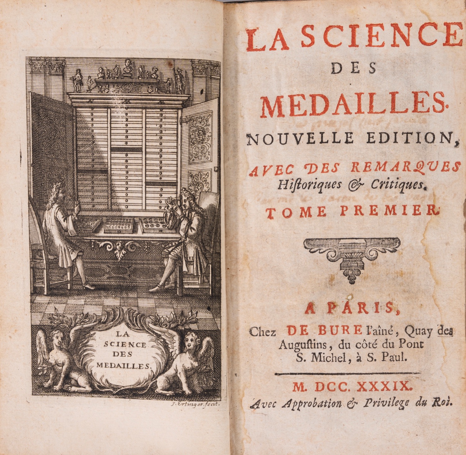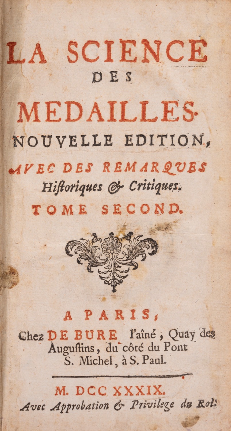 Chez de Bure, Parigi, 1739. In-12°; 2 vol.; xilografia all'antiporta del primo vol. e testate raffiguranti medaglioni disegnate da Ertinger, testatine e capilettera xilografati, 12 tav. più volte ripiegate raffiguranti medaglie; legatura in piena pelle nera, con dorso a quattro nervi, titolo in oro al dorso, decori impressi a freddo ai piatti e al dorso, impreziositi con dorature anche ai tagli ed alle unghiature interne dei piatti; guardie ai contropiatti in carta marmorizzata a bolle; frontespizio a caratteri neri e rossi; tagli dorati. Qualche brunitura, cerniere un po’ lente, una cuffia inf. leggermente danneggiata.Chez de Bure, Parigi, 1739. In-12°; 2 vol.; xilografia all'antiporta del primo vol. e testate raffiguranti medaglioni disegnate da Ertinger, testatine e capilettera xilografati, 12 tav. più volte ripiegate raffiguranti medaglie; legatura in piena pelle nera, con dorso a quattro nervi, titolo in oro al dorso, decori impressi a freddo ai piatti e al dorso, impreziositi con dorature anche ai tagli ed alle unghiature interne dei piatti; guardie ai contropiatti in carta marmorizzata a bolle; frontespizio a caratteri neri e rossi; tagli dorati. Qualche brunitura, cerniere un po’ lente, una cuffia inf. leggermente danneggiata.