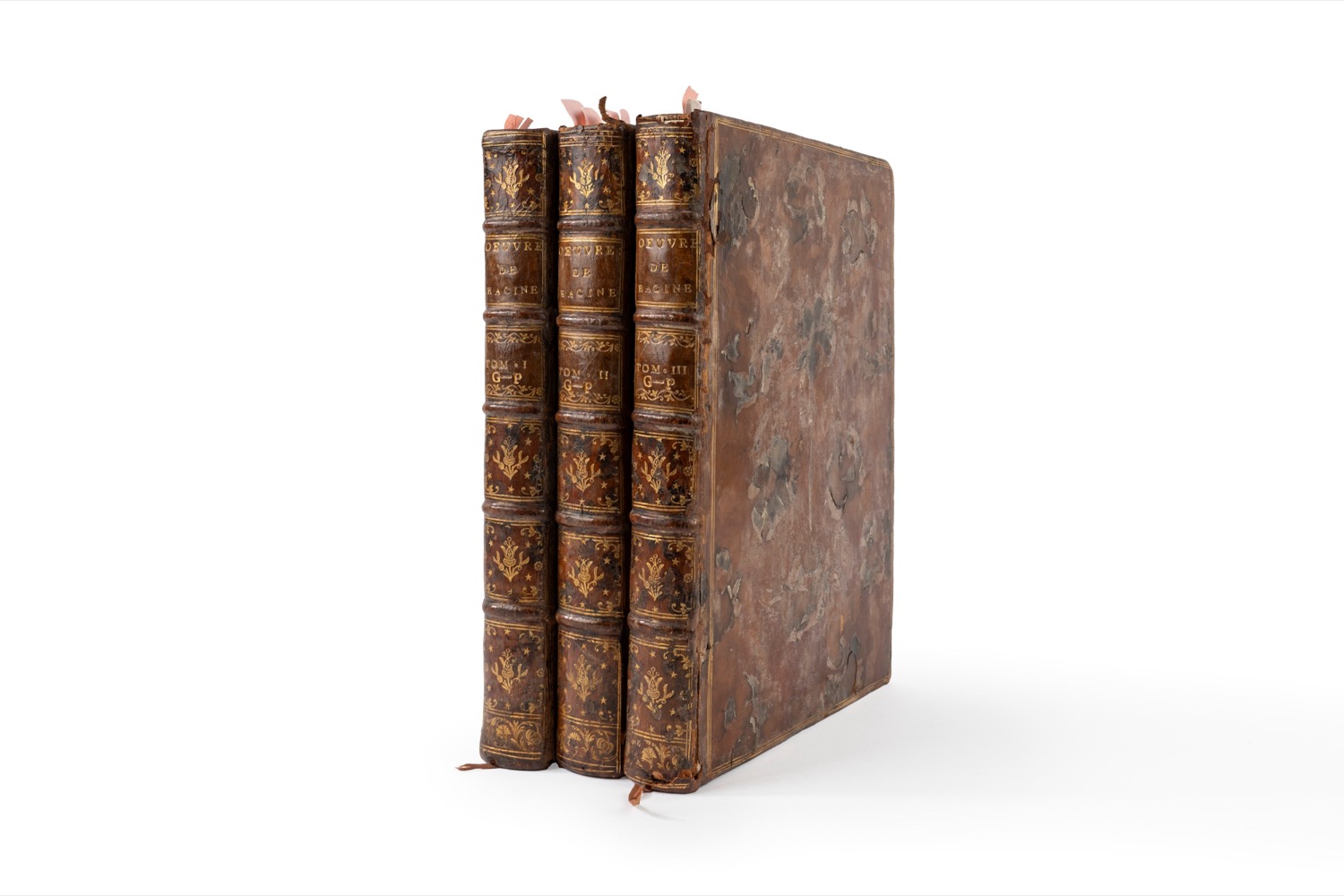 Parigi, s.e. [nel colophon del v. 3.: De l'imprimerie de Le Breton], 1760. In 4°. 3 voll. Al I vol. ritratto dell'Autore in antiporta entro ovale di Daullé, graziose vignette ai frontespizi disegnata da De Seve e inc. (v.1.;3.) da Chevillet, complessivamente 12 tavole a piena pagina, poste a inizio di ciascuna opera, 13 testatine ornate, e 60 culs-de-lampe superbamente incise da Aliamet, Baquoy, Chevillet, Flipart, Legrand, Lemire, Lempereur, Sornique et Tardieu su disegni di Jacques de Seve, qualche arrossatura e leggera brunitura, sporadiche fioriture, legatura coeva in piena pelle, carte di guardia marmorizzate, tagli blu marmorizzati, piatti inquadrati da cornice in oro, titoli in oro al dorso a 5 nervi con fregi, qualche piccola mancanza, lievi difetti. Ex libris cartaceo al contropiatto del Conte Sanminiatelli.Parigi, s.e. [nel colophon del v. 3.: De l'imprimerie de Le Breton], 1760. In 4°. 3 voll. Al I vol. ritratto dell'Autore in antiporta entro ovale di Daullé, graziose vignette ai frontespizi disegnata da De Seve e inc. (v.1.;3.) da Chevillet, complessivamente 12 tavole a piena pagina, poste a inizio di ciascuna opera, 13 testatine ornate, e 60 culs-de-lampe superbamente incise da Aliamet, Baquoy, Chevillet, Flipart, Legrand, Lemire, Lempereur, Sornique et Tardieu su disegni di Jacques de Seve, qualche arrossatura e leggera brunitura, sporadiche fioriture, legatura coeva in piena pelle, carte di guardia marmorizzate, tagli blu marmorizzati, piatti inquadrati da cornice in oro, titoli in oro al dorso a 5 nervi con fregi, qualche piccola mancanza, lievi difetti. Ex libris cartaceo al contropiatto del Conte Sanminiatelli.