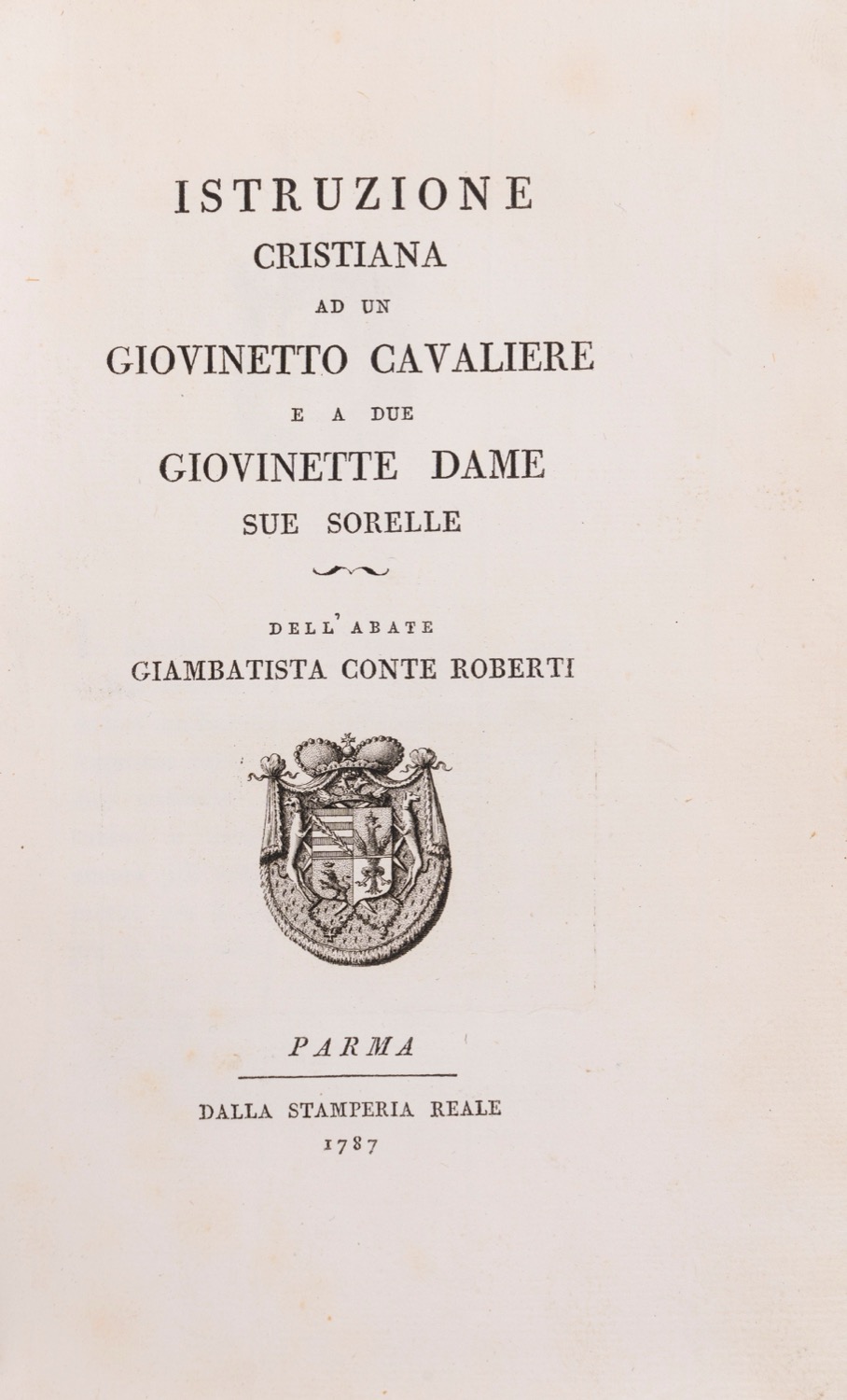 Parma, Dalla Stamperia Reale, 1787. In 8° reale. Vignetta incisa in rame al frontespizio con armi gentilizie, testatina calcografica, legatura coeva in mezza pelle con angoli e carta marmorizzata, autore e titolo impresso in oro al dorso, tagli rossi.Parma, Dalla Stamperia Reale, 1787. In 8° reale. Vignetta incisa in rame al frontespizio con armi gentilizie, testatina calcografica, legatura coeva in mezza pelle con angoli e carta marmorizzata, autore e titolo impresso in oro al dorso, tagli rossi.