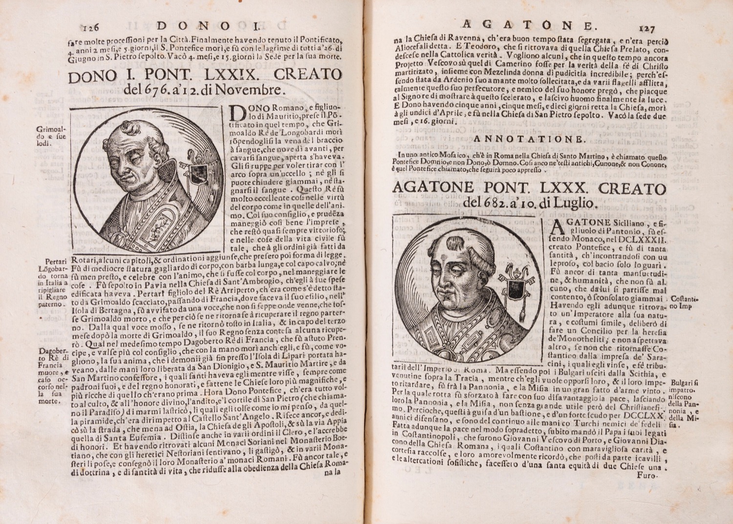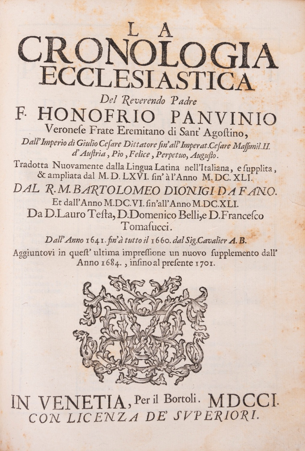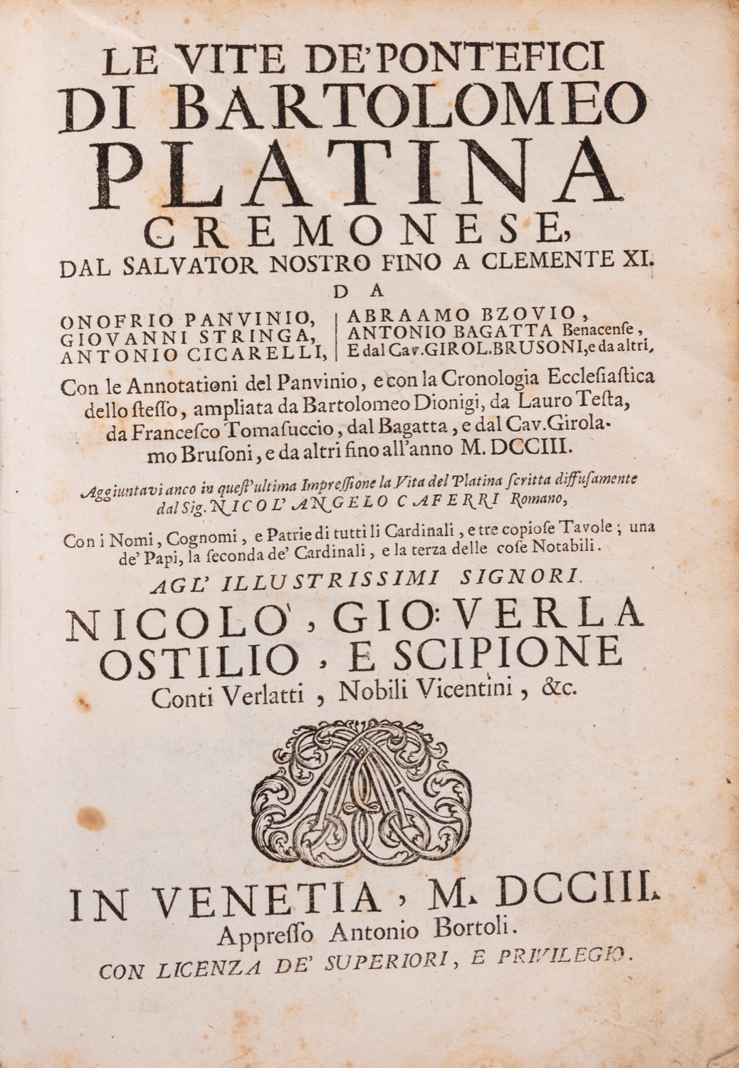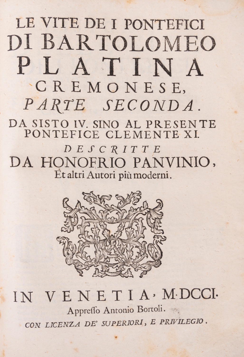 Venezia, Antonio Bortoli, 1703. In 8°. 3 parti in 1 vol. Fregio al frontespizio, numerosi ritratti incisi in legno di pontefici nel testo, fioriture, qualche gora d'acqua, legatura coeva in pergamena, titolo manoscritto al dorso a 5 nervi, lievi difetti. Firma di appartenenza all'occhietto.Venezia, Antonio Bortoli, 1703. In 8°. 3 parti in 1 vol. Fregio al frontespizio, numerosi ritratti incisi in legno di pontefici nel testo, fioriture, qualche gora d'acqua, legatura coeva in pergamena, titolo manoscritto al dorso a 5 nervi, lievi difetti. Firma di appartenenza all'occhietto.