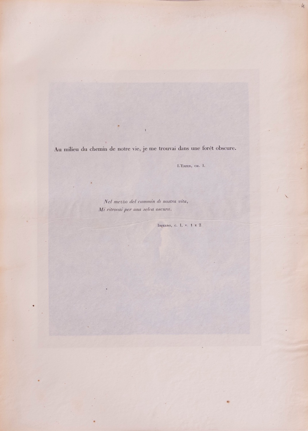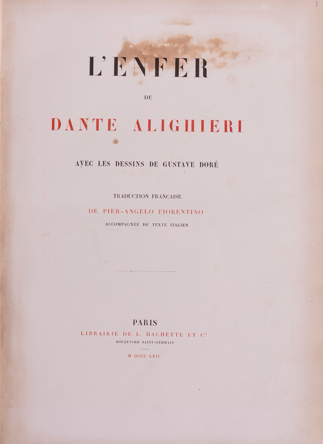 Paris, Hachette, 1862. In 2°. 420 x 310 mm. Ritratto di Dante inciso da Pannemaker, 75 grandi tavole del Dorè incise su base colorata, macchia al margine superiore del ritratto di Dante, legatura in tela rossa originale, con titoli oro e impressioni a secco. Paris, Hachette, 1862. In 2°. 420 x 310 mm. Ritratto di Dante inciso da Pannemaker, 75 grandi tavole del Dorè incise su base colorata, macchia al margine superiore del ritratto di Dante, legatura in tela rossa originale, con titoli oro e impressioni a secco.