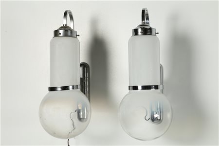 SCIOLARI GAETANO Lotto composto da n. 2 appliques. Acciaio, vetro. Cm 30,00 x 47,00 x 30,00. Anni '60.