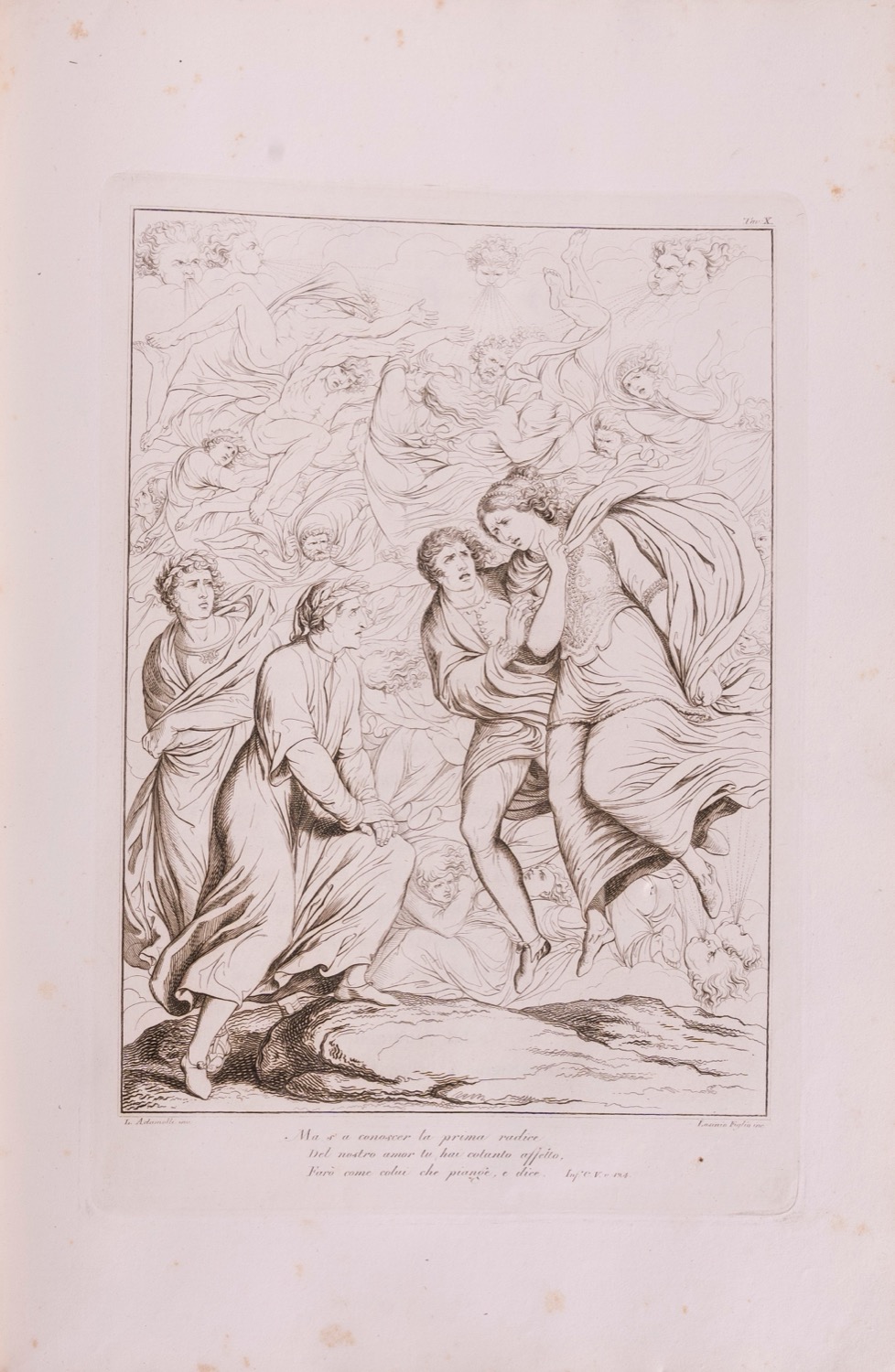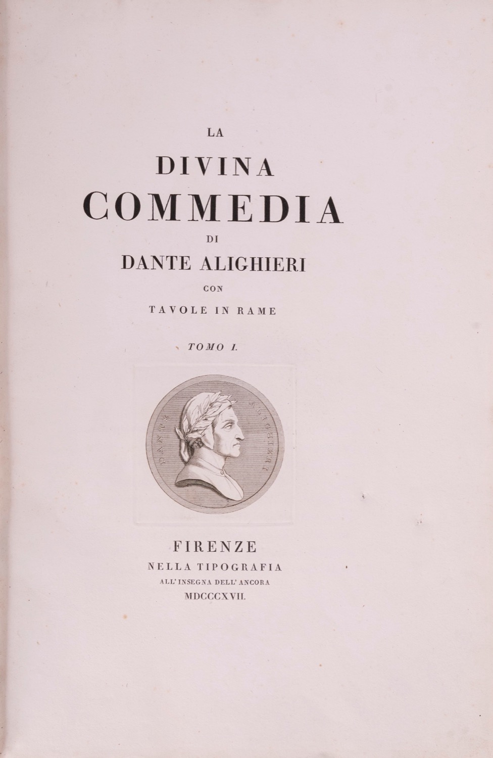 Firenze, nella tipografia all'insegna dell'Ancora, 1817-1819. In 2°. 490 x 320 mm. 4 voll. Vol. 1: [viii] 208 pp. e XLIV tavole calcografiche. Vol. 2: [iv] 210 [2] pp. e XL tavole calcografiche. Vol. 3: [iv] 206 [2] pp. e XLI tavole calcografiche. Vol. 4: [iv] xi [1] 251 [1] pp. Ritratto calcografico di Dante ai tre frontespizi, lievi fioriture marginali, legatura in mezza pelle e cartone. Ex-libris con motto "Adversis perfugium, secundis ornamentum” dello storico e paleografo siciliano, Raffaele Starrabba (1834-1906).Firenze, nella tipografia all'insegna dell'Ancora, 1817-1819. In 2°. 490 x 320 mm. 4 voll. Vol. 1: [viii] 208 pp. e XLIV tavole calcografiche. Vol. 2: [iv] 210 [2] pp. e XL tavole calcografiche. Vol. 3: [iv] 206 [2] pp. e XLI tavole calcografiche. Vol. 4: [iv] xi [1] 251 [1] pp. Ritratto calcografico di Dante ai tre frontespizi, lievi fioriture marginali, legatura in mezza pelle e cartone. Ex-libris con motto "Adversis perfugium, secundis ornamentum” dello storico e paleografo siciliano, Raffaele Starrabba (1834-1906).