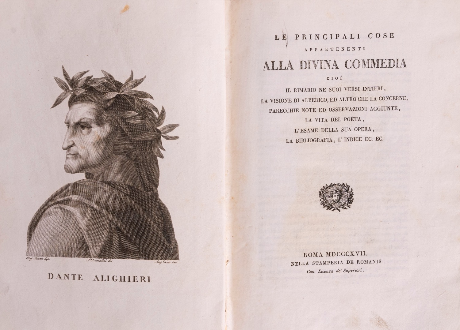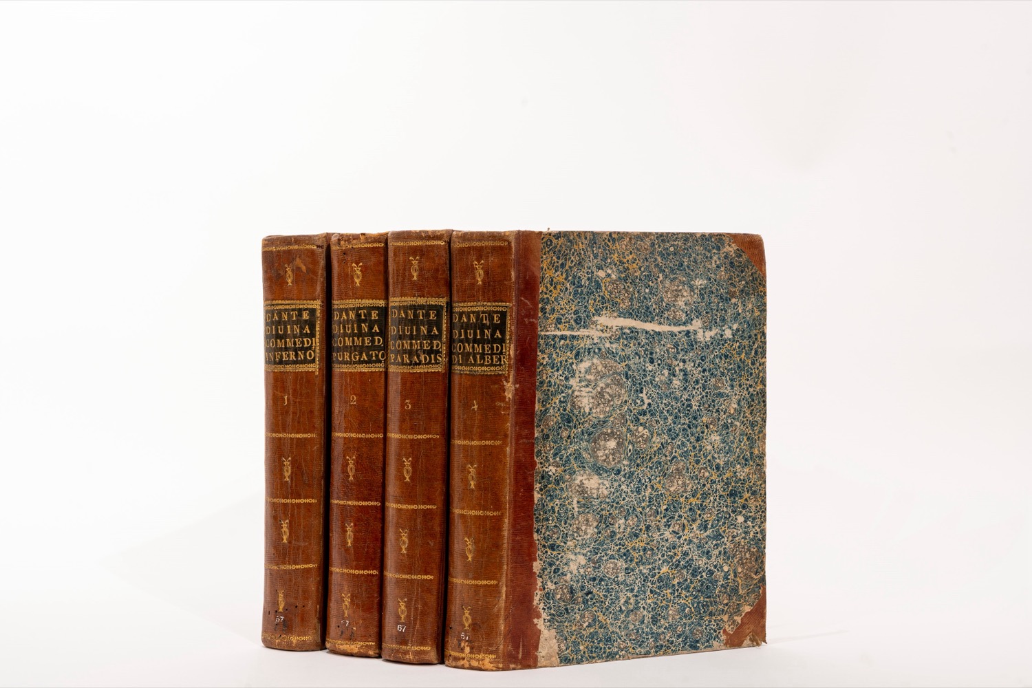 Roma, Stamperia De Romanis 1815 - 1817. In 4°. 4 voll. Con un ritratto del Poeta disegnato da Durantini e inciso da Angelo Testa e tre stampe rappresentanti i tre regni ad apertura di ciascuna cantica, lievi fioriture, legatura coeva in mezza pelle a cartone marmorizzato. Roma, Stamperia De Romanis 1815 - 1817. In 4°. 4 voll. Con un ritratto del Poeta disegnato da Durantini e inciso da Angelo Testa e tre stampe rappresentanti i tre regni ad apertura di ciascuna cantica, lievi fioriture, legatura coeva in mezza pelle a cartone marmorizzato.
