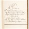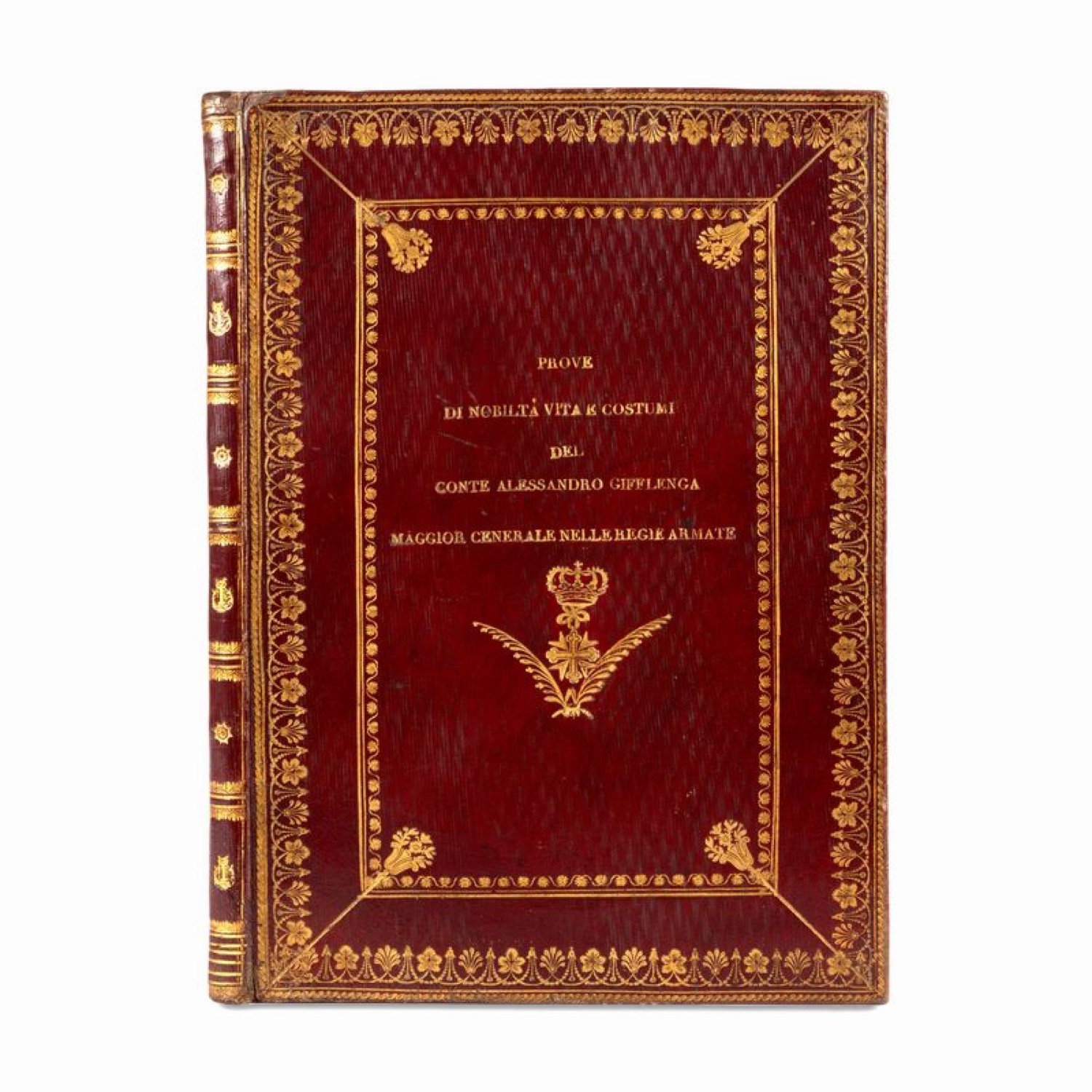 Splendido manoscritto cartaceo di 30 cc., 290 x 205 mm., preceduto da un doppio foglio pergamenaceo con l'albero genealogico del Conte Alessandro de Rege, vergato in elegante cancelleresca ottocentesca, SPETTACOLARE LEGATURA IN MAROCCHINO ROSSO A GRANA LUNGA, con cornici dorate a filetti ed elementi floreali, in cui campeggia al centro il titolo del documento impresso in oro che sovrasta la croce dell'Ordine di Santi Maurizio e Lazzaro. Ex libris al contropiatto della marchesa Cusani Scarampi; tassello in alto a sinistra della libreria Bredford. Splendido manoscritto cartaceo di 30 cc., 290 x 205 mm., preceduto da un doppio foglio pergamenaceo con l'albero genealogico del Conte Alessandro de Rege, vergato in elegante cancelleresca ottocentesca, SPETTACOLARE LEGATURA IN MAROCCHINO ROSSO A GRANA LUNGA, con cornici dorate a filetti ed elementi floreali, in cui campeggia al centro il titolo del documento impresso in oro che sovrasta la croce dell'Ordine di Santi Maurizio e Lazzaro. Ex libris al contropiatto della marchesa Cusani Scarampi; tassello in alto a sinistra della libreria Bredford.