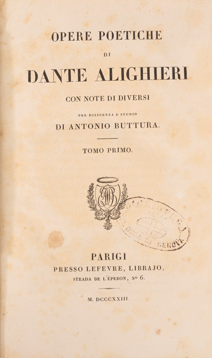 Dante Alighieri (Firenze 1265 - Ravenna 1321) - Opere poetiche di Dante Alighieri, con note di diversi per diligenza e studio di Antonio Buttura (…)