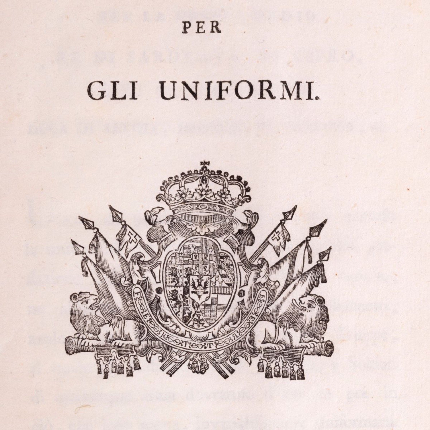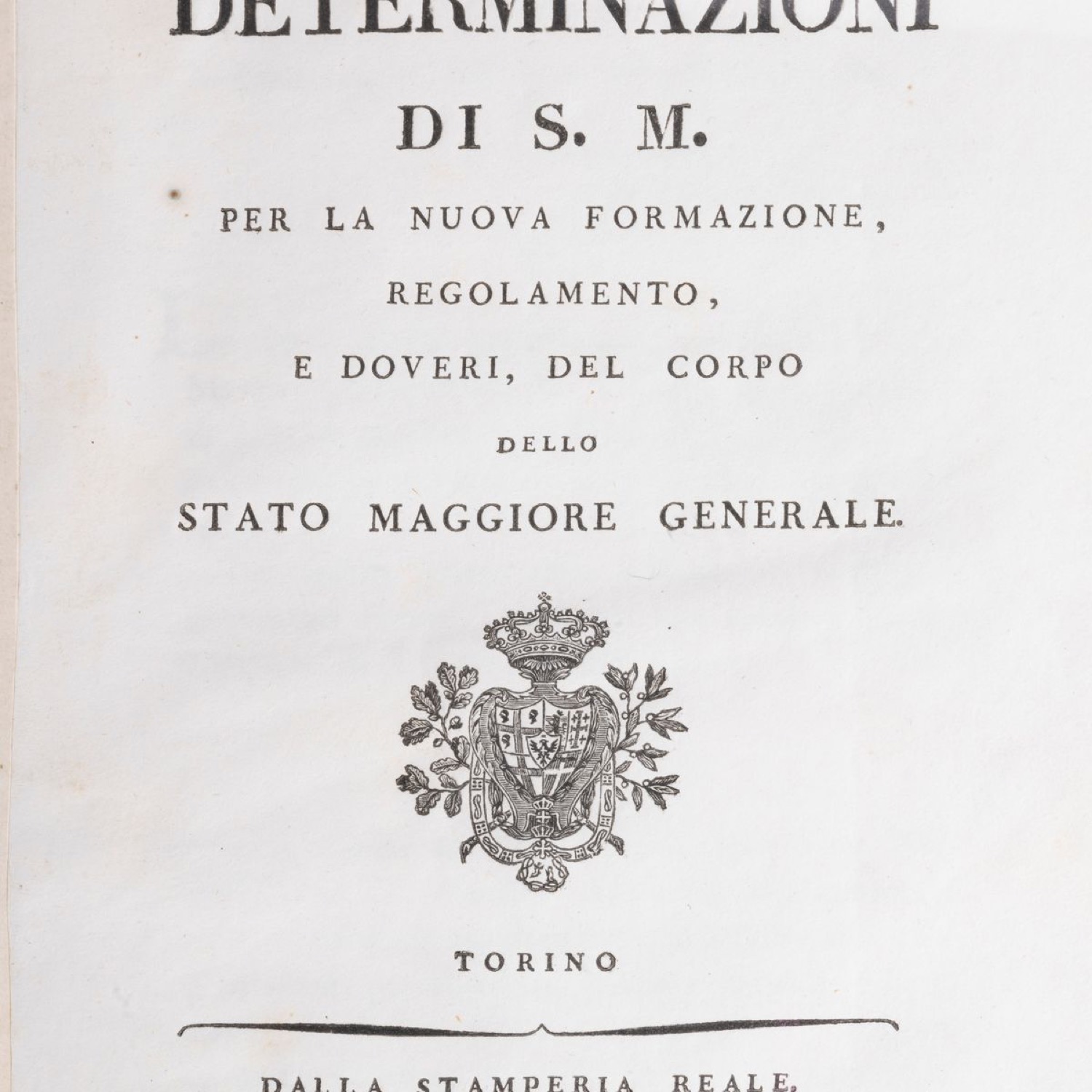 Torino, dalla stamperia reale, 1814. In 4°. Al frontespizio grande stemma di Casa Savoia, legatura in marocchino verde con cornice in oro ai piatti, difetto al piatto inferiore. § Determinazioni di S.M. per la nuova formazione, regolamento, e doveri, del corpo dello stato maggiore generale, Torino, dalla stamperia reale, s.d., In 4°. Al frontespizio grande stemma di Casa Savoia, medesima legatura dell'opera precedente.Torino, dalla stamperia reale, 1814. In 4°. Al frontespizio grande stemma di Casa Savoia, legatura in marocchino verde con cornice in oro ai piatti, difetto al piatto inferiore. § Determinazioni di S.M. per la nuova formazione, regolamento, e doveri, del corpo dello stato maggiore generale, Torino, dalla stamperia reale, s.d., In 4°. Al frontespizio grande stemma di Casa Savoia, medesima legatura dell'opera precedente.