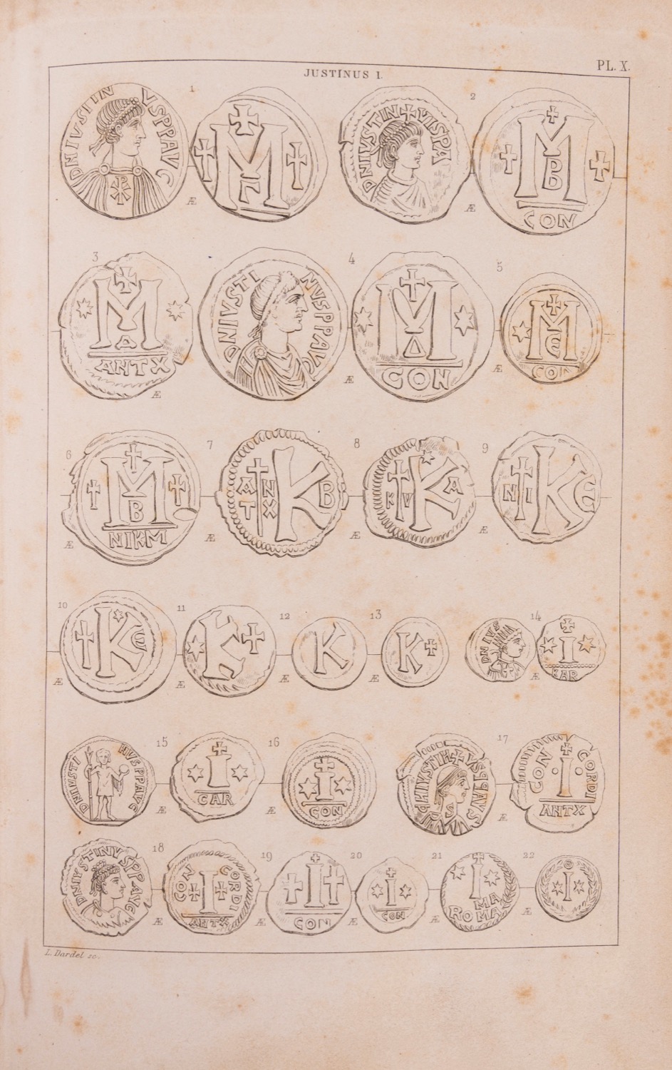 Parigi e Londra, Rollin et Feuardent e M. Curt, 1862. In-4°, legatura moderna in mezza pergamena con piatti in carta marmorizzata, titolo dorato su tassello al dorso, brossure editoriali originali conservate nella legatura; 2 volumi; 33 tavole con illustrazioni di monete bizantine al volume I, 36 tavole al volume II. Ampi margini, fioriture sporadiche in entrambi i volumi, più diffuse nelle tavole del volume I. Opera in buone condizioni generali.Parigi e Londra, Rollin et Feuardent e M. Curt, 1862. In-4°, legatura moderna in mezza pergamena con piatti in carta marmorizzata, titolo dorato su tassello al dorso, brossure editoriali originali conservate nella legatura; 2 volumi; 33 tavole con illustrazioni di monete bizantine al volume I, 36 tavole al volume II. Ampi margini, fioriture sporadiche in entrambi i volumi, più diffuse nelle tavole del volume I. Opera in buone condizioni generali.
