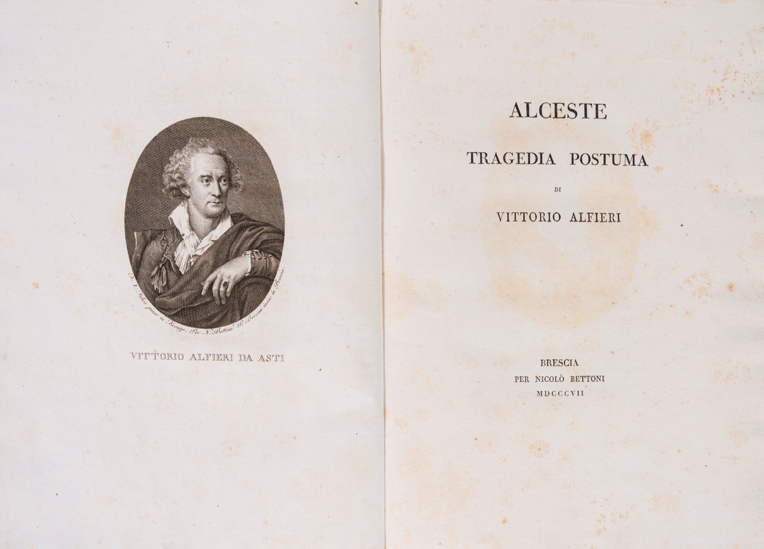 Brescia, Nicolo Bettoni, 1807. In 4° . Antiporta incisa in rame con ritratto dell'Alfieri di Fabre e inciso da N. Bettoni e P. Becceni, lievi fioriture, legatura coeva in cartoncino rigido, lievi difetti.Brescia, Nicolo Bettoni, 1807. In 4° . Antiporta incisa in rame con ritratto dell'Alfieri di Fabre e inciso da N. Bettoni e P. Becceni, lievi fioriture, legatura coeva in cartoncino rigido, lievi difetti.