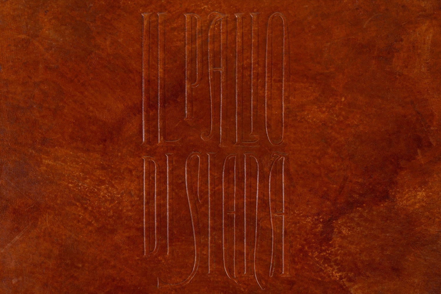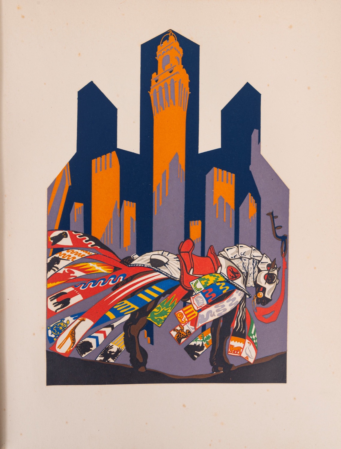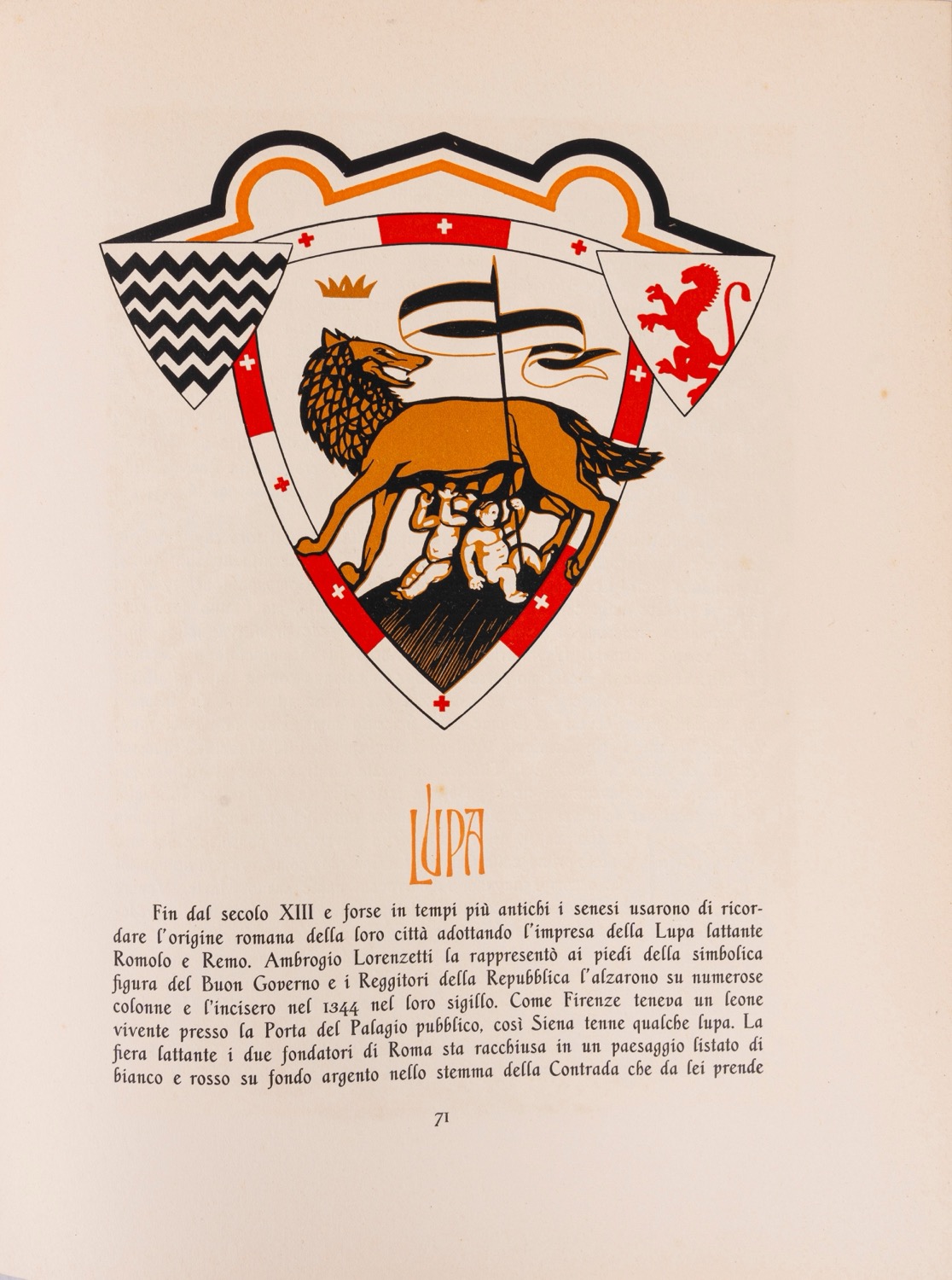 Roma, Societa Editrice di " Novissima", [1932]. In 2°. Con numerose xilografie policrome, molte delle quali a piena pagina, con le rappresentazioni dei simboli delle contrade e dei vari momenti del Palio tirate da Carlucci e Bagarone su carta Miliani Fabriano, rare e lievissime fioriture, legatura editoriale in piena pelle con titolo e stemma impressi a secco con finiture in tessuto colorato al piatto anteriore e rappresentazione di leone, sempre a secco, a quello posteriore, sguardie decorate, qualche abrasione.Roma, Societa Editrice di " Novissima", [1932]. In 2°. Con numerose xilografie policrome, molte delle quali a piena pagina, con le rappresentazioni dei simboli delle contrade e dei vari momenti del Palio tirate da Carlucci e Bagarone su carta Miliani Fabriano, rare e lievissime fioriture, legatura editoriale in piena pelle con titolo e stemma impressi a secco con finiture in tessuto colorato al piatto anteriore e rappresentazione di leone, sempre a secco, a quello posteriore, sguardie decorate, qualche abrasione.