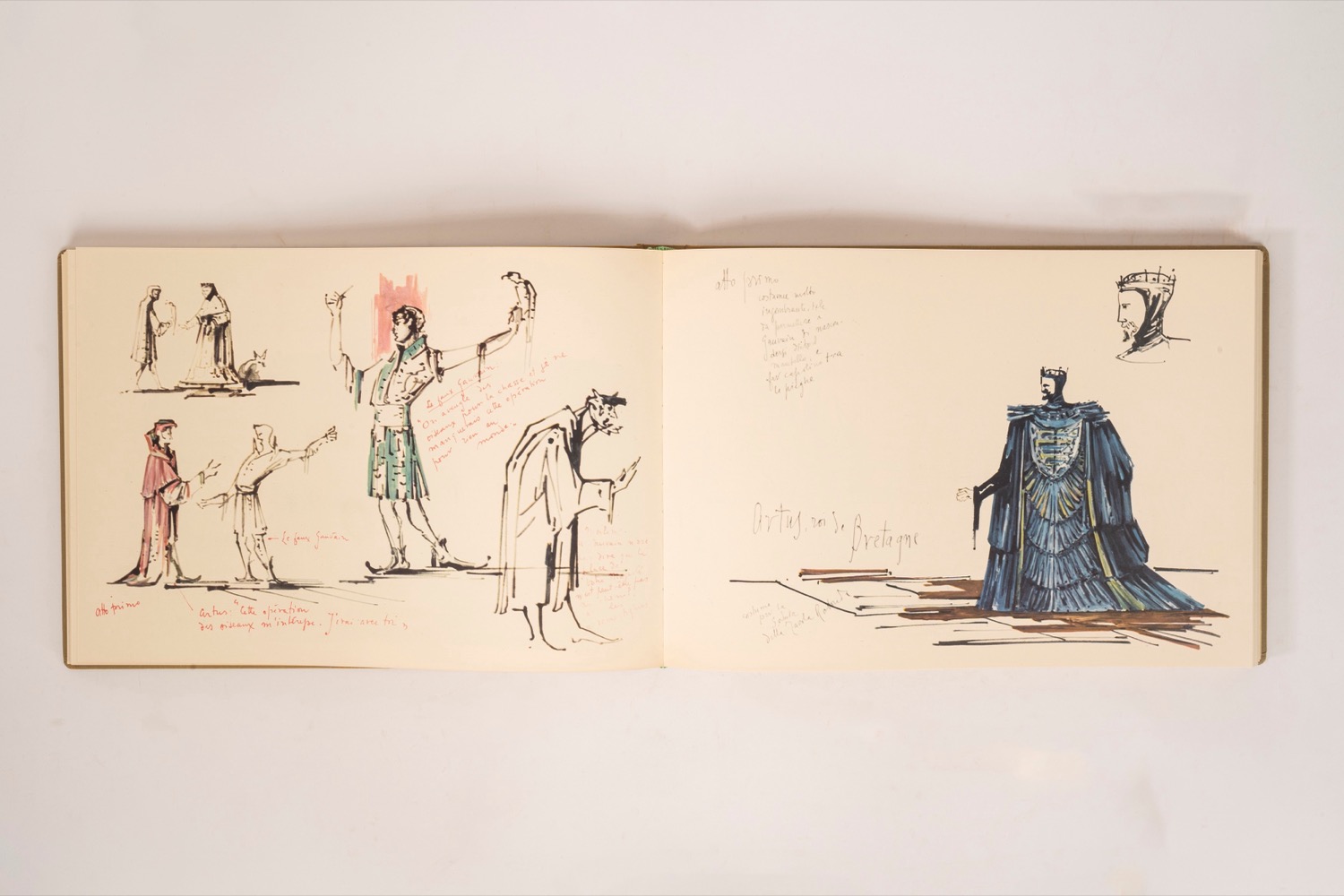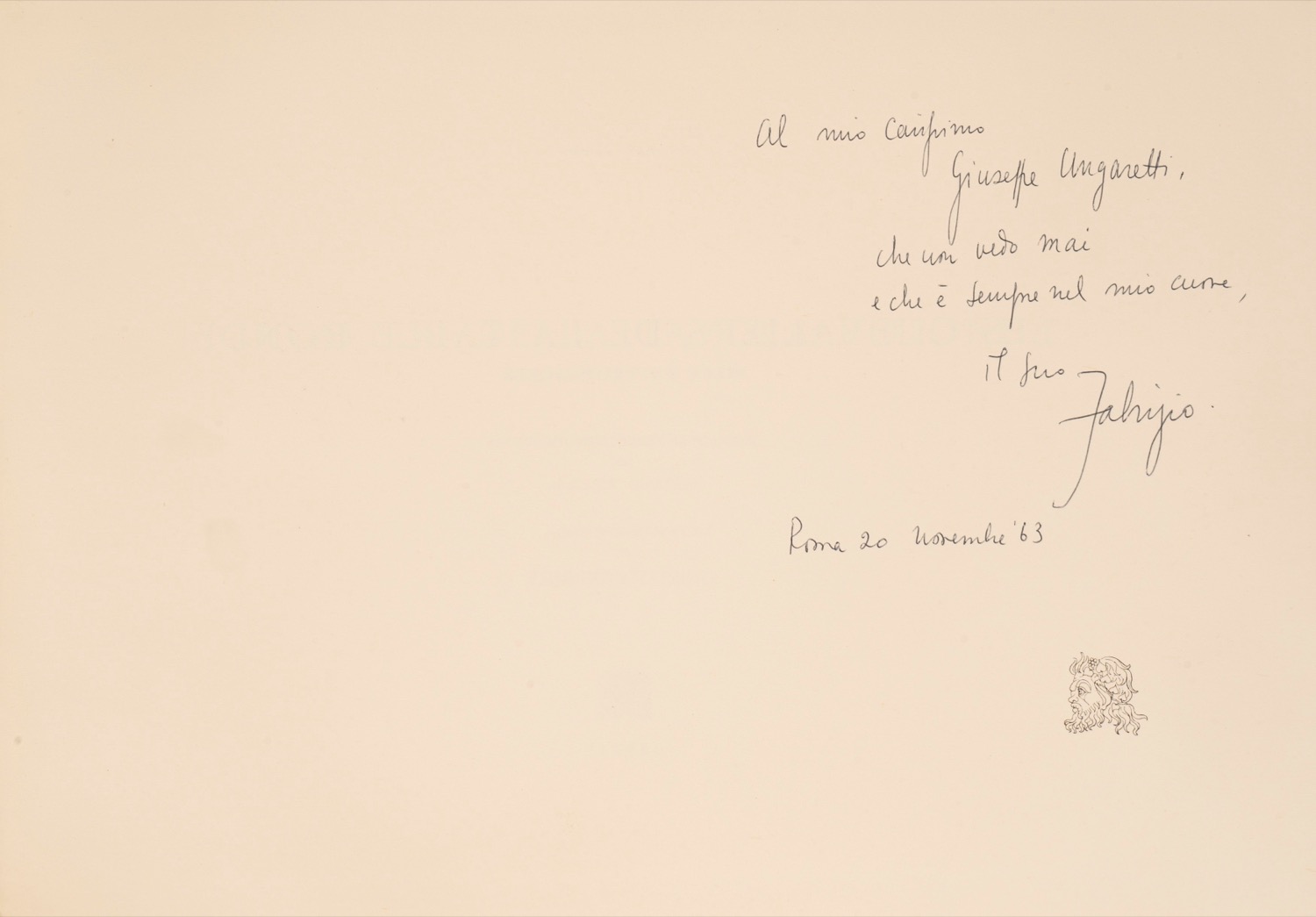 Roma, Canesi, 1963. Album in folio oblungo. BELLISSIMA E SENTITA DEDICA DI CLERICI A UNGARETTI. Con numerose illustrazioni a colori che che riproducono appunti, disegni e tempere di Fabrizio Clerici per le scene e i costumi di "Les Chevaliers de la Table Ronde" di Jean Cocteau, testo italiano e francese. Legatura in tutta tela con disegno in verde al piatto anteriore, custodia in cartonato con illustrazioni a colori, piccoli strappi al dorso della legatura.Roma, Canesi, 1963. Album in folio oblungo. BELLISSIMA E SENTITA DEDICA DI CLERICI A UNGARETTI. Con numerose illustrazioni a colori che che riproducono appunti, disegni e tempere di Fabrizio Clerici per le scene e i costumi di "Les Chevaliers de la Table Ronde" di Jean Cocteau, testo italiano e francese. Legatura in tutta tela con disegno in verde al piatto anteriore, custodia in cartonato con illustrazioni a colori, piccoli strappi al dorso della legatura.