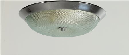 MANIFATTURA DEL XX SECOLO Plafoniera. Metallo cromato e vetro. Cm 34,00 x 6,00 x 34,00. Anni '60.