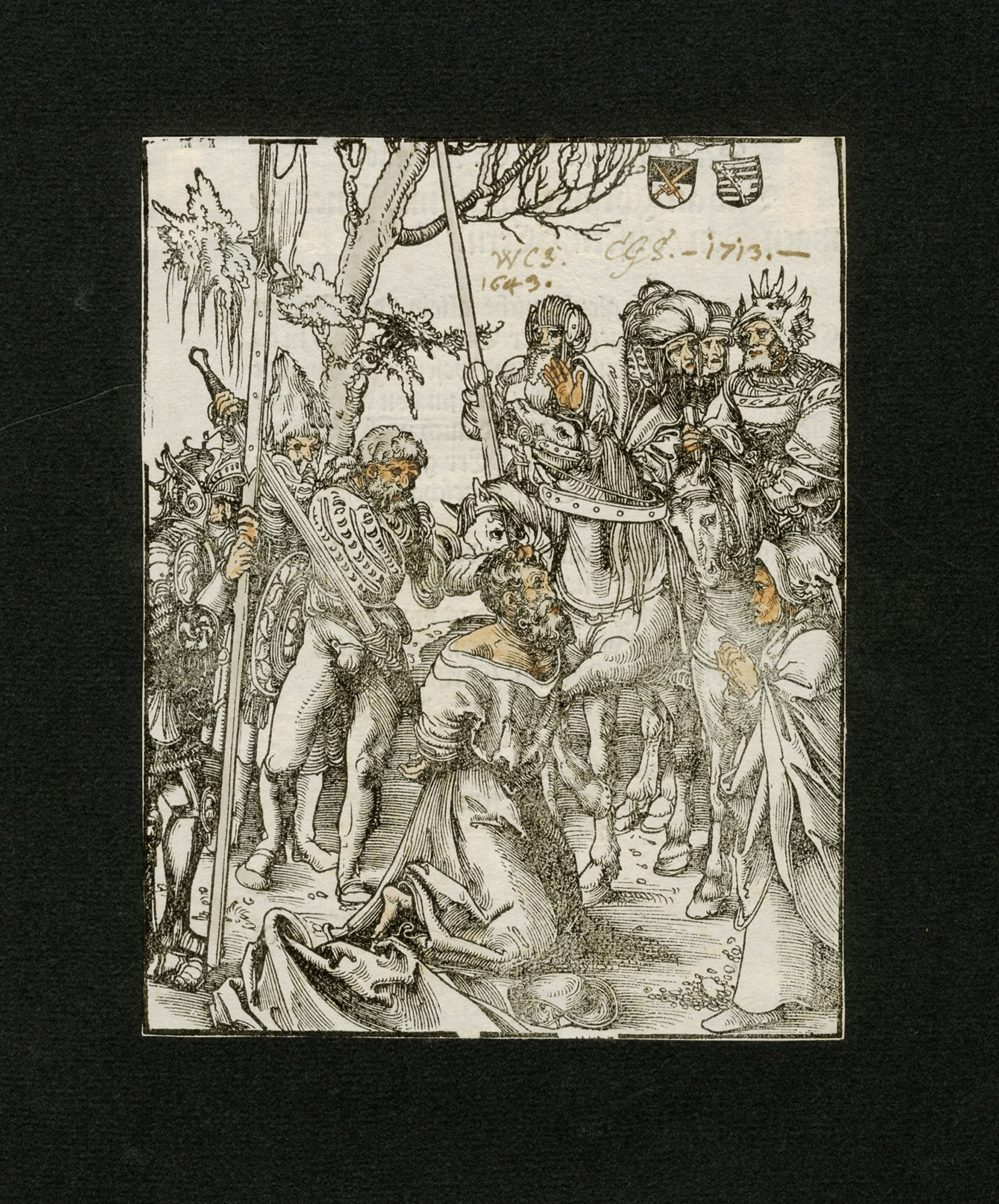 Xilografia e acquerello rosa. mm 163/166x128. Bartsch, XI, 39 e 46. Hollstein, 55 e 62. Dalla serie Il martirio dei dodici apostoli (Hollstein, 53-64). Su entrambi i fogli marchio di collezione non identificato "WCS CGS" con la data "1713" a penna e inchiostro bruno (Lugt, 5715). Buone impressioni su carta vergellata, la tavola con il Martirio di san Giacomo Maggiore presenta testo tedesco al verso, quella con il Martirio di san Simone Zelota è priva di testo e impressa su carta più spessa con buon gauffrage al verso. (2) Entrambi gli esemplari sono fissati per due punti in alto su cartoncino nero moderno e presentano margini sottili/piccoli oltre la linea d'inquadramento.