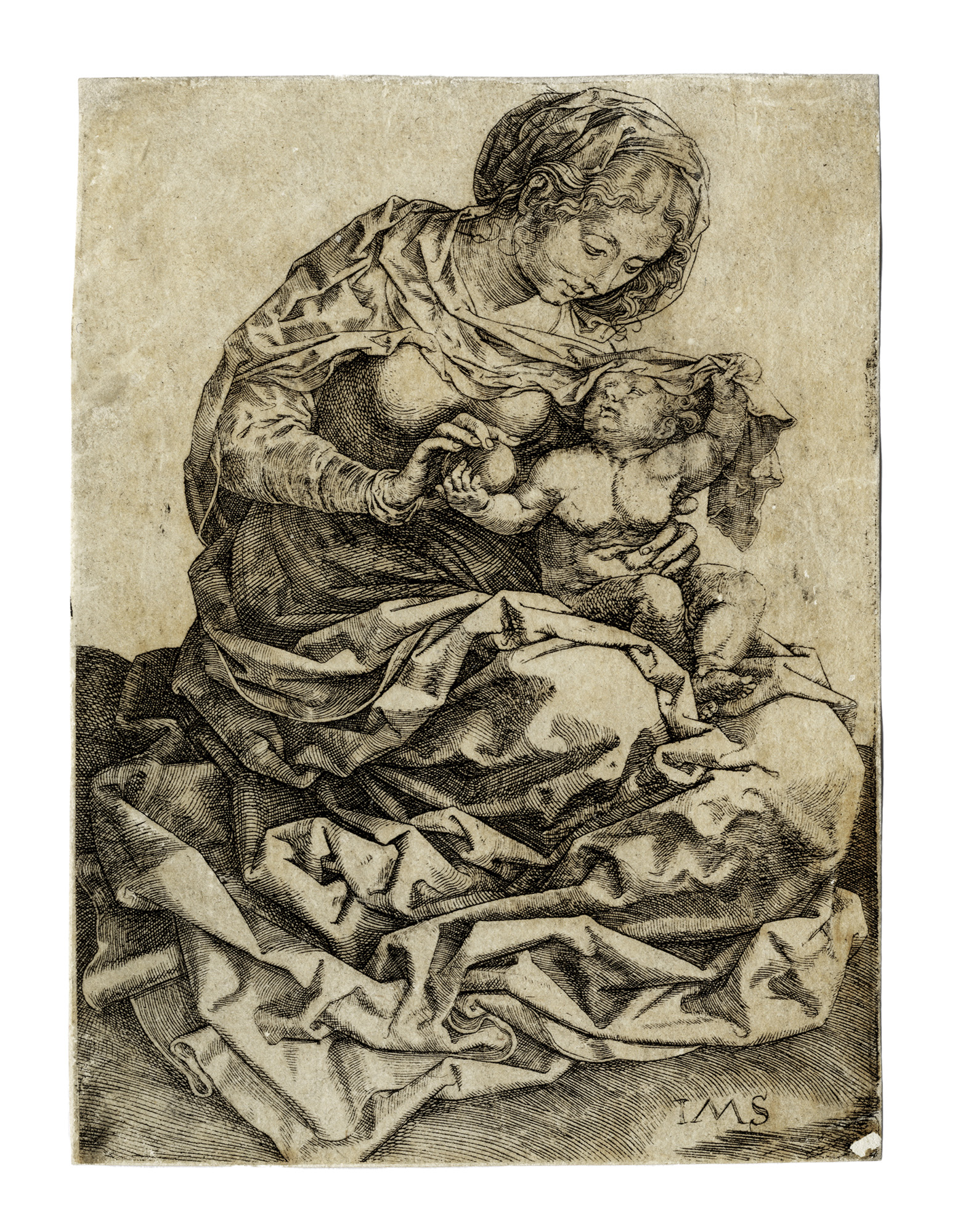 Bulino. mm 137x98. Bartsch, VII, 2. Hollstein, 3. von heusinger (2001), p. 60, figg. 38, 39. Aynsworth, 113. Sulla lastra in basso a destra il monogramma "IMS". Bella prova di questa rarissima incisione nel I stato di 2, avanti l'aggiunta di tratti orizzontali sul fondo (nel presente I stato il fondo è completamente vuoto), e della rimozione del monogramma. La critica recente avanza l'ipotesi che la cancellazione del monogramma indichi che il secondo stato sia stato creato dopo che la lastra non fosse più in utilizzo da parte di Gossaert, e che questa seconda variante potrebbe datare addirittura dopo la morte dell'autore. Bibliografia: Christian von Heusinger, Karl V. von Gossaert: eine unbeschriebene Inkunabel der niederländischen Radierung im Herzog Anton Ulrich-Museum Braunschweig, in "Jahrbuch des Kunsthistorischen Museums Wien. Bd. 2", 2001. Maryan W. Aynsworth (Editor), Man, Myth, and Sensual Pleasures: Jan Gossart's Renaissance. The Complete Works, New York-New Haven-London, 2010 (1) Esemplare rifilato all'impronta. Presenza di vecchio restauro agli angoli in alto. Alcuni strappi, fragilità e minime mancanze lungo le estremità del foglio risolte con controfondatura. Un'abrasione all'angolo in basso a destra e altre puntiformi nell'inciso.