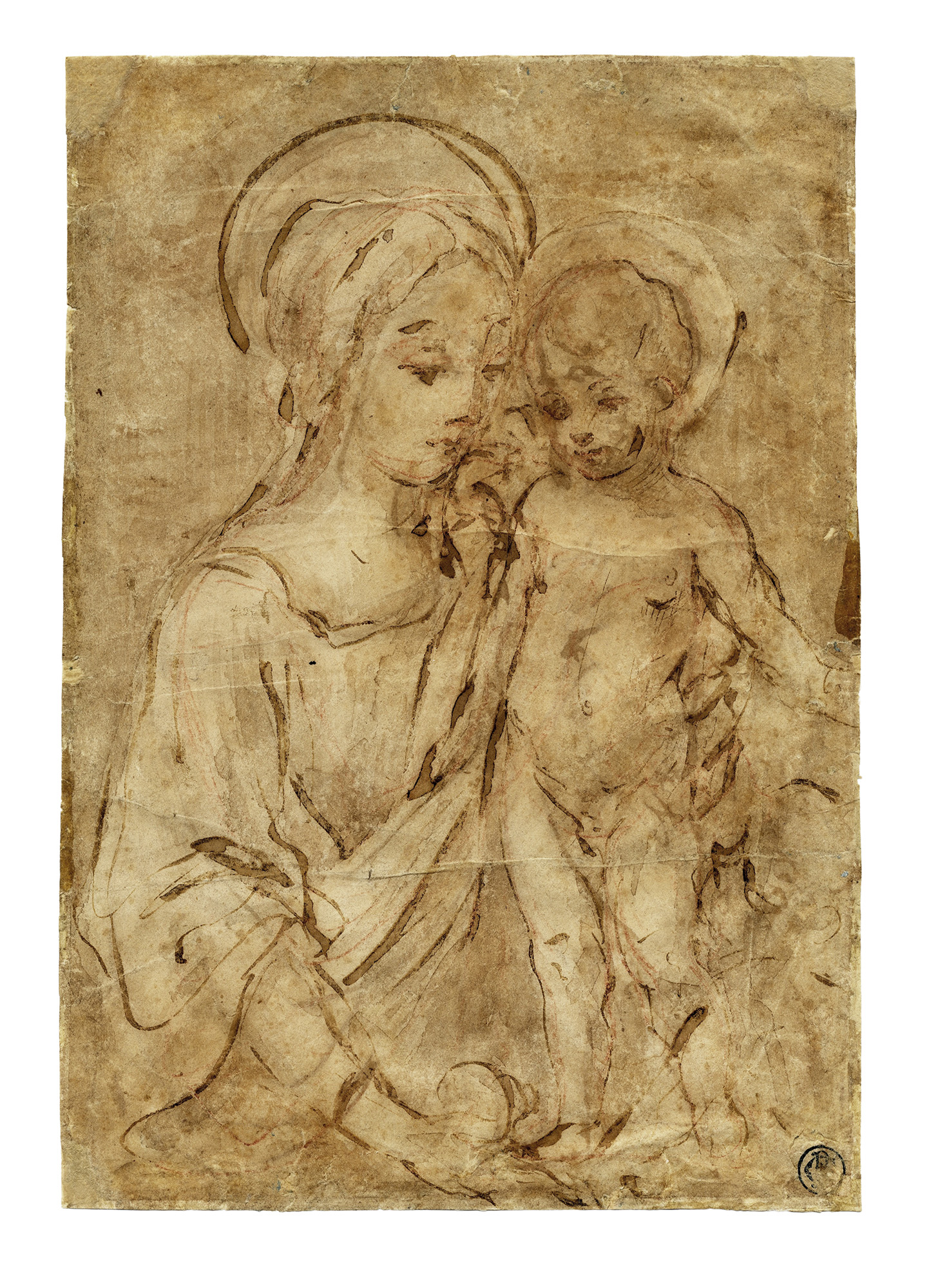 Penna e inchiostro bruno, pennello e acquerello bruno, su traccia di matita rossa, carta avorio. mm 253x178. Al verso disegno per la medesima composizione. Penna e inchiostro bruno, pennello e acquerello bruno, sfumino rosso su una traccia a matita rossa. Al recto in basso a destra marchio di collezione non identificato, forse Corrado Ricci (1858 - 1935 ca.) (lugt, 632). Il disegno è accompagnato da expertise del Prof. Marco Ciampolini. (1) Segni del tempo.