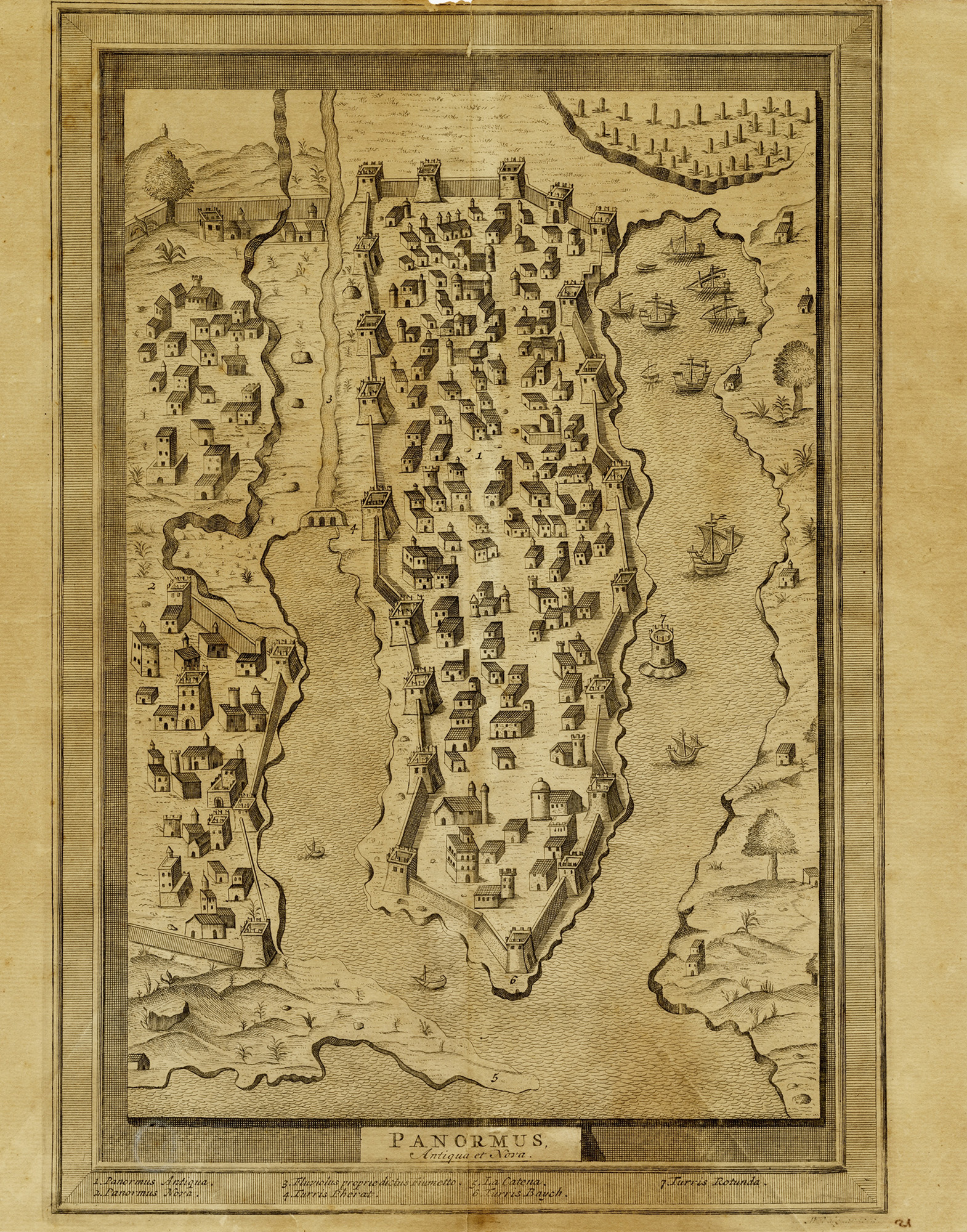 Incisione in rame. mm 338x233. Foglio: mm 350x295. Mappa tratta da quella incisa da Giovanni Battista Maringo originariamente inserita nel volume di Mariano Valguarnera, Discorso dell'origine ed antichità di Palermo e de' primi abitatori della Sicilia, e dell'Italia, Palermo: Per Gio. Battista Maringo, 1614. Quella presente proviene dalla traduzione latina del volume del Valguarnera a opera di Johann Lorenz von Mosheim (Lubecca,1693 - Gottinga,1755), dal titolo Thesaurus Antiquitatum et Historiarum Siciliae, Quo continentur ..., Volumen decimum tertium..., Leida, 1725. Rara veduta della Palermo antica, in gran parte mancante dalle pubblicazioni nelle quali la si trovava inserita, che mirava a ricreare nell' immagine prospettica l'adattamento urbano preistorico, punico, grecoromano. (1) Esemplare con ampi margini laterali, buon margine in basso e rifilato alla battuta quello in alto. Foglio brunito lievemente fragile. Mancanza di carta in basso al centro. Piega verticale di legatura, aperta alle estremità per breve tratto, con residuo di brachetta al verso. Traccia di piega trasversale in basso a sinistra. Minori difetti.