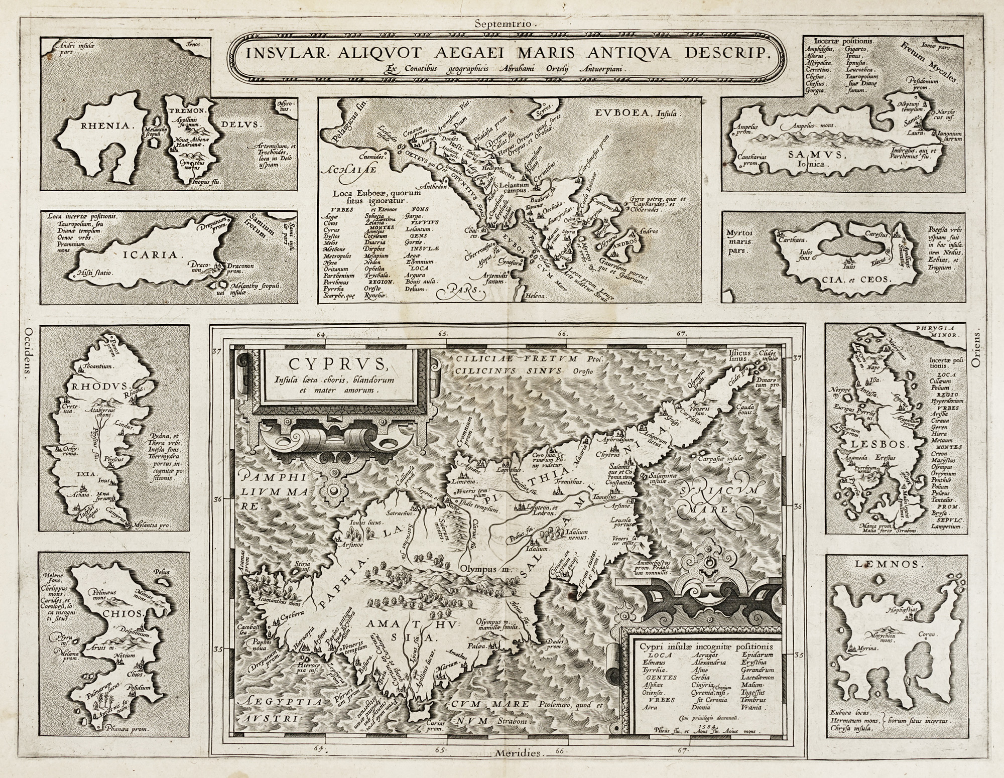 Incisione in rame. mm 364x472. Foglio: mm 410x540. Testo latino al verso. Bella mappa delle isole Egee con Cipro nel riquadro più grande al centro e da sinistra a destra dall'alto in basso Rhenia con l'isola sacra di Delos, Icaria, Rodi, Chios, Samos, Ceo, Lesbo e Lemnos. In alto sotto il titolo l'Eubea. Dall'edizione latina del 1592 del Theatrum Orbis Terrarum. (1) Foglio con margini come in origine. Piega di legatura in verticale al centro aperta in basso per breve tratto. Un minimo strappo all'estremità del lato destro in basso. Lieve ingiallimento del foglio e due minime macchie brune marginali.
