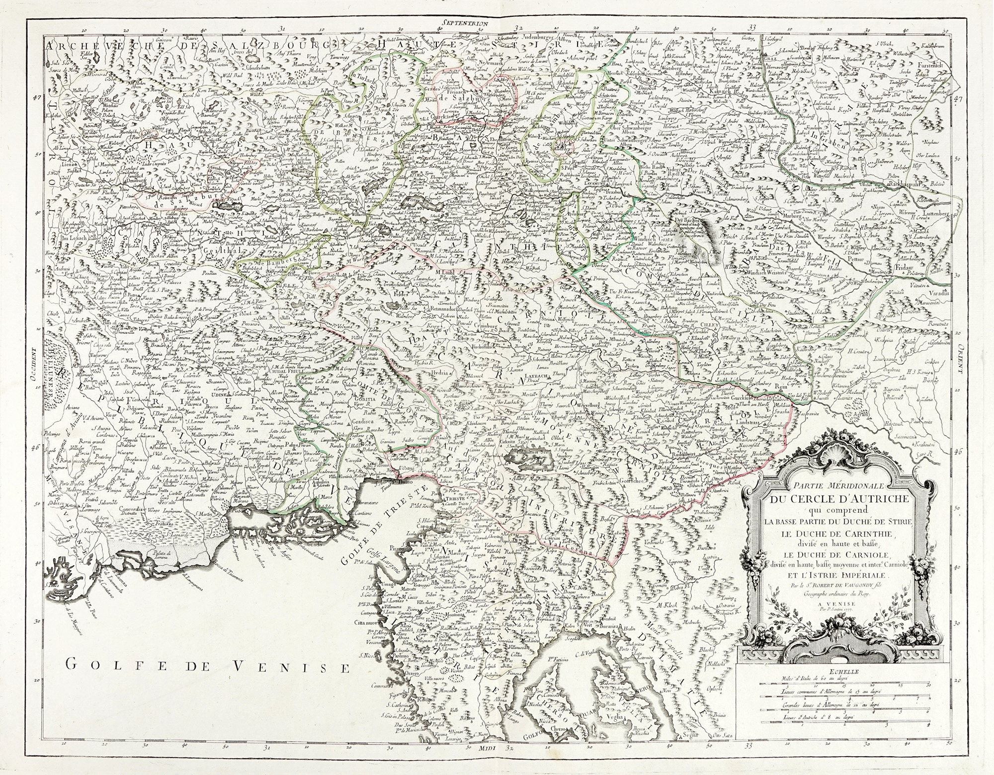 Incisione in rame con confini in coloritura. mm 495x647. Foglio: mm 520x730. Mappa derivata da quella di Gilles e Didier Robert de Vaugondy, tratta da Atlas universel dressé sur les meilleures cartes modernes, grande atlante in due volumi edito tra il 1776 e il 1784 da don Paolo Santini con il fratello Francesco per i Remondini, che rappresenta uno dei più significativi esempi di atlante universale stampato nel '700 in Italia. Carta significativa per la sua rappresentazione dettagliata di un'area strategicamente importante durante un periodo tumultuoso della storia europea. Costituisce un prezioso documento storico per comprendere le dinamiche geopolitiche e le rivendicazioni territoriali della fine del XVIII secolo. SI AGGIUNGE: Id., Partie Méridionale du Cercle d'Autriche qui comprend la Basse Partie du Duché de Stirie, le Duché de Carinthie,..., et l'Istrie Impériale. À Venise: Par P. Santini, 1777. Incisione in rame con confini in coloritura. mm 494x638. Foglio: mm 520x733.