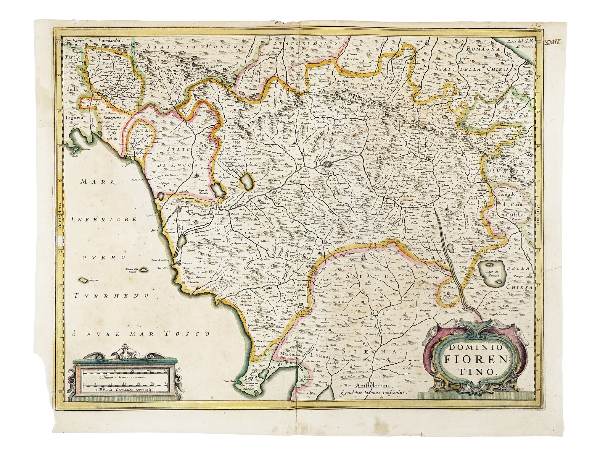 Incisione in rame con confini in coloritura. mm 474x565. Foglio: mm 520x728. Mappa derivata da quella di Gilles e Didier Robert de Vaugondy, tratta da Atlas universel dressé sur les meilleures cartes modernes, grande atlante in due volumi edito da don Paolo Santini con il fratello Francesco per i Remondini, che rappresenta uno dei piu significativi esempi di atlante universale stampato nel '700 in Italia. Le carte, tutte con i confini finemente acquerellati all'epoca, titolo entro ricco cartiglio, toponimi e descrizioni geografiche, sono firmate dal Santini e riprese dai migliori geografi dell'epoca: d'Anville, Bellin, Bonne, Janvier, Robert de Vaugondy, Rizzi-Zannoni, Homann e altri. SI AGGIUNGE: Hendrick Hondius, Dominio Fiorentino. Amstelodami: Excudebat Ioannes Ianssonius. 1640 ca. Incisione in rame in coloritura. mm 385x495. Foglio: mm 410x530. Senza testo al verso. (2) OPERA 1: Il foglio si presenta integro con tre margini come in origine, lievemente resecato l'inferiore, piega verticale di legatura al centro con brachetta al verso. Traccia di piega di stampa in alto a destra. OPERA 2: Difetti (uno strappo al margine destro entro l'inciso, mancanza al margine sinistro nella parte bassa, ingiallimento del foglio, numerosi segni d'uso).