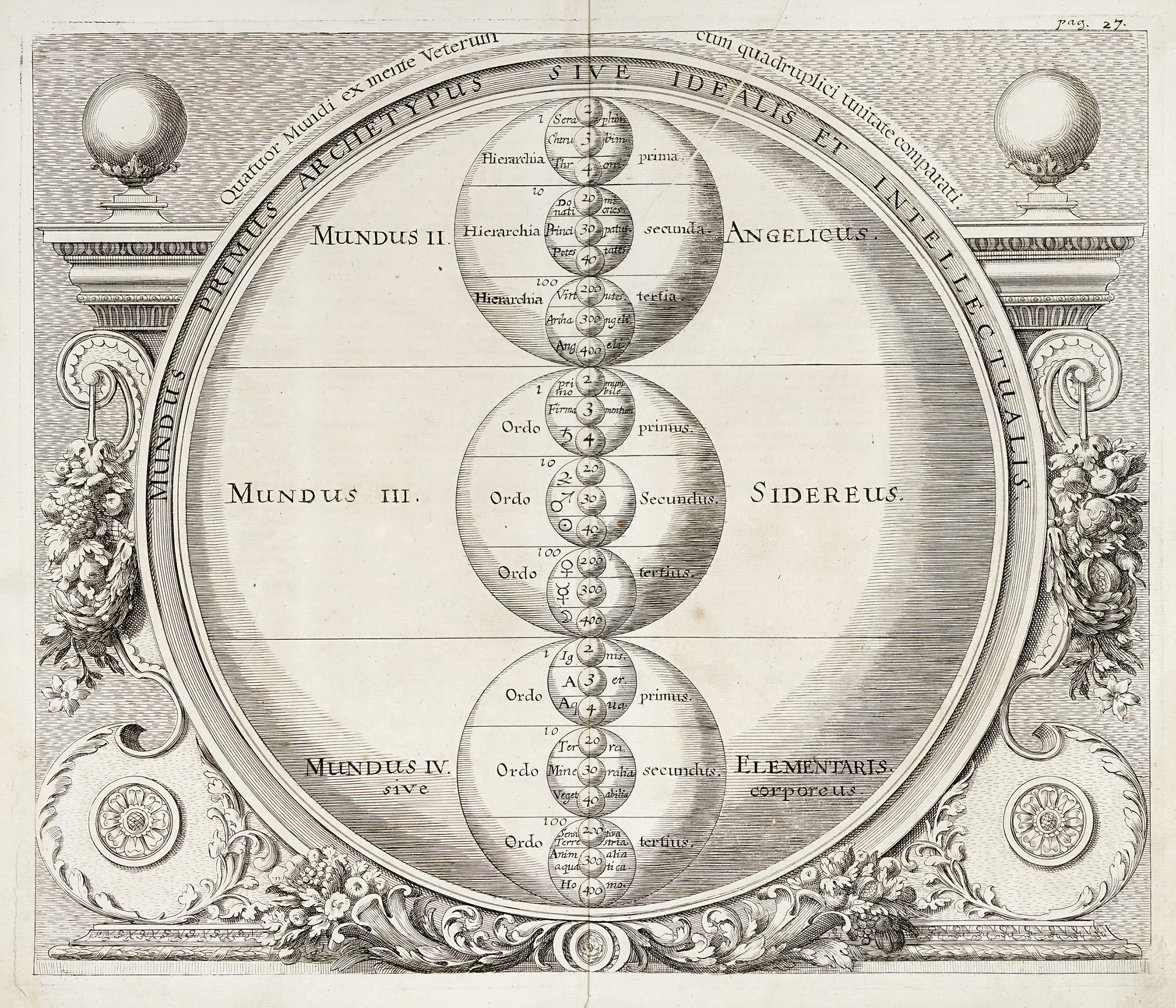 Incisione in rame. mm 360x425. Foglio: mm 402x462. La tavola illustra la filosofia ermetica e l'armonia, l'accordo e la corrispondenza tra i piani fisico, mentale e spirituale. Da Specula physico-mathematico-historica notabilium ac mirabilium sciendorum, in qua mundi mirabilis oeconomia, nec non mirificè amplus, et magnificus ejusdem abditè reconditus, nunc autem ad lucem protractus, ac ad varias perfacili methodo acquirendas scientias in epitomen collectus thesaurus. Nuremberg, Johann Christoph Lochner, 1696. Opera enciclopedica pubblicata in un'unica edizione, compendio di matematica, astronomia, meteorologia, geologia, erudizione e storia naturale, corredata di belle illustrazioni di cosmografia. Riassumeva le teorie di Copernico e Tycho Brahe, ed è stata ritenuta versione condensata delle opere di Athanasius Kircher in quanto Zahn apparteneva all'ordine dei canonici premonstratensi di Herbipolis (l'odierna Würzburg) e fu allievo di Kircher. Le mappe celesti sono tratte da Hevelius, le mappe del sole e della luna da Eimmart e una delle mappe del mondo è tratta proprio da Athanasius Kircher. L'opera contiene alcune incisioni di carattere esoterico, poiché Zahn credeva che i demoni fossero una forza dell'universo e potessero abitare piante o animali. Ideò e creò la camera oscura così come sarà applicata nel suo concetto alle prime macchine fotografiche. Ottimo foglio su carta vergellata sottile con filigrana "braccio armato". (1) Margini come in origine lievemente ingialliti alle estremità. Piega di legatura in verticale al centro, aperta in basso per breve tratto, con brachetta al verso. Due lievi pieghe di stampa in alto al centro.