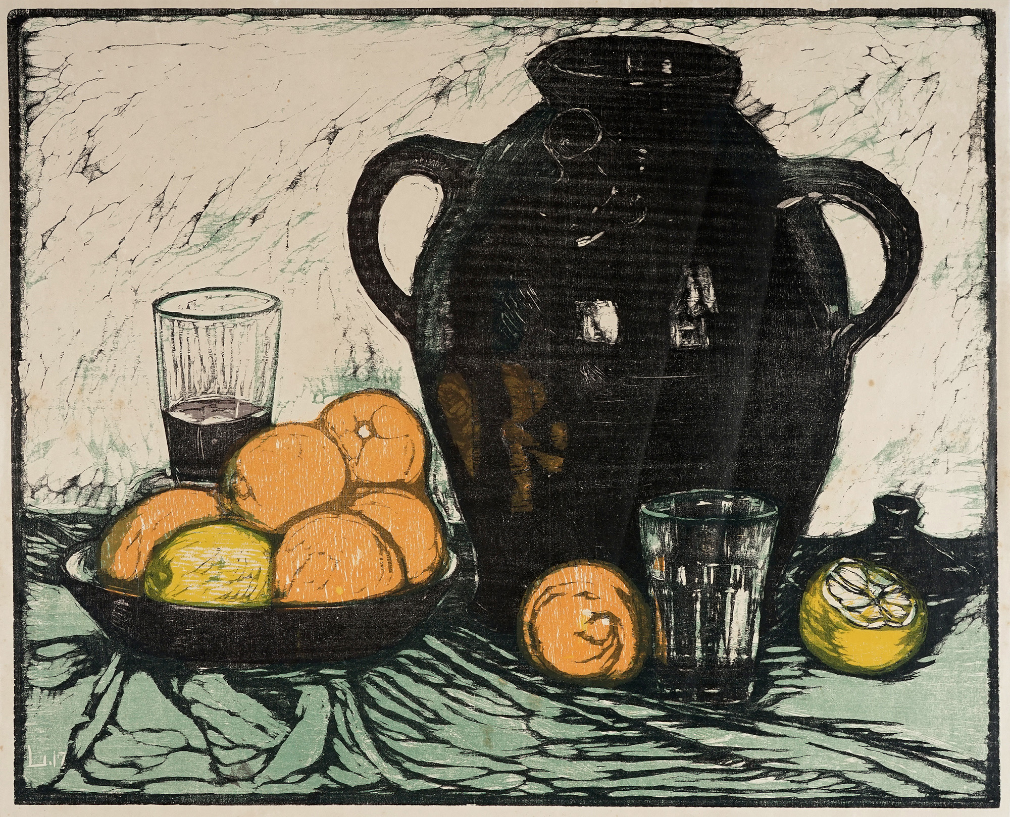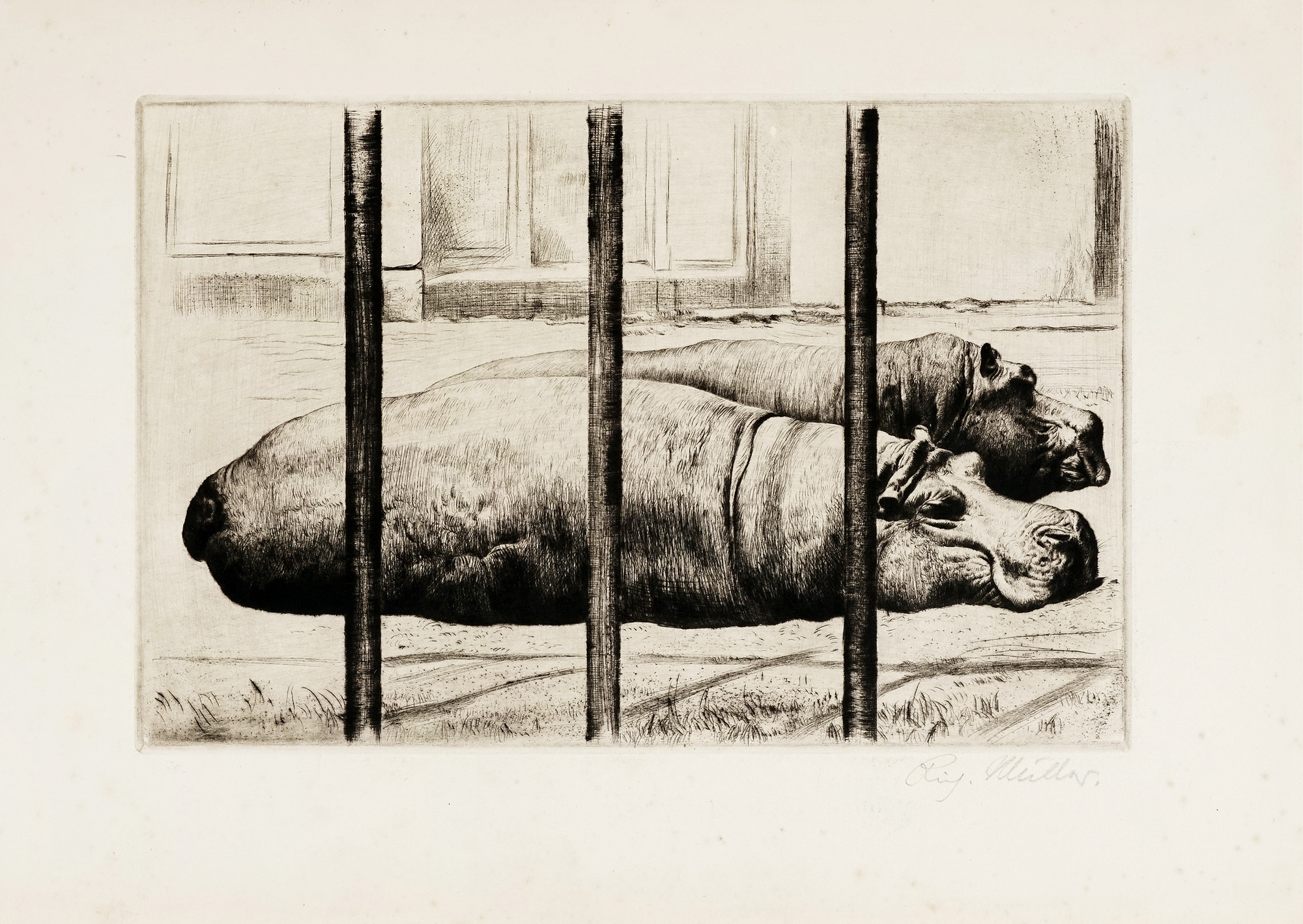 1) Müller R., Zwei Nilpferde (Due ippopotami). 1918. Acquaforte. mm 230x360. Foglio: mm 350x500. Firma a matita in basso a destra. 2) Laage W., Der dunkle Krug. 1917. Xilografia a più legni. mm 397x496. Foglio: mm 423x514. Siglata e datata in lastra in basso a destra. (2) Ottima conservazione.