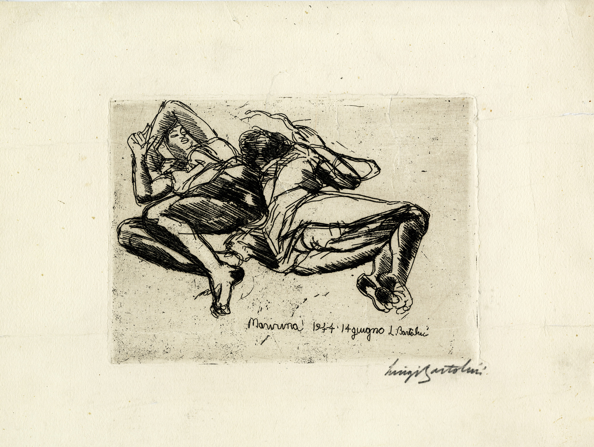 Acquaforte. mm 175x244. Foglio: mm 315x410. Data, firma e "Maurina!" in lastra in basso a destra; controfirma a matita in basso a destra. (1) Pieghe piuttosto profonde che interessano anche la lastra, altrimenti buona conservazione generale. Inchiostrazione brillante e inchiostrazione considerevole. Tracce dei precedenti incollaggi agli angoli superiori del verso.
