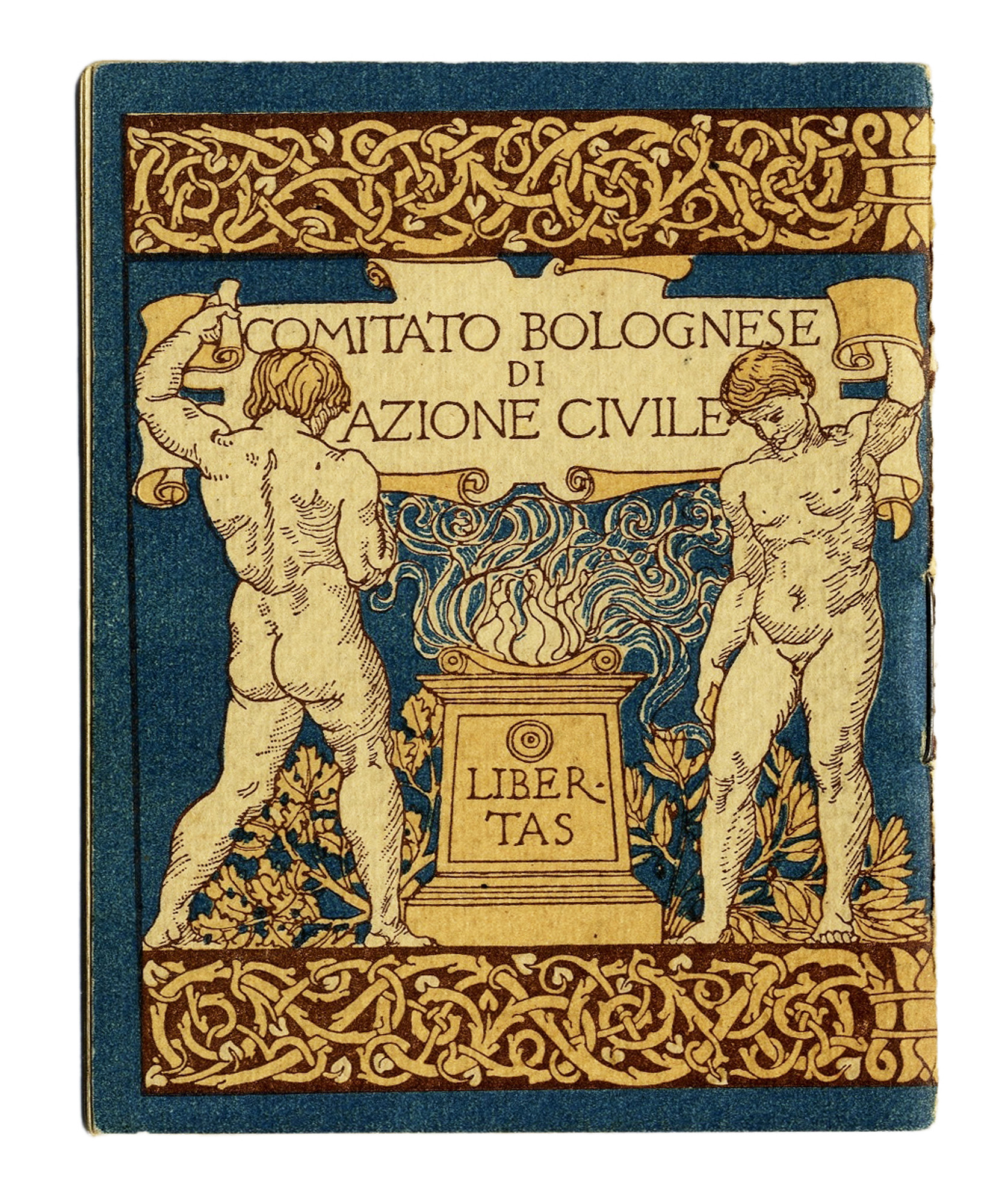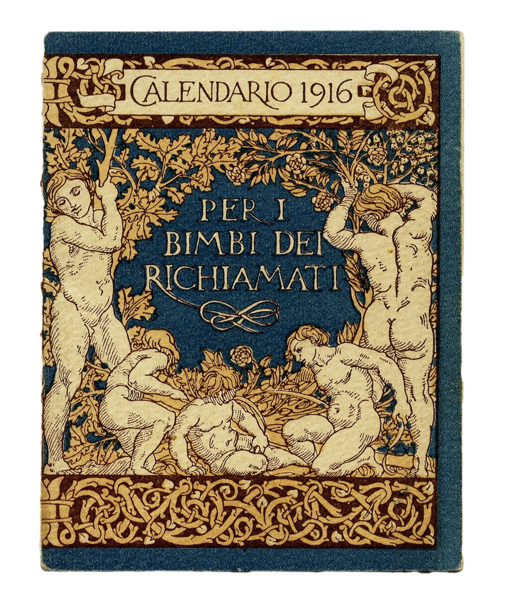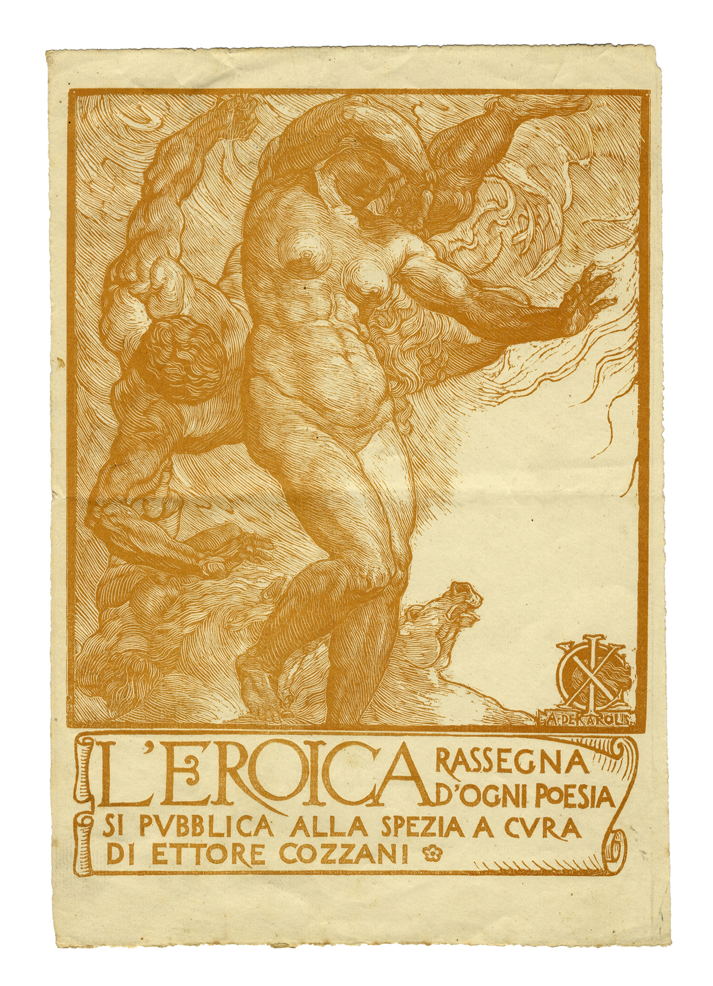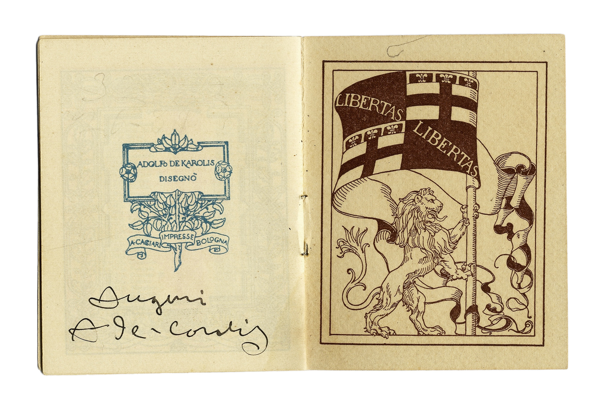 1) De Carolis D., Senza titolo (prova di stampa). Xilografia a 4 legni su velina applicata su carta spessa di supporto. mm 135x345. Firma a matita in basso a destra. 2) De Carolis A., L'eroica, prova di stampa per copertina. Xilografia. mm 253x187. Foglio: mm 290x200. Monogramma e firma in lastra in basso a destra. 3) De Carolis A., Per i bimbi dei richiamati. 1916. Piccolo calendario xilografico. mm 95x75 (chiuso). Grazioso opuscolo interamente illustrato con ricchi decori xilografici, testi poetici e stemmi. Datato e firmato ai piatti in lastra. Iscrizione e firma autografa a penna e inchiostro di china bruno al colophon. Nella doppia pagina centrale è stampata, in miniatura, la xilografia Madrepatria. SI AGGIUNGE: Servolini L., Sul padule. 1930-32. Xilografia. mm 145x150. Foglio: 375x330 (aperto). Firma e data in lastra in basso a sinistra. Titolo a matita in basso a sinistra. Controfirma, data e dedica a Hortensia Morici a matita in basso a destra. (4) Opera 1: Foglio privo di margini. Strappetti e mancanze varie. Buona conservazione. OPERA 2: Buona conservazione. OPERA 3: Ottima conservazione. Raro.