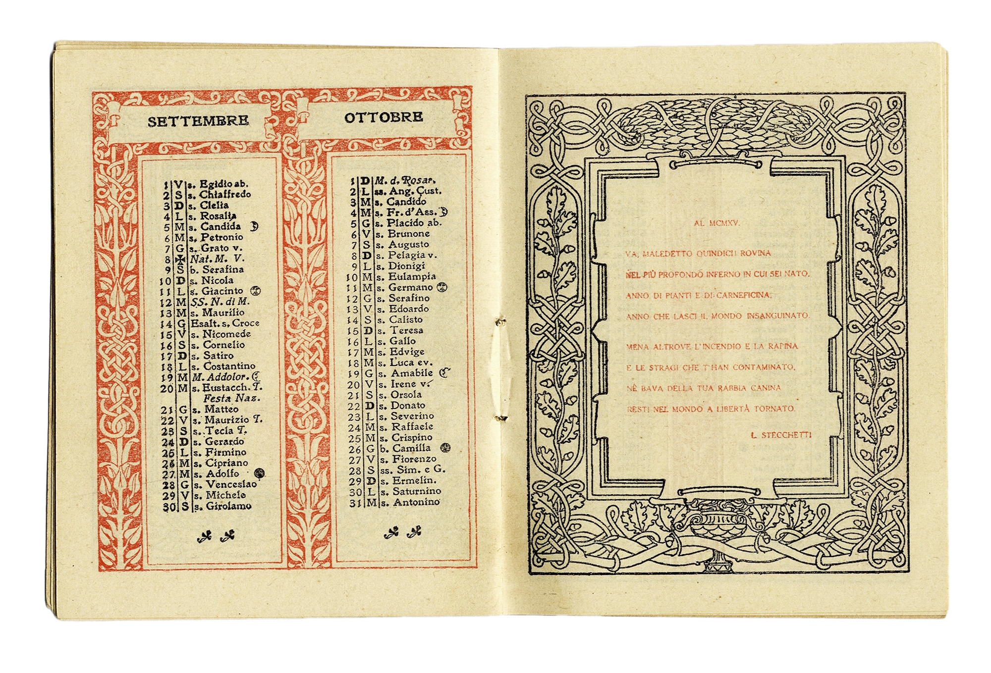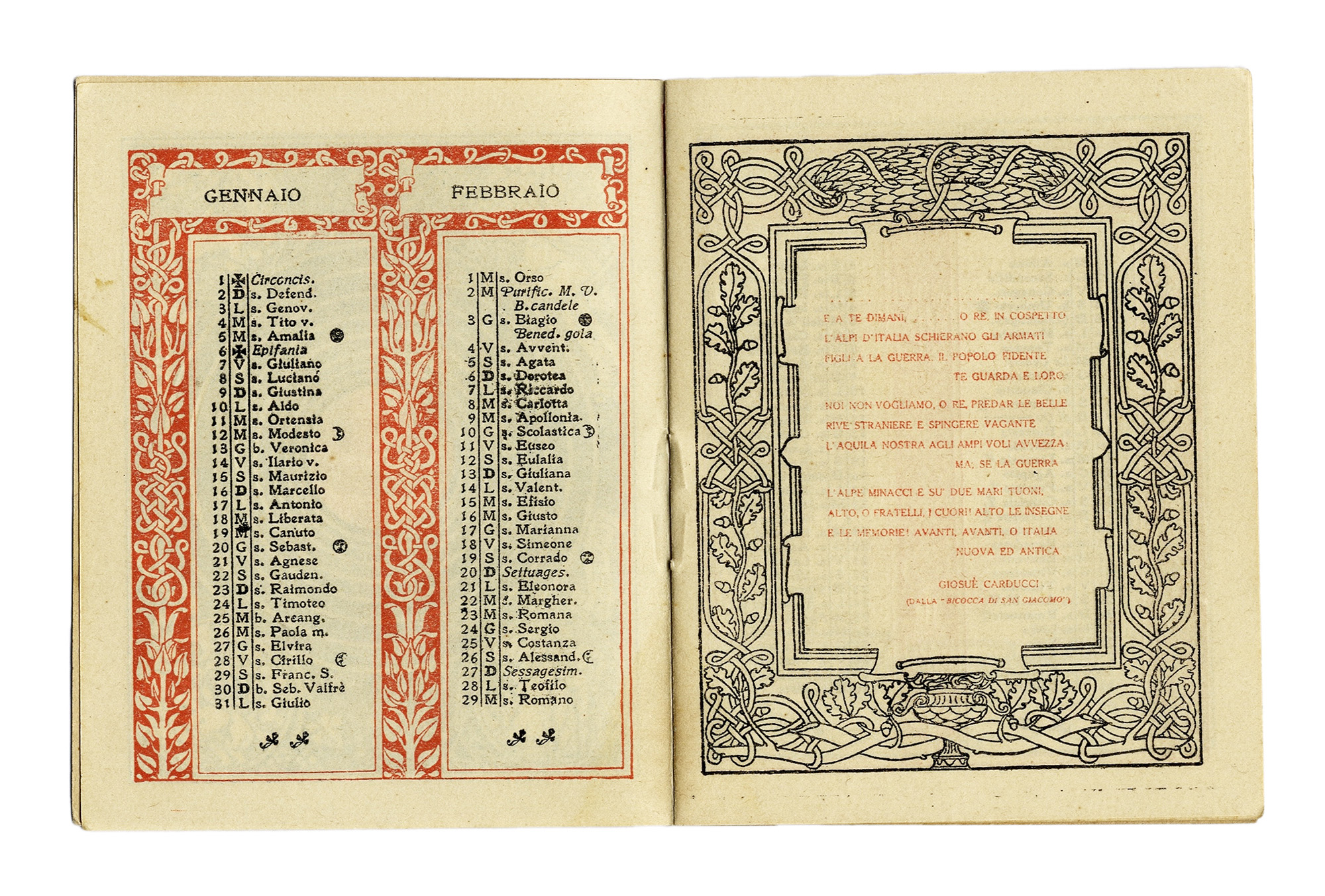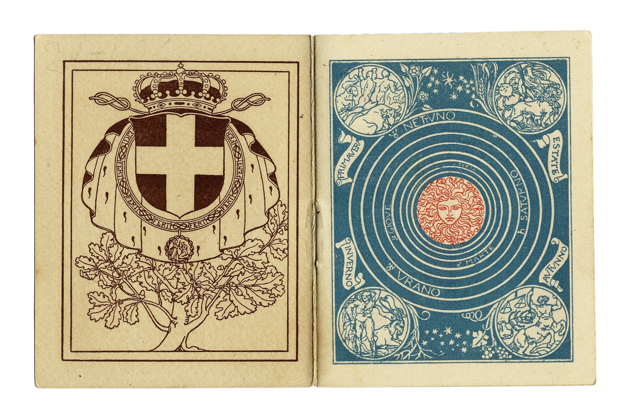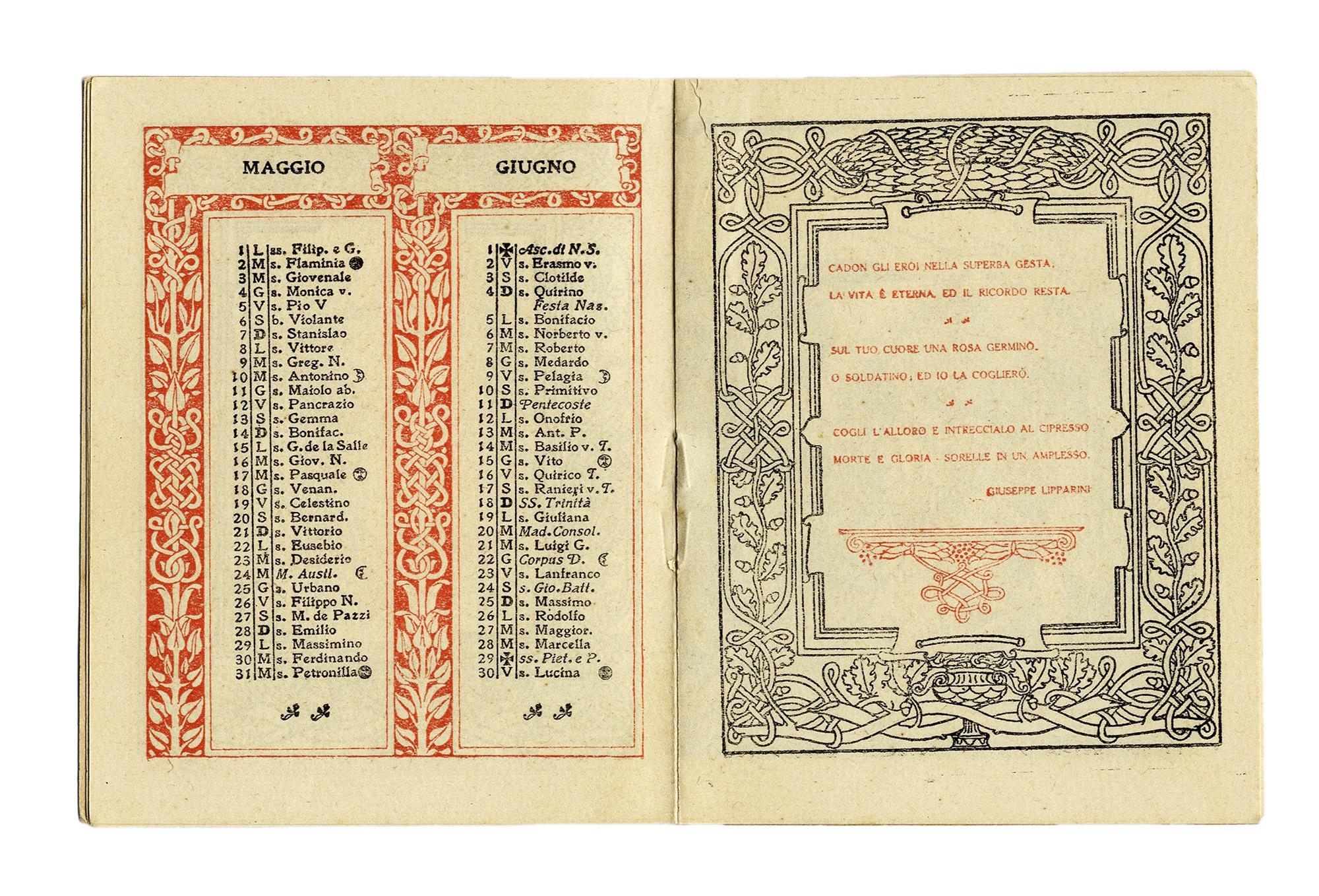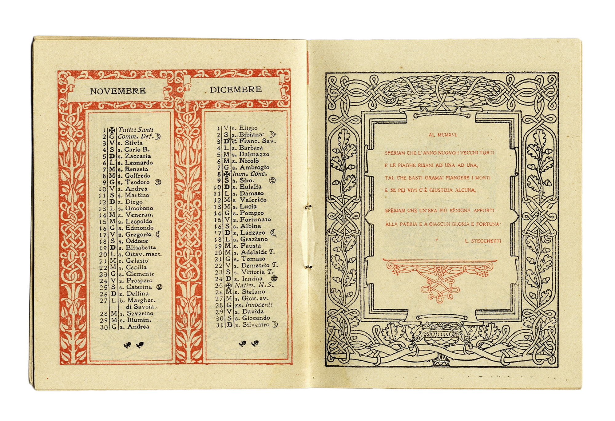 1) De Carolis D., Senza titolo (prova di stampa). Xilografia a 4 legni su velina applicata su carta spessa di supporto. mm 135x345. Firma a matita in basso a destra. 2) De Carolis A., L'eroica, prova di stampa per copertina. Xilografia. mm 253x187. Foglio: mm 290x200. Monogramma e firma in lastra in basso a destra. 3) De Carolis A., Per i bimbi dei richiamati. 1916. Piccolo calendario xilografico. mm 95x75 (chiuso). Grazioso opuscolo interamente illustrato con ricchi decori xilografici, testi poetici e stemmi. Datato e firmato ai piatti in lastra. Iscrizione e firma autografa a penna e inchiostro di china bruno al colophon. Nella doppia pagina centrale è stampata, in miniatura, la xilografia Madrepatria. SI AGGIUNGE: Servolini L., Sul padule. 1930-32. Xilografia. mm 145x150. Foglio: 375x330 (aperto). Firma e data in lastra in basso a sinistra. Titolo a matita in basso a sinistra. Controfirma, data e dedica a Hortensia Morici a matita in basso a destra. (4) Opera 1: Foglio privo di margini. Strappetti e mancanze varie. Buona conservazione. OPERA 2: Buona conservazione. OPERA 3: Ottima conservazione. Raro.