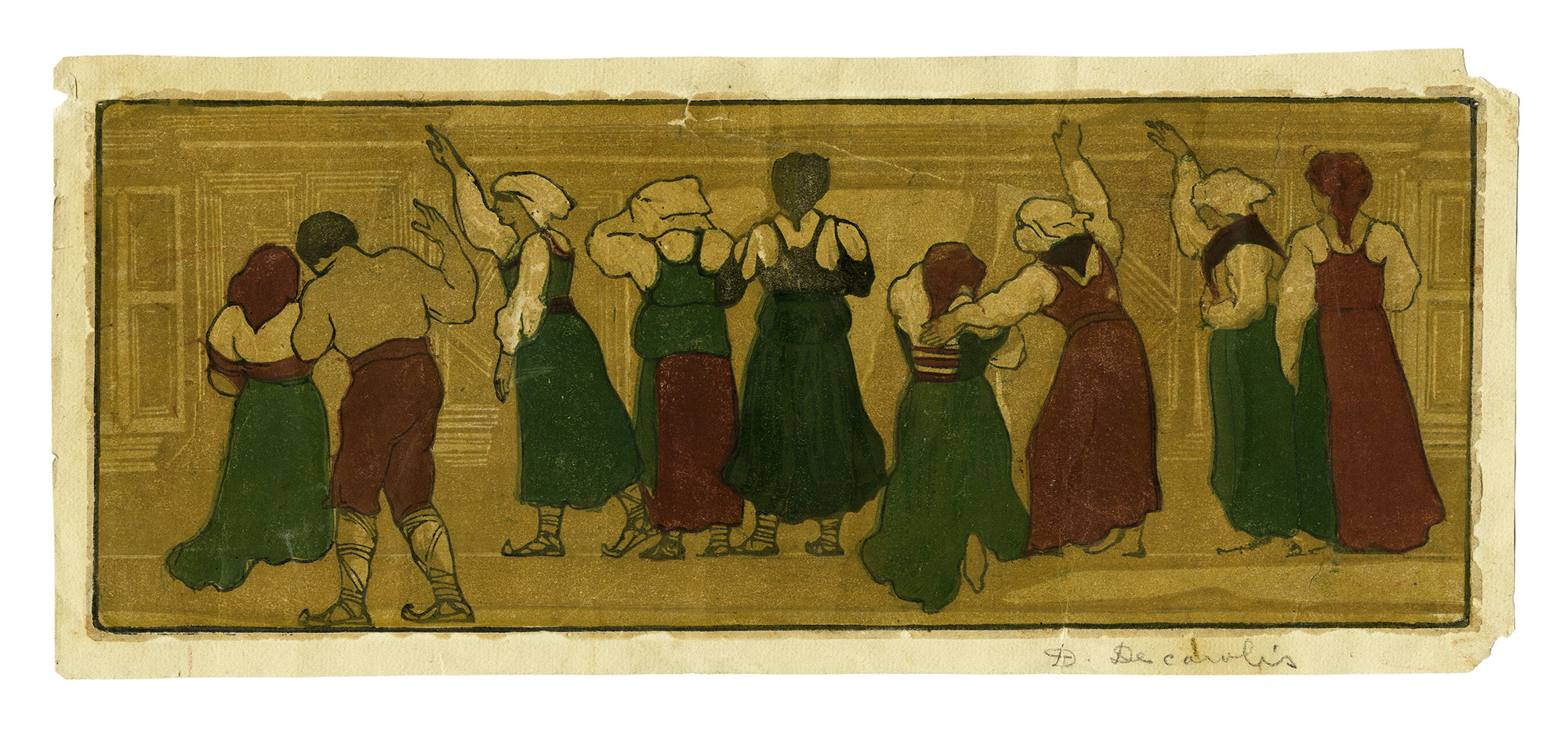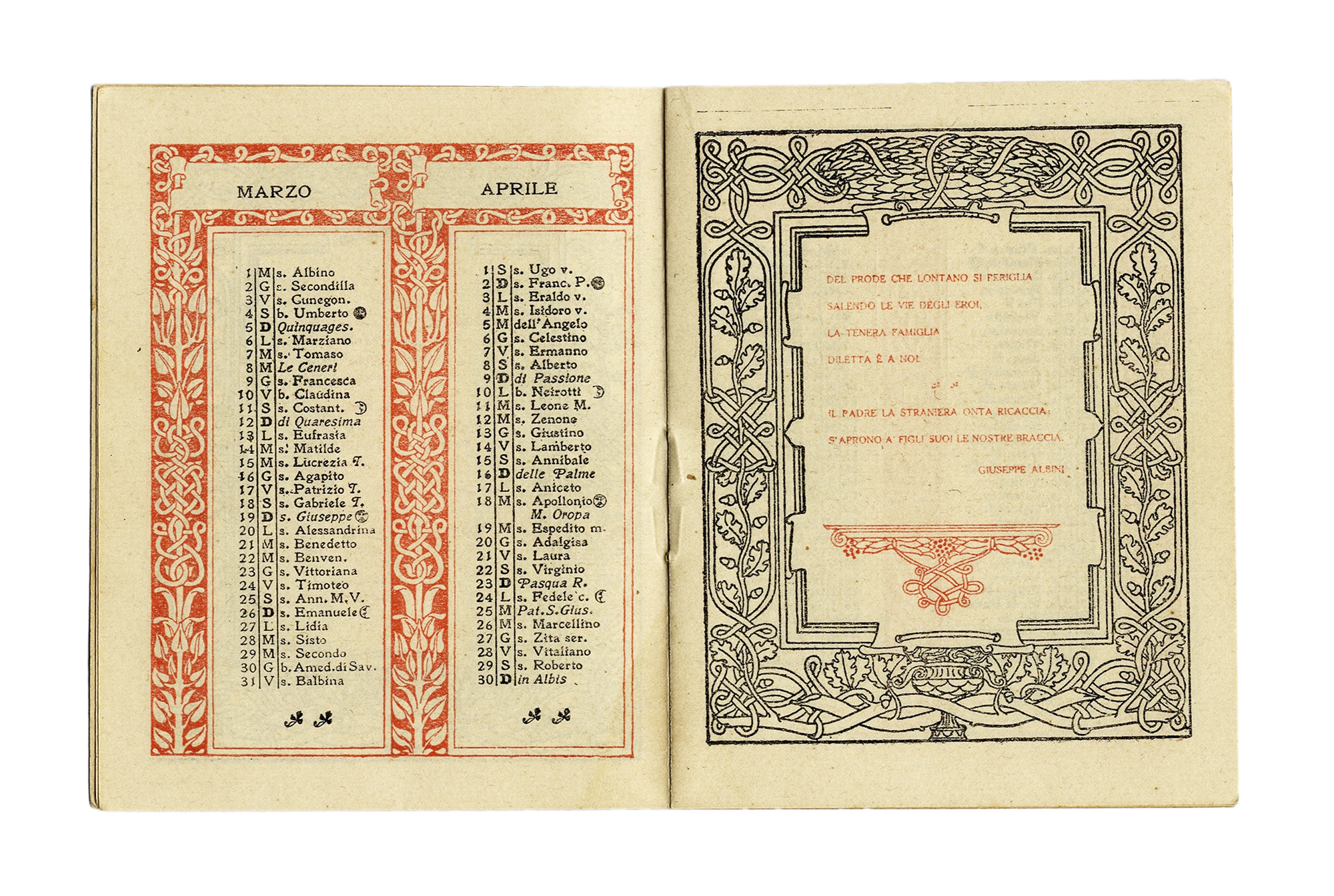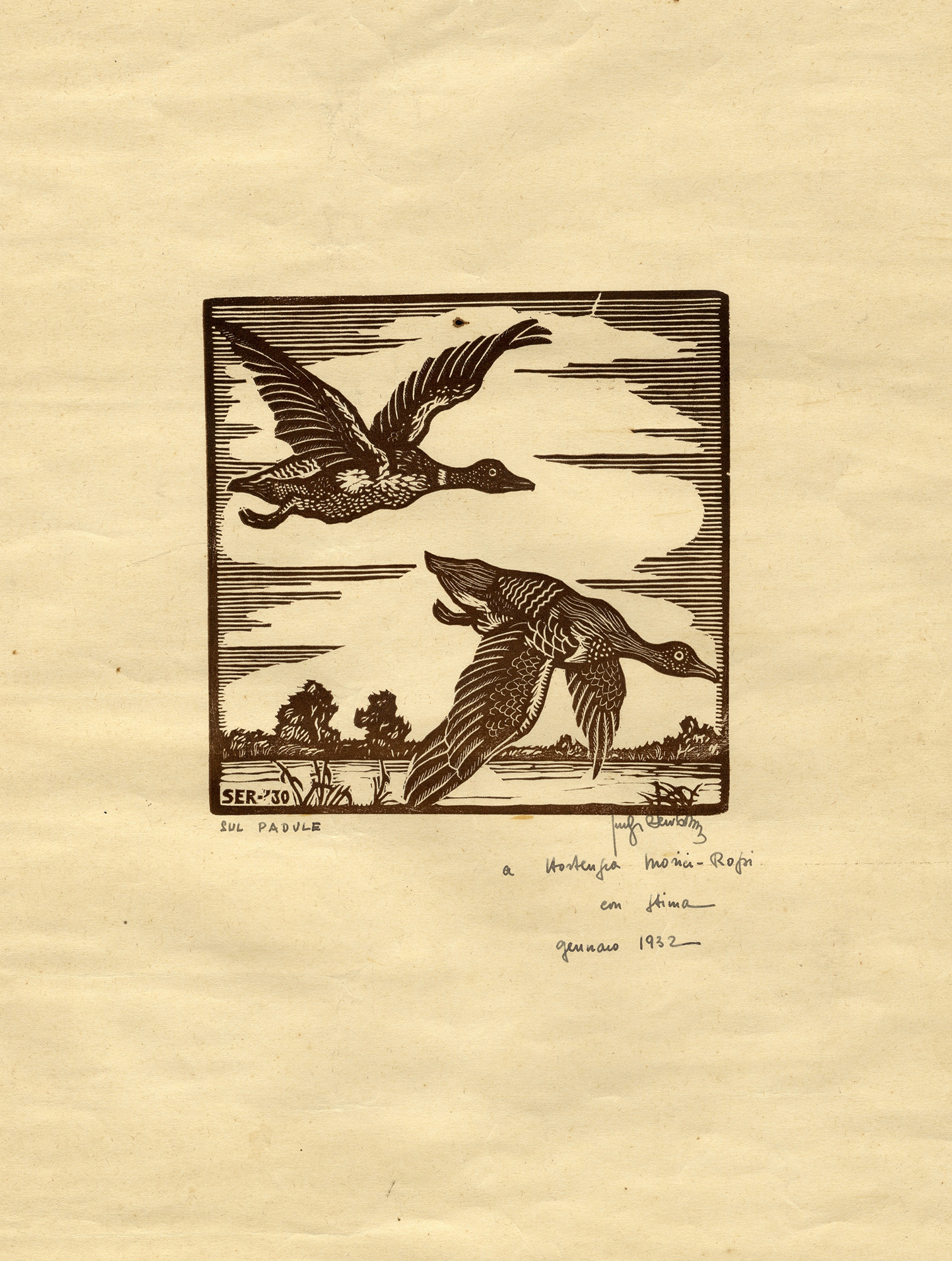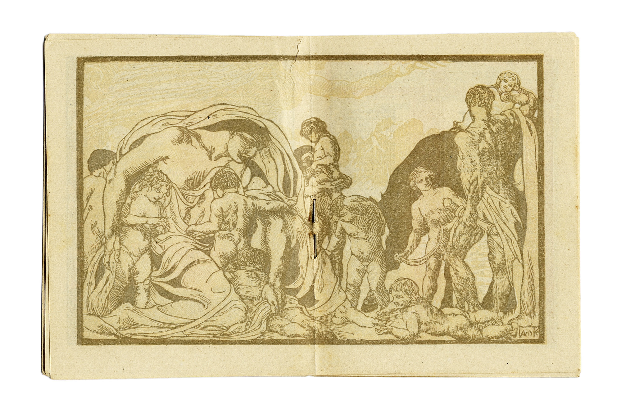 1) De Carolis D., Senza titolo (prova di stampa). Xilografia a 4 legni su velina applicata su carta spessa di supporto. mm 135x345. Firma a matita in basso a destra. 2) De Carolis A., L'eroica, prova di stampa per copertina. Xilografia. mm 253x187. Foglio: mm 290x200. Monogramma e firma in lastra in basso a destra. 3) De Carolis A., Per i bimbi dei richiamati. 1916. Piccolo calendario xilografico. mm 95x75 (chiuso). Grazioso opuscolo interamente illustrato con ricchi decori xilografici, testi poetici e stemmi. Datato e firmato ai piatti in lastra. Iscrizione e firma autografa a penna e inchiostro di china bruno al colophon. Nella doppia pagina centrale è stampata, in miniatura, la xilografia Madrepatria. SI AGGIUNGE: Servolini L., Sul padule. 1930-32. Xilografia. mm 145x150. Foglio: 375x330 (aperto). Firma e data in lastra in basso a sinistra. Titolo a matita in basso a sinistra. Controfirma, data e dedica a Hortensia Morici a matita in basso a destra. (4) Opera 1: Foglio privo di margini. Strappetti e mancanze varie. Buona conservazione. OPERA 2: Buona conservazione. OPERA 3: Ottima conservazione. Raro.